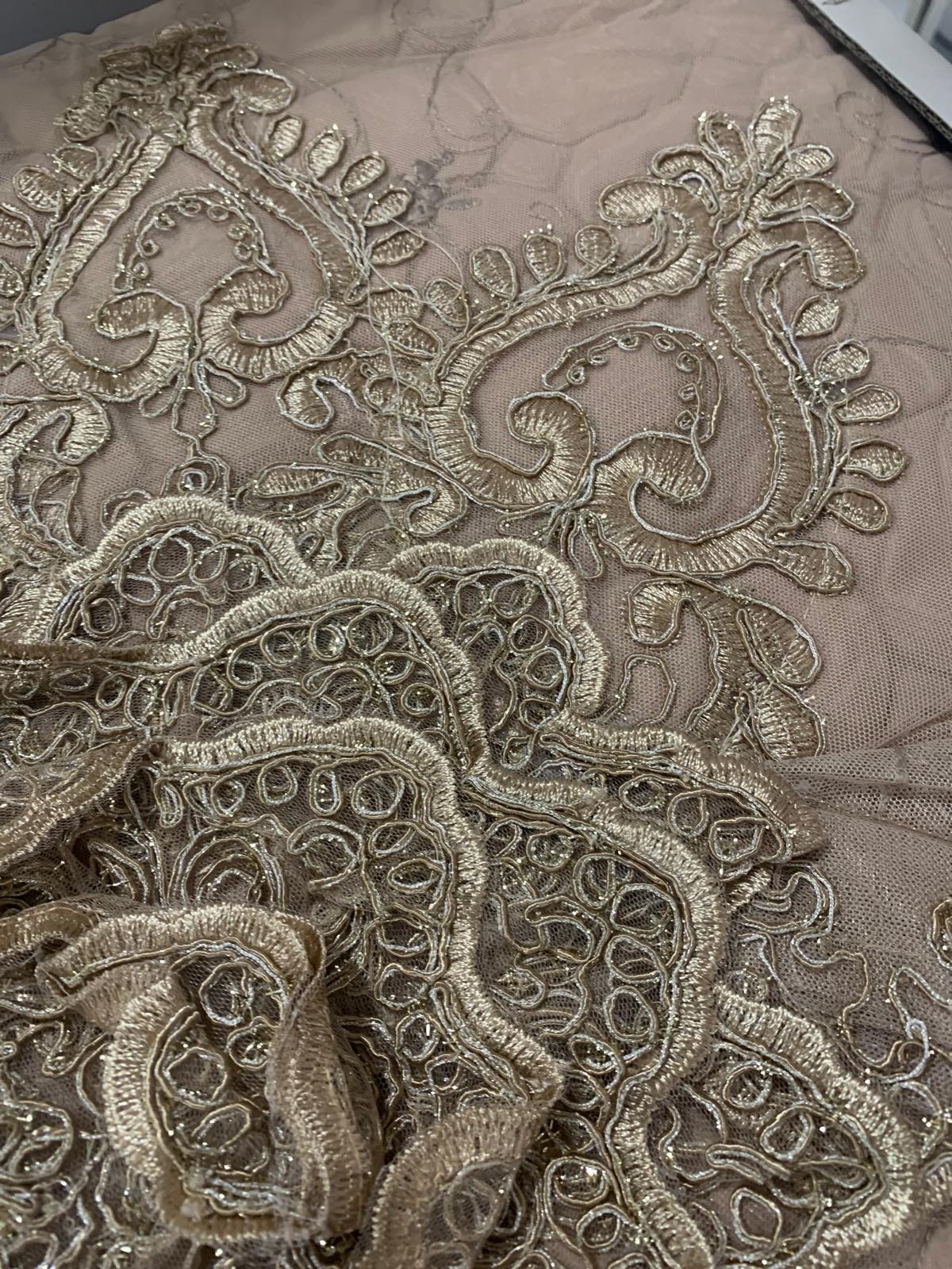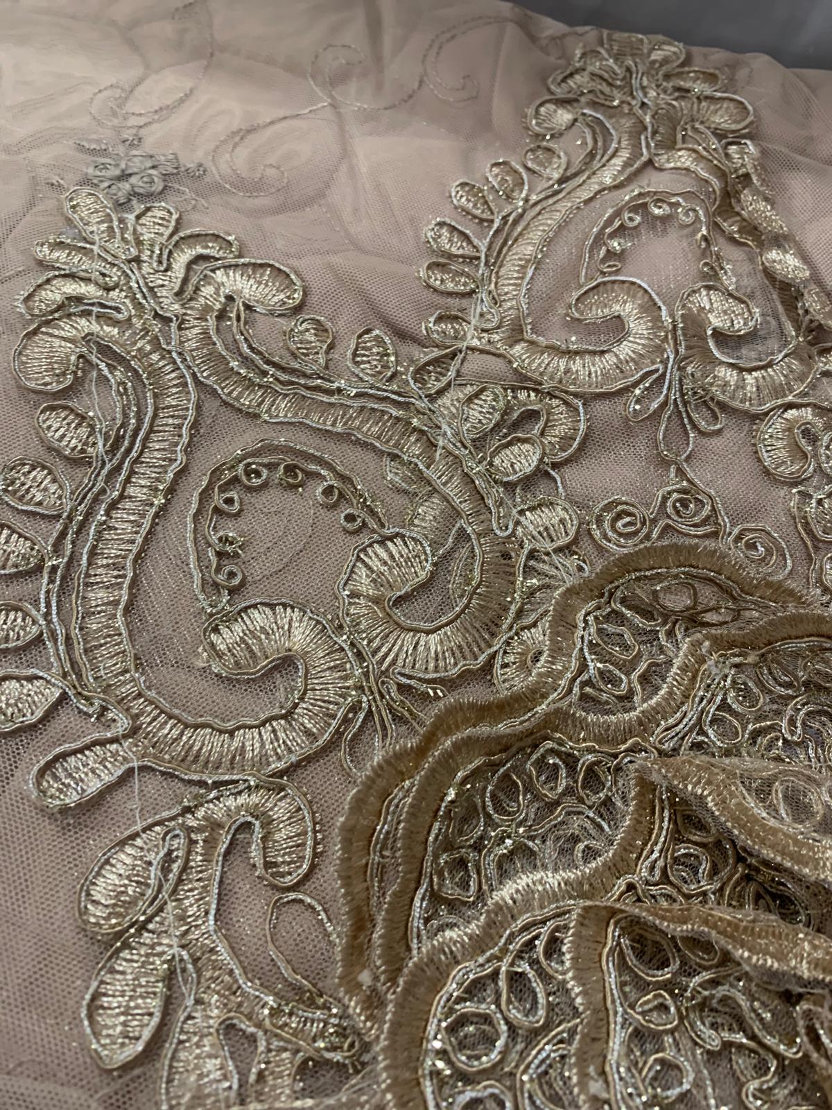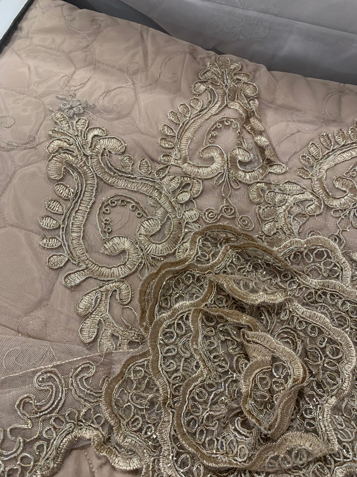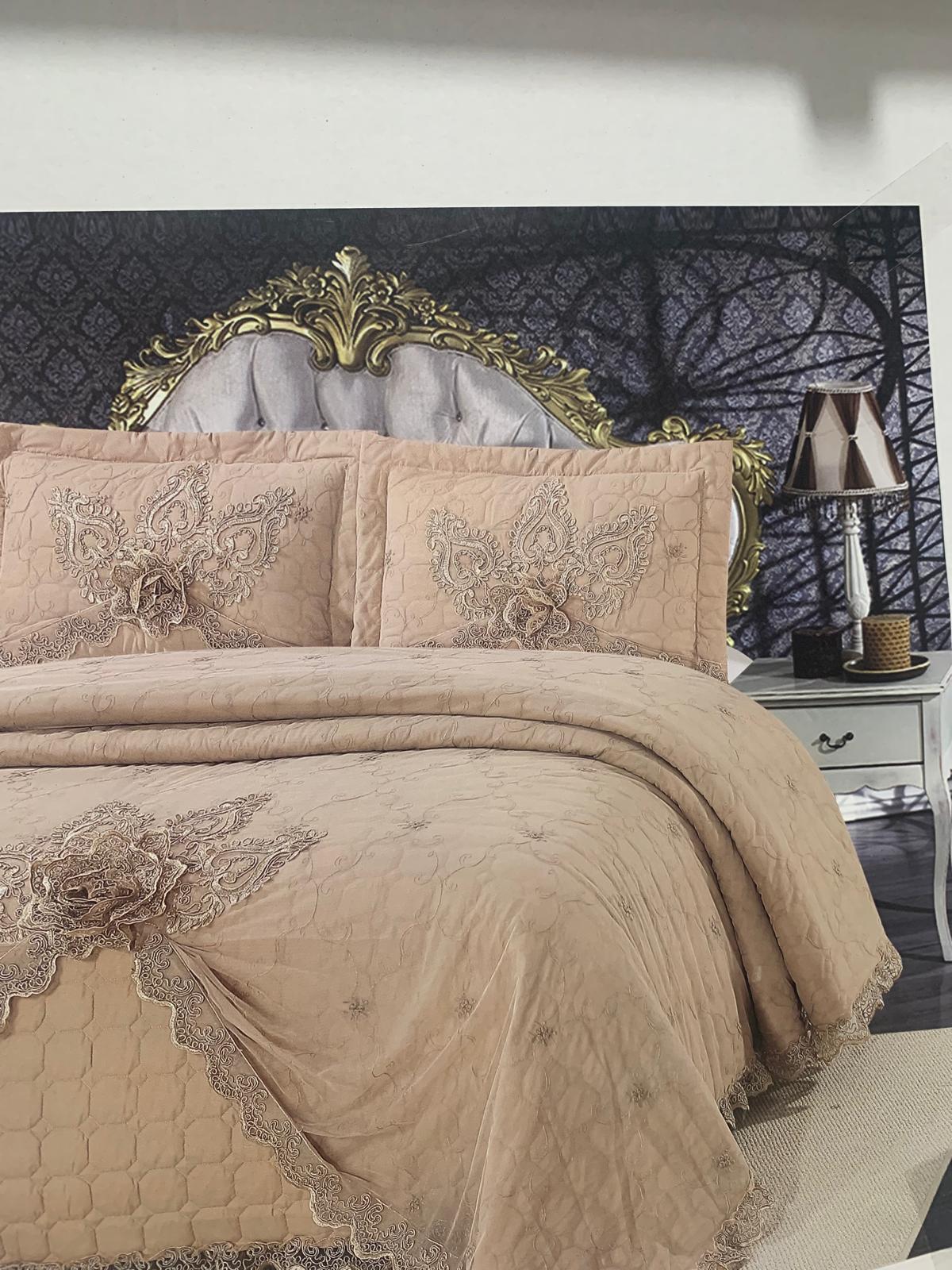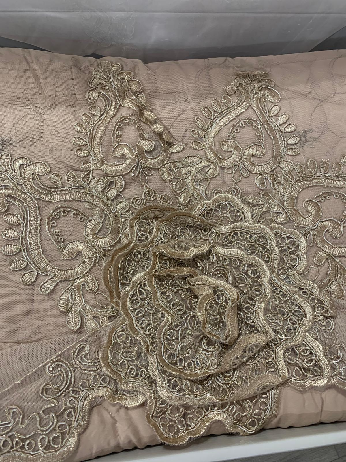Trapuntino elegante con pizzo rebrodè oro colore tortora con due guanciali