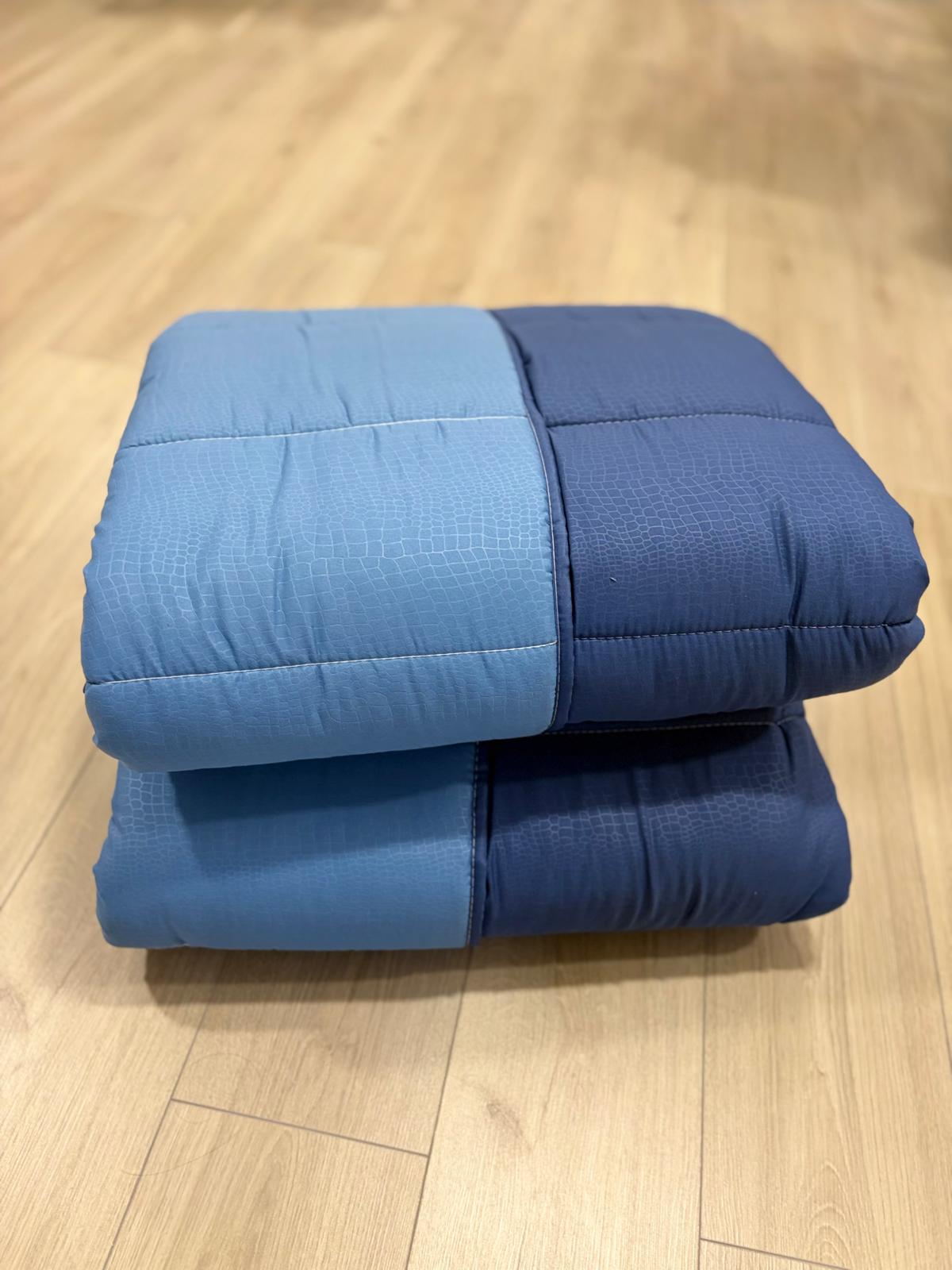 Trapunta matrimoniale invernale double face blu e celeste progettata per essere utilizzata da entrambi i lati offrendo la possibilità di cambiare l’aspetto del letto senza cambiare la trapunta.