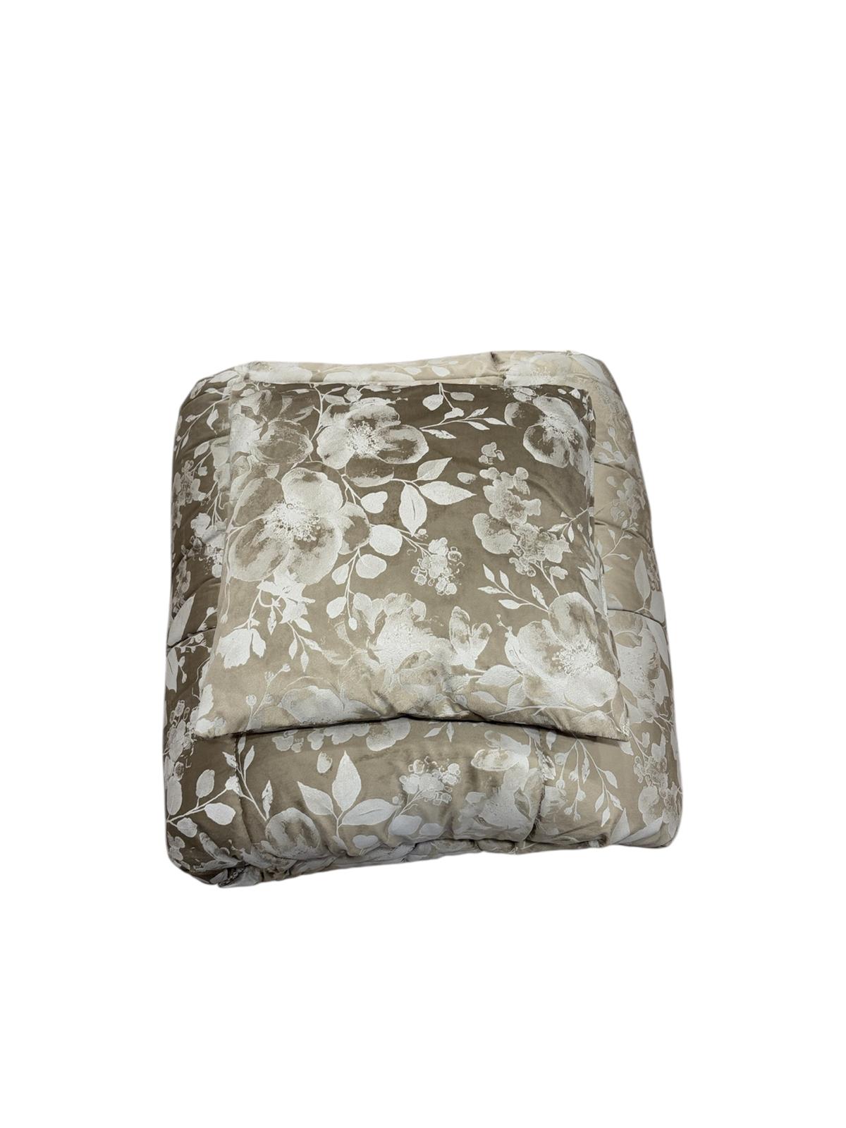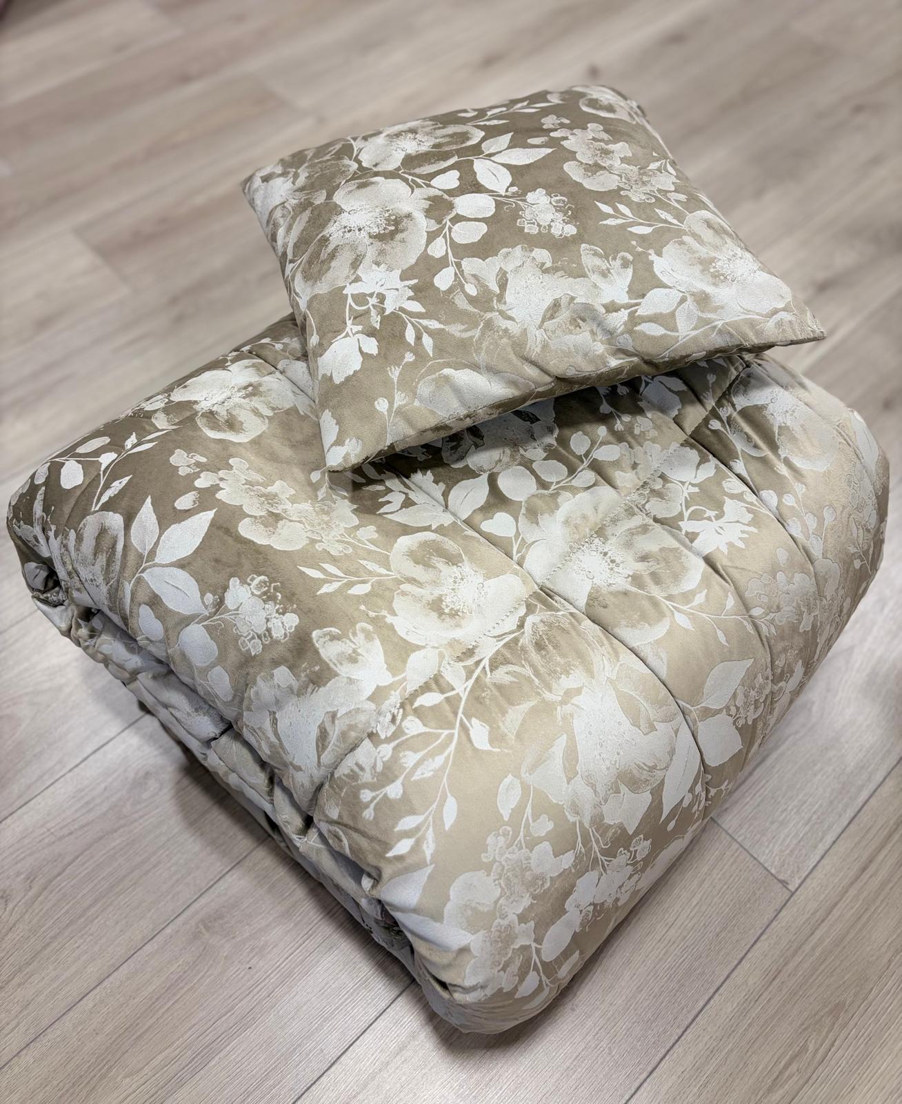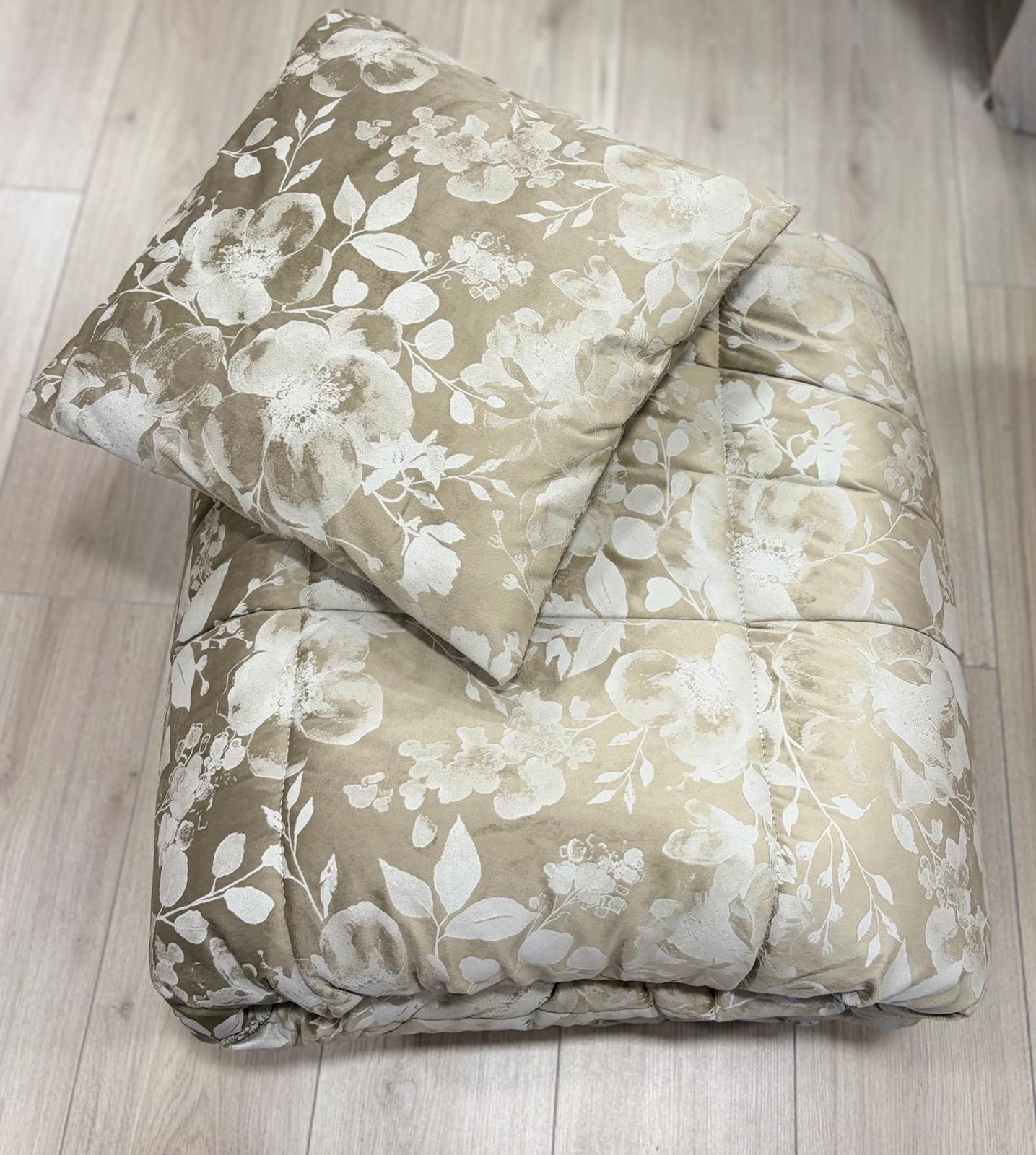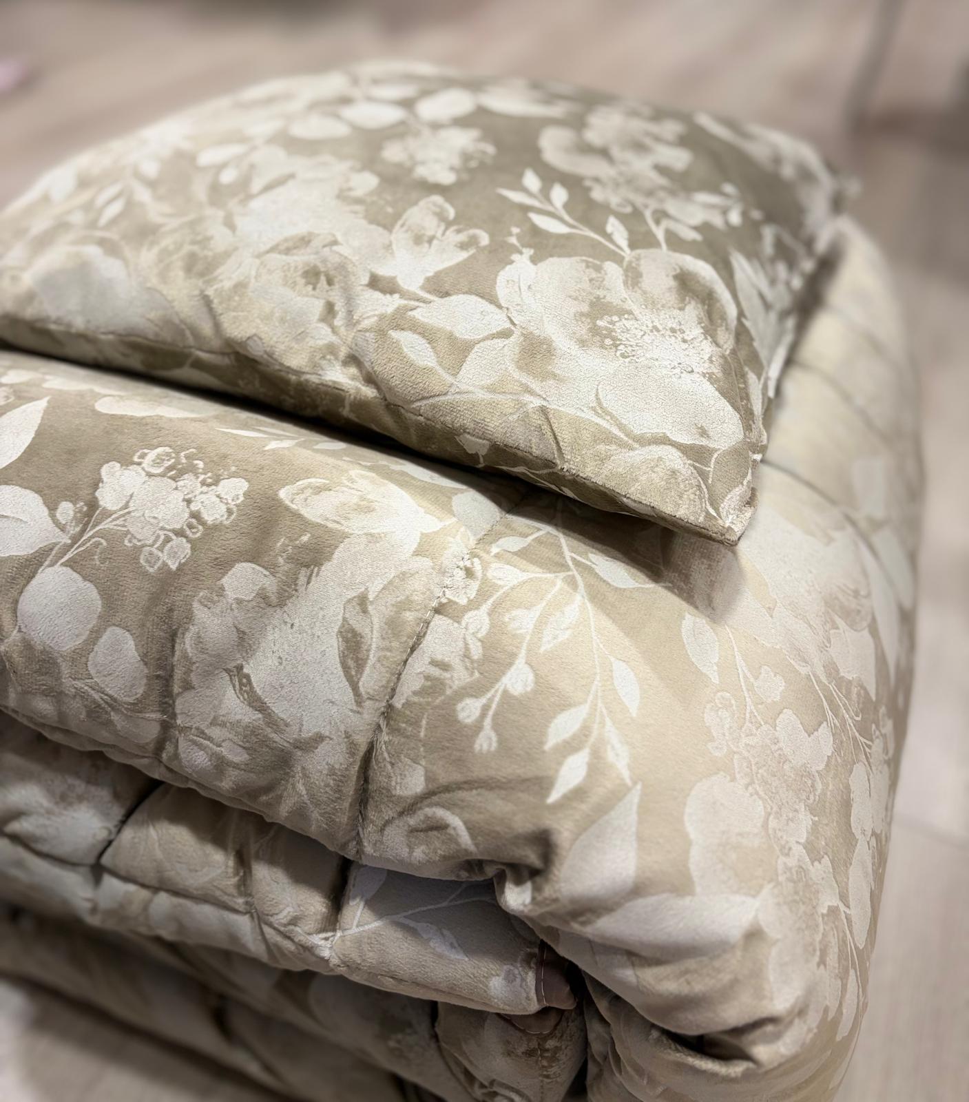 Trapunta matrimoniale invernale in velluto tortora con una stampa raffinata floreale tono su tono. Include cuscino coordinato.