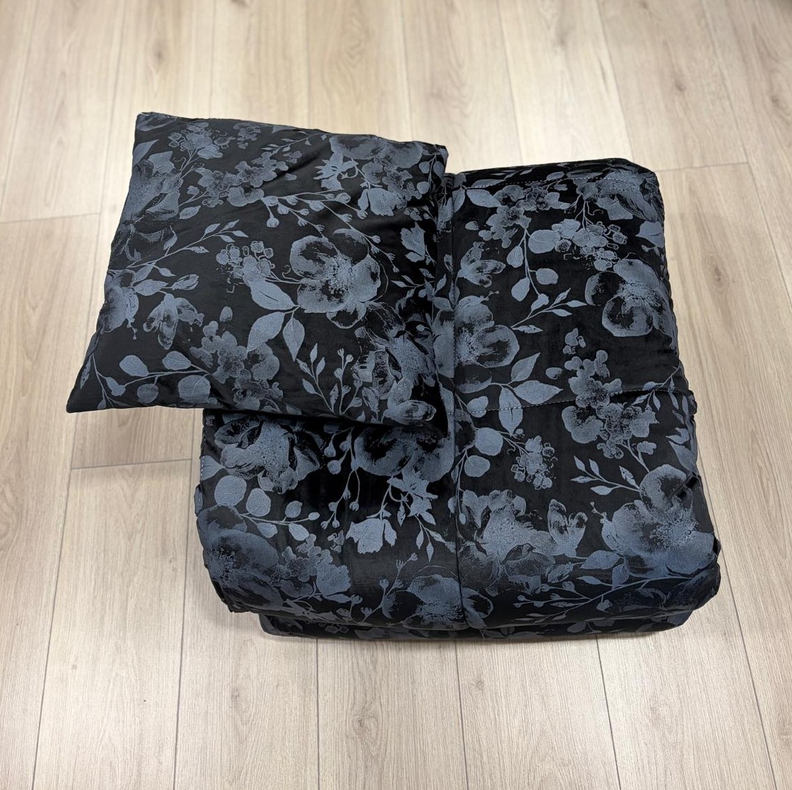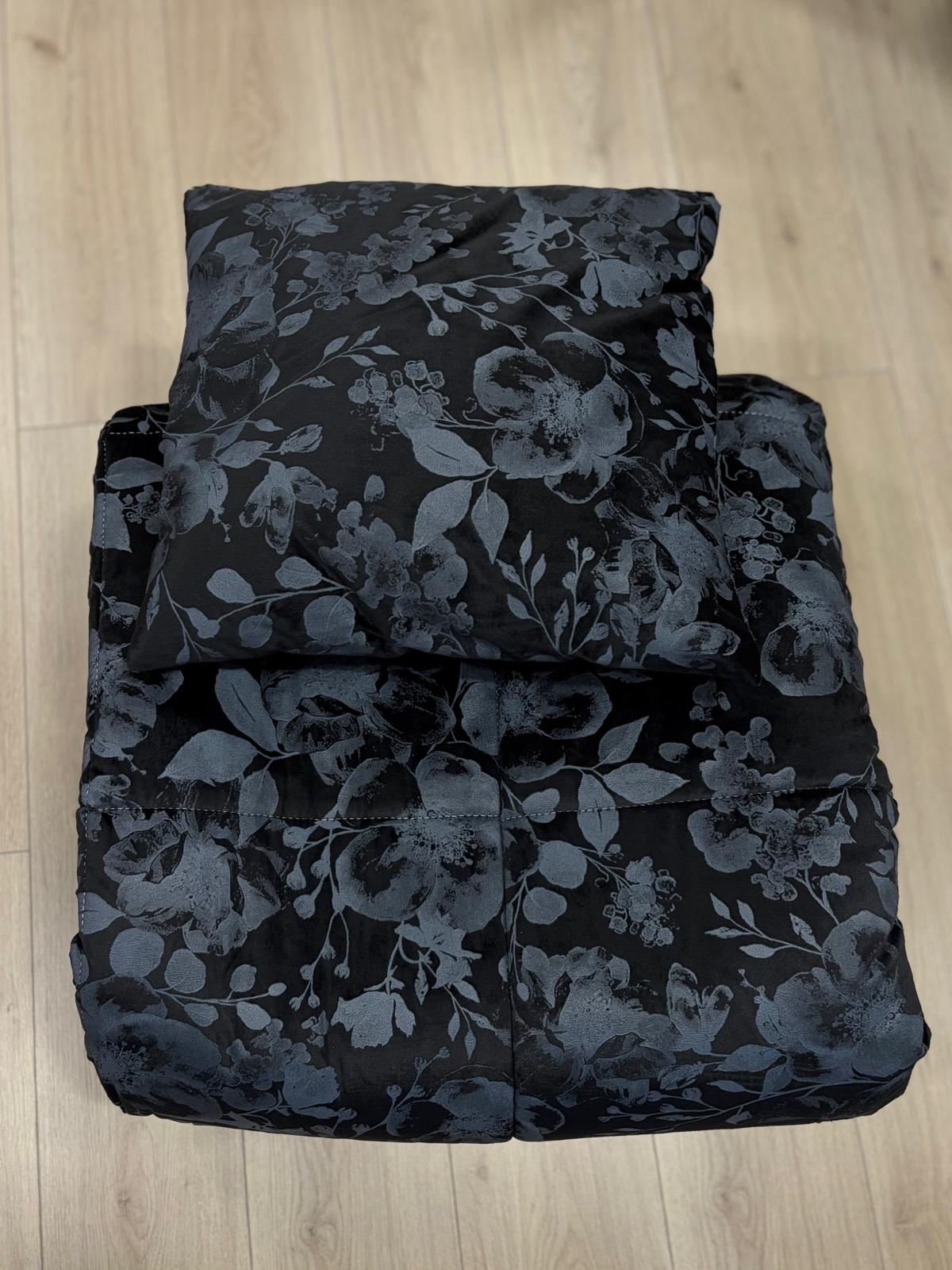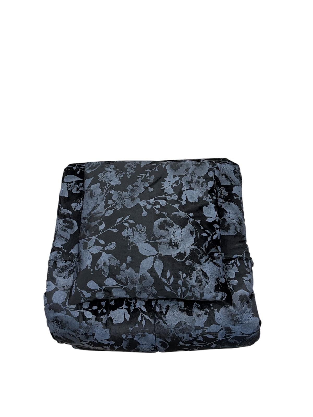 Trapunta matrimoniale invernale in velluto nera con una stampa raffinata floreale tono su tono. Include cuscino coordinato.