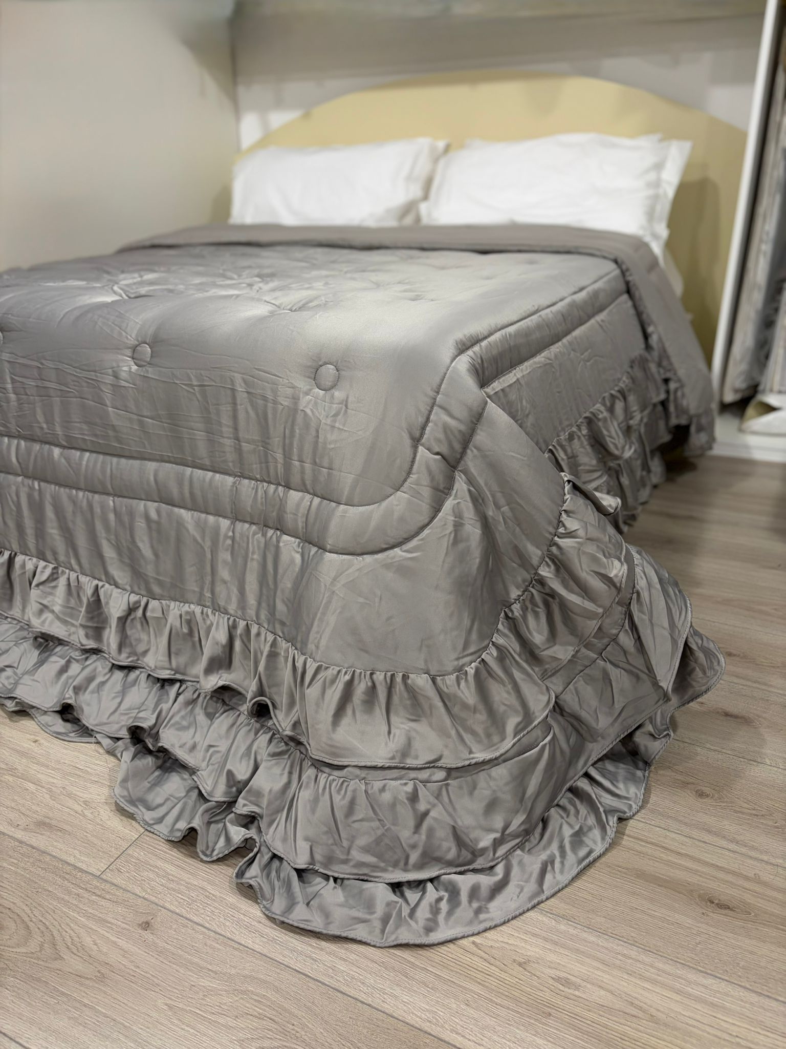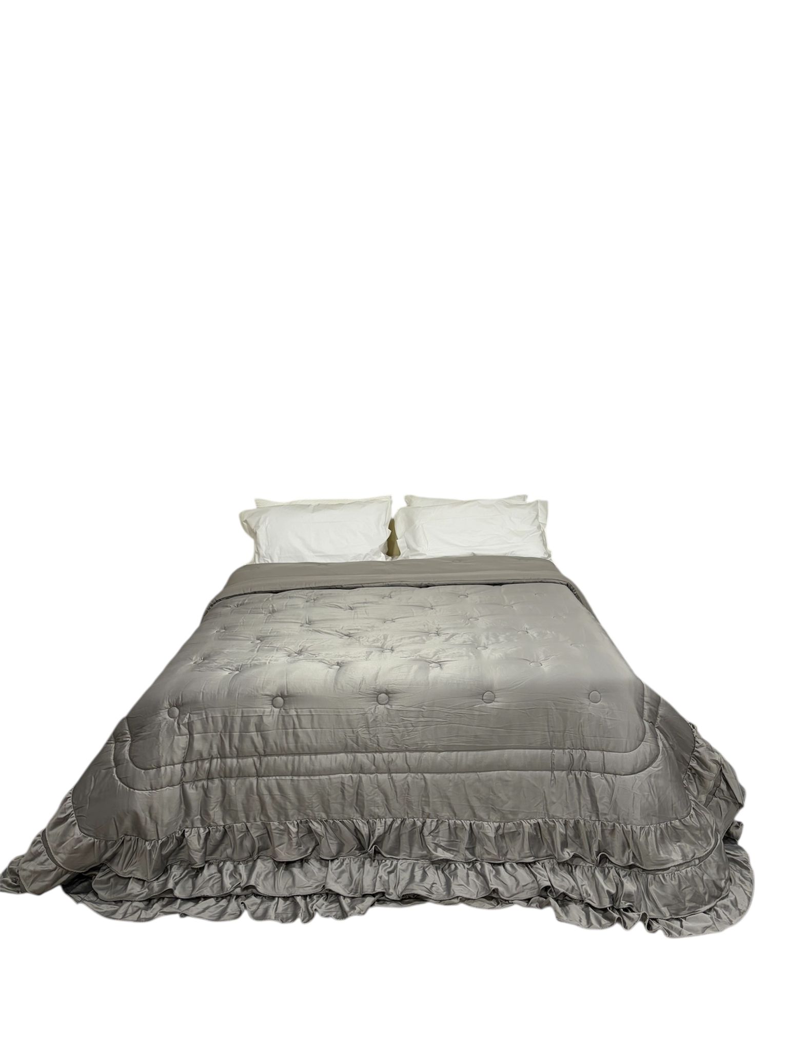 Trapunta matrimoniale invernale in raso grigia con finitura con volant.