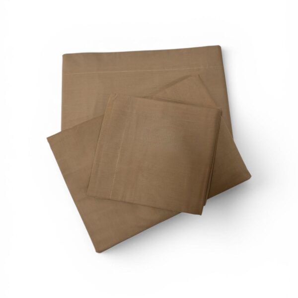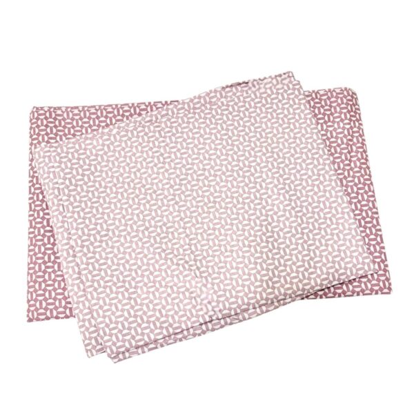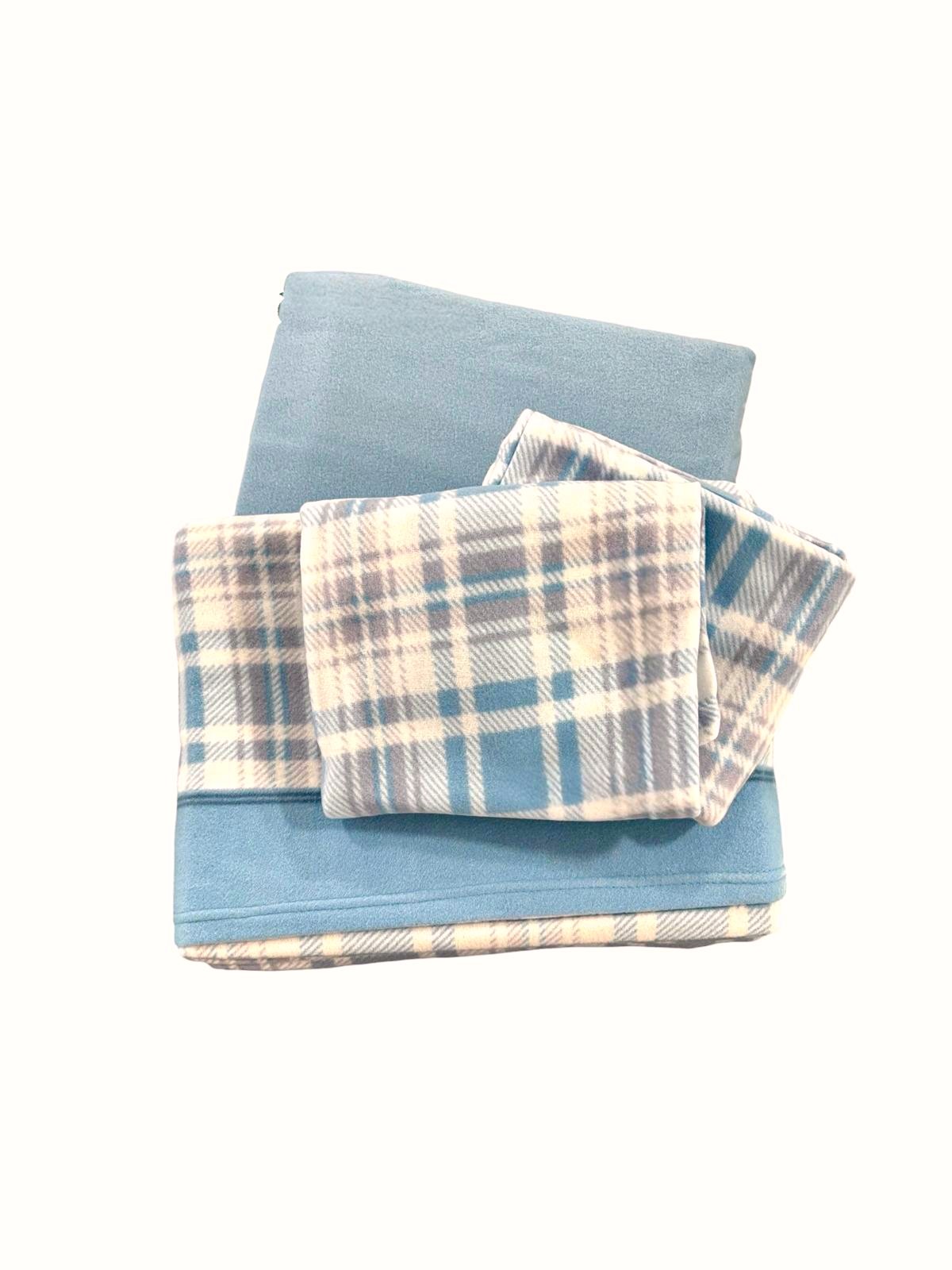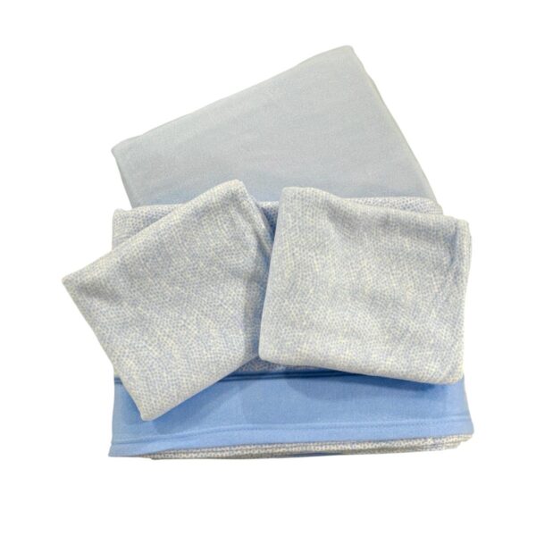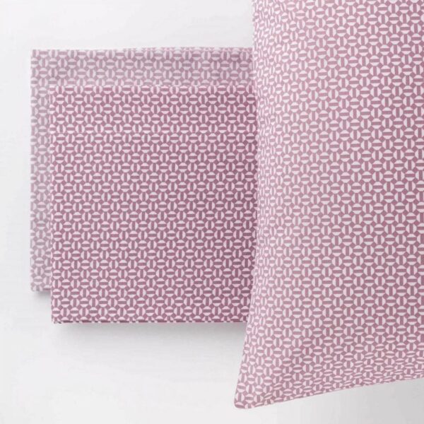 Completo letto matrimoniale composto da due lenzuola, una tinta unita e un’altra con stampa a quadroni, e da due federe in pail color carta da zucchero con stampa a quadroni.