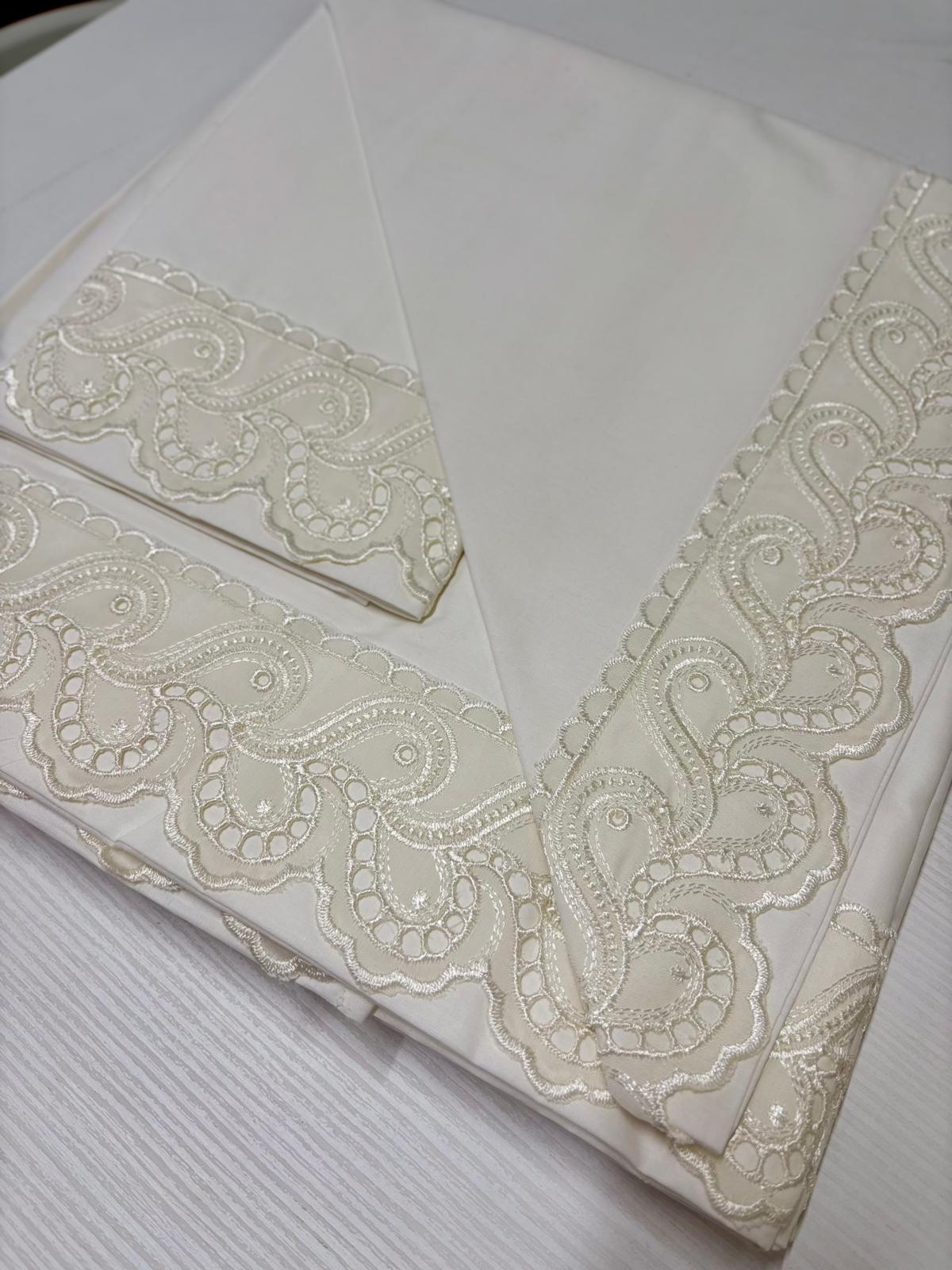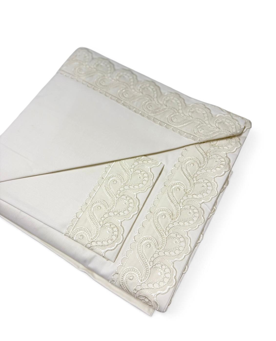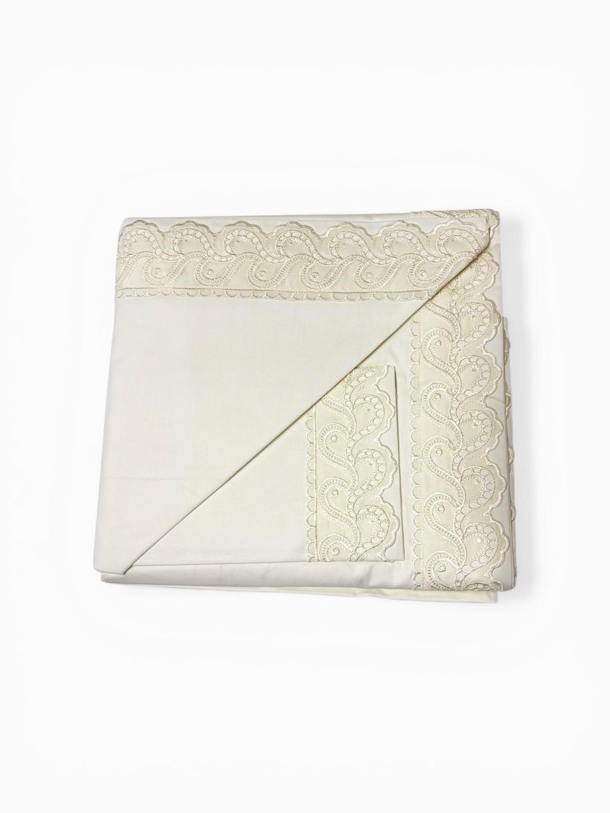 Completo letto matrimoniale avorio composto da: un copriletto avorio, un lenzuolo avorio con pizzo ricamato e da due federe coordinate. Lavorazione artigianale, 100% cotone.