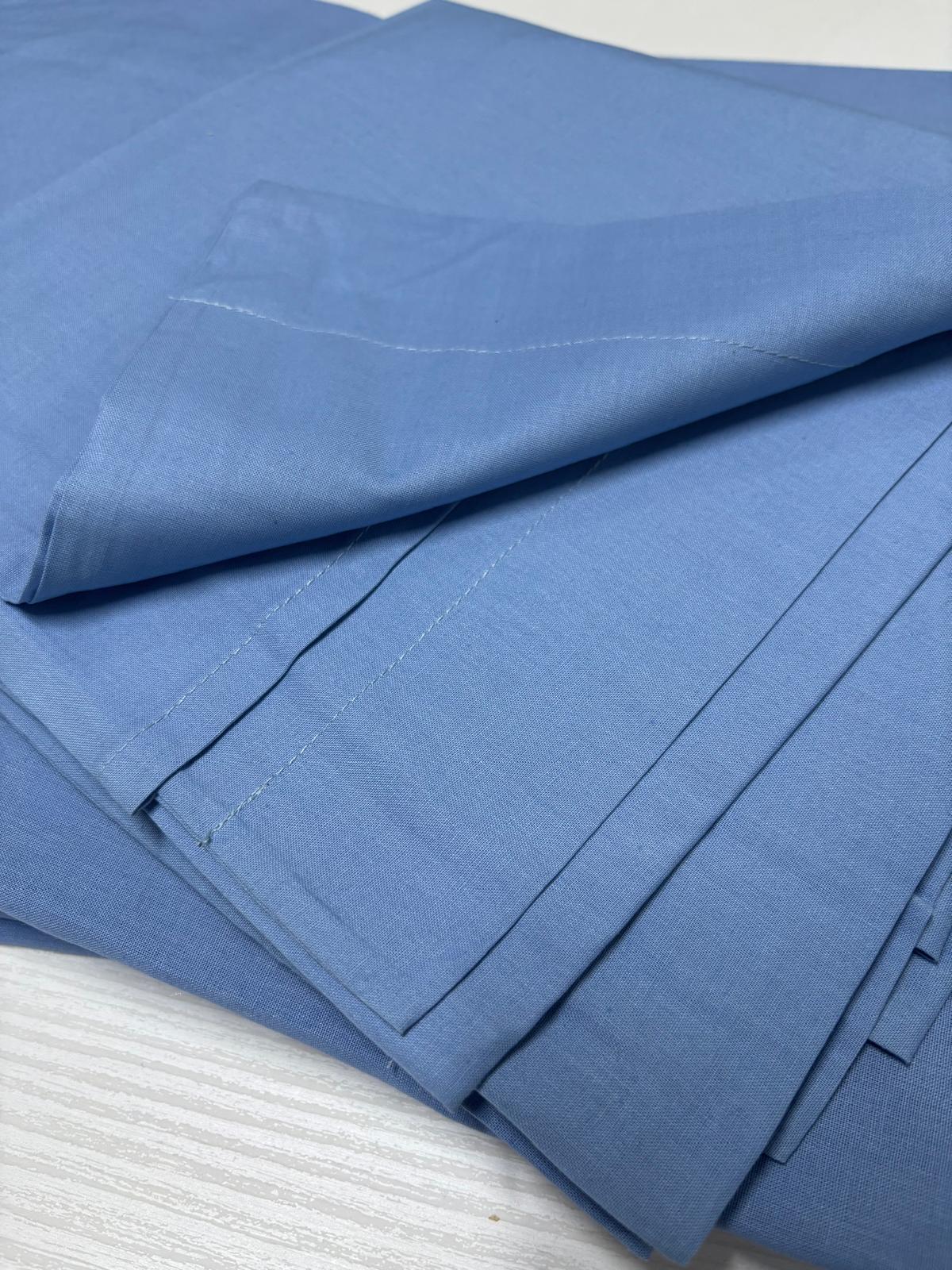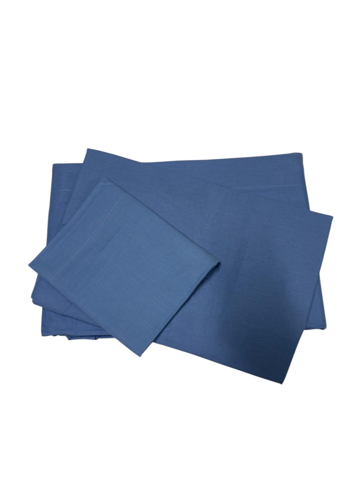 Completo letto matrimoniale composto da: un copriletto, un lenzuolo e da due federe per cuscini tinta unita azzurro. 100% cotone.