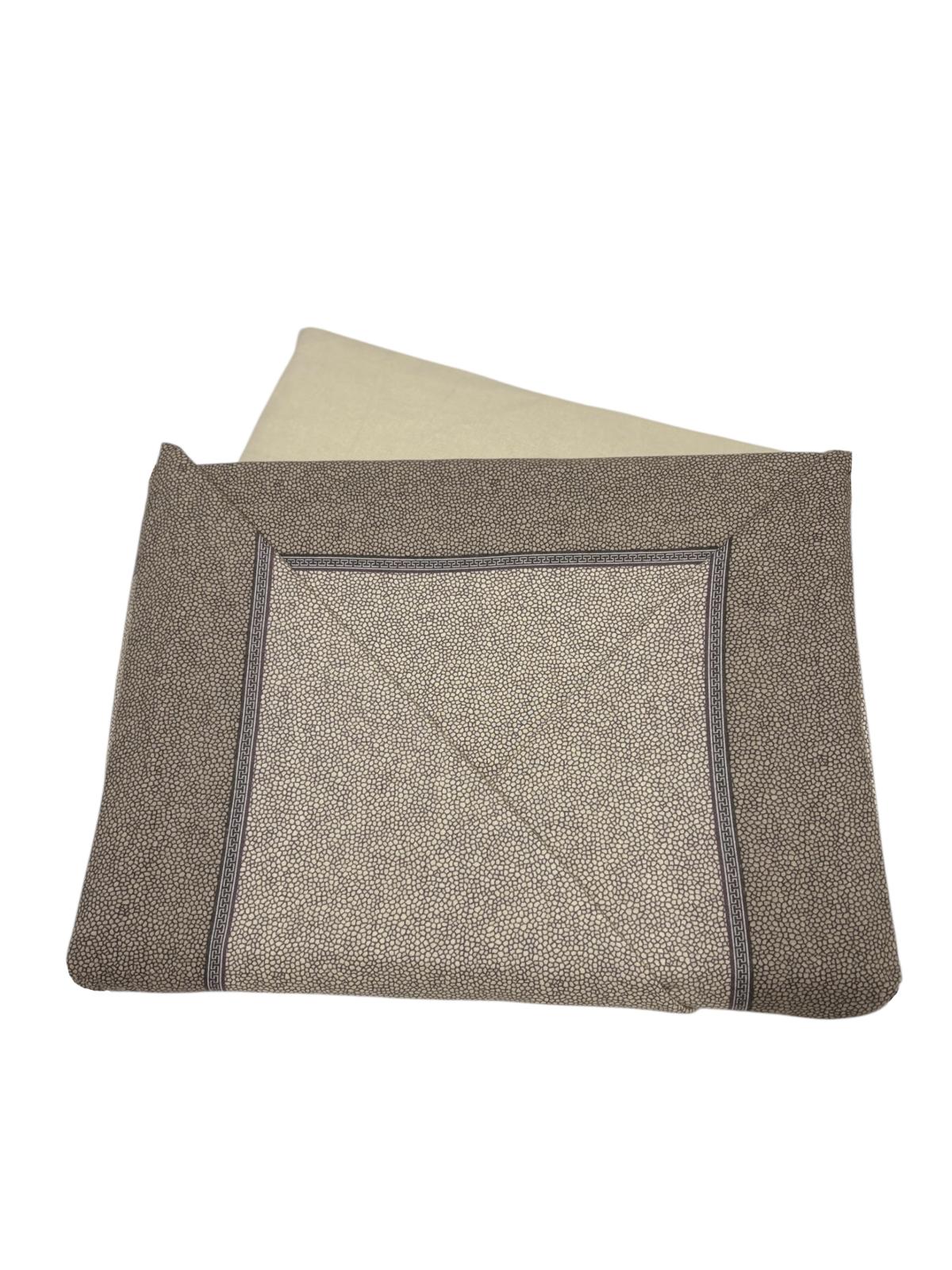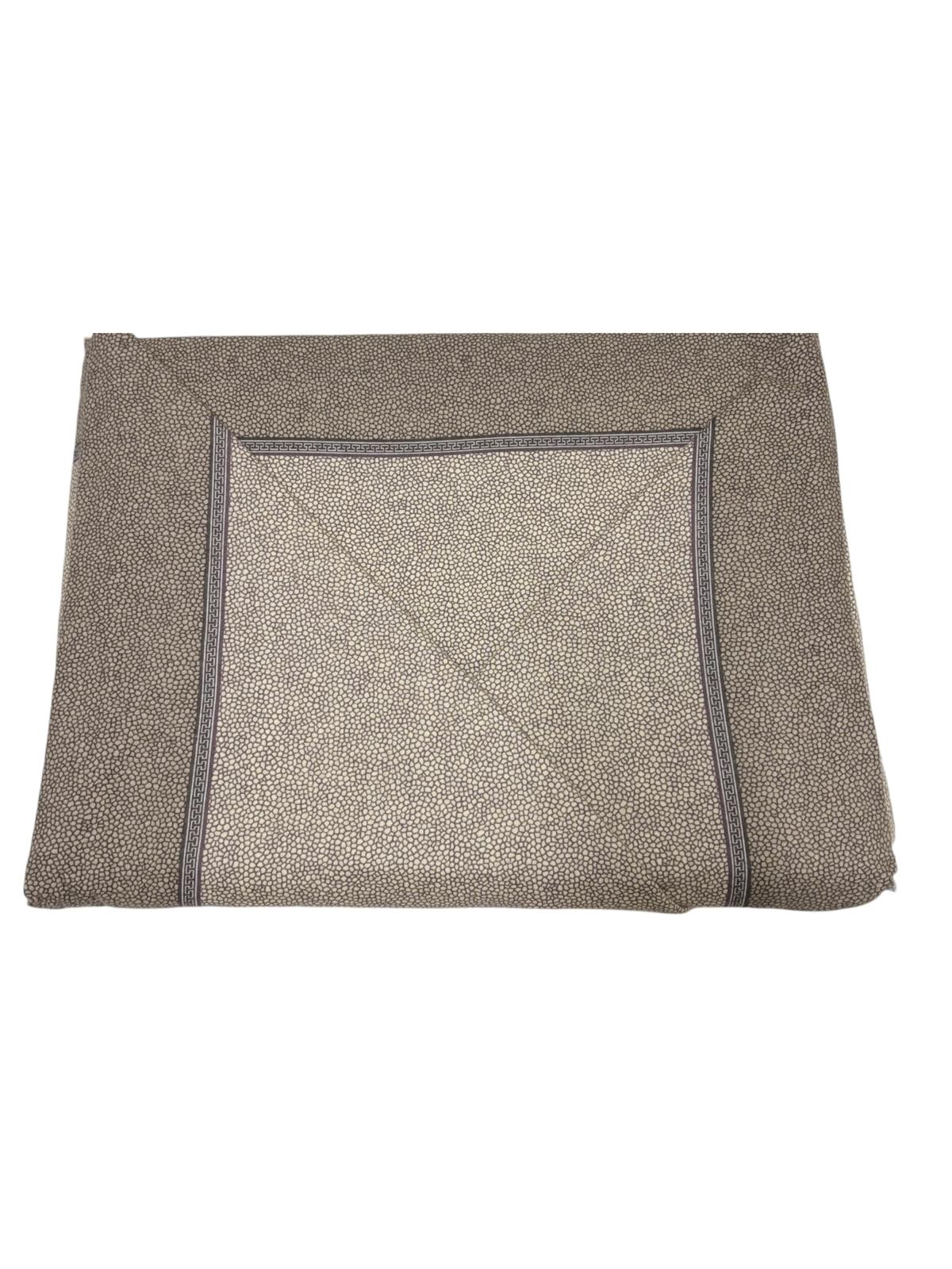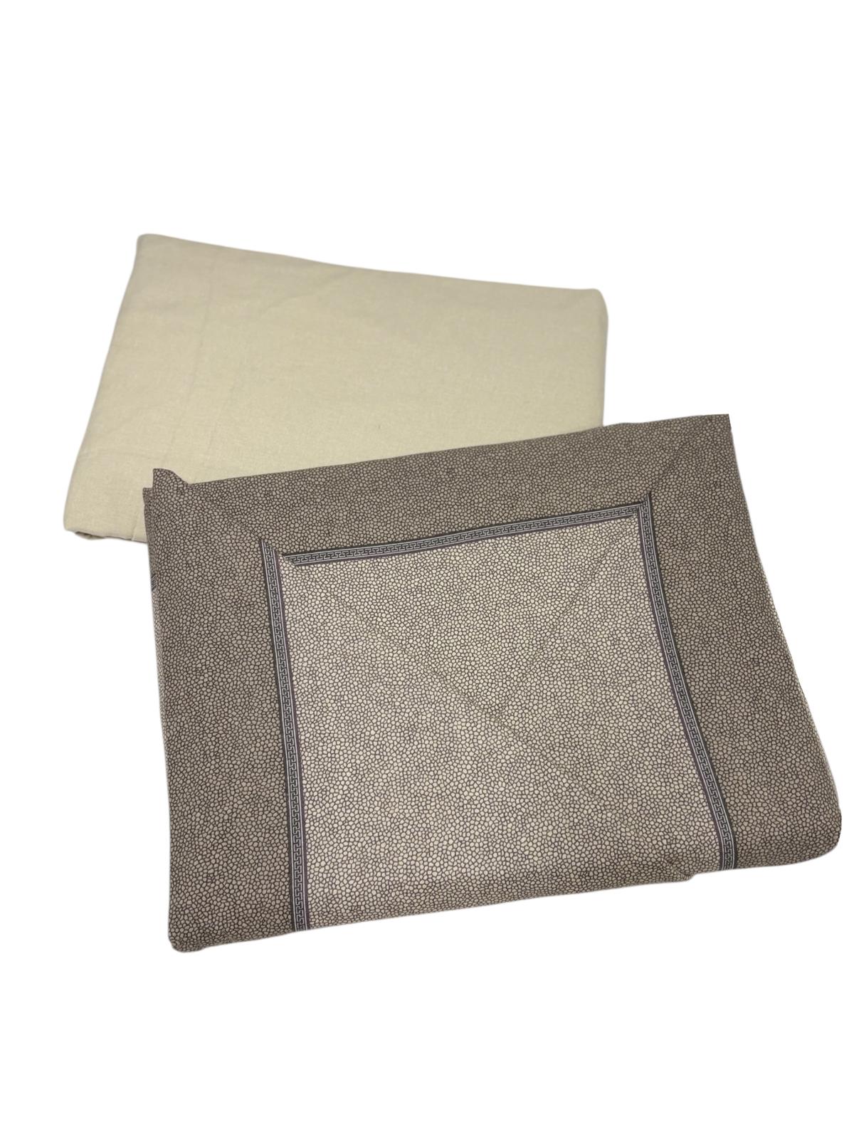Completo letto matrimoniale in flagella composto da: un copriletto color sabbia, un lenzuolo con stampa a pois marroni e da due federe per cuscini coordinati al lenzuolo.