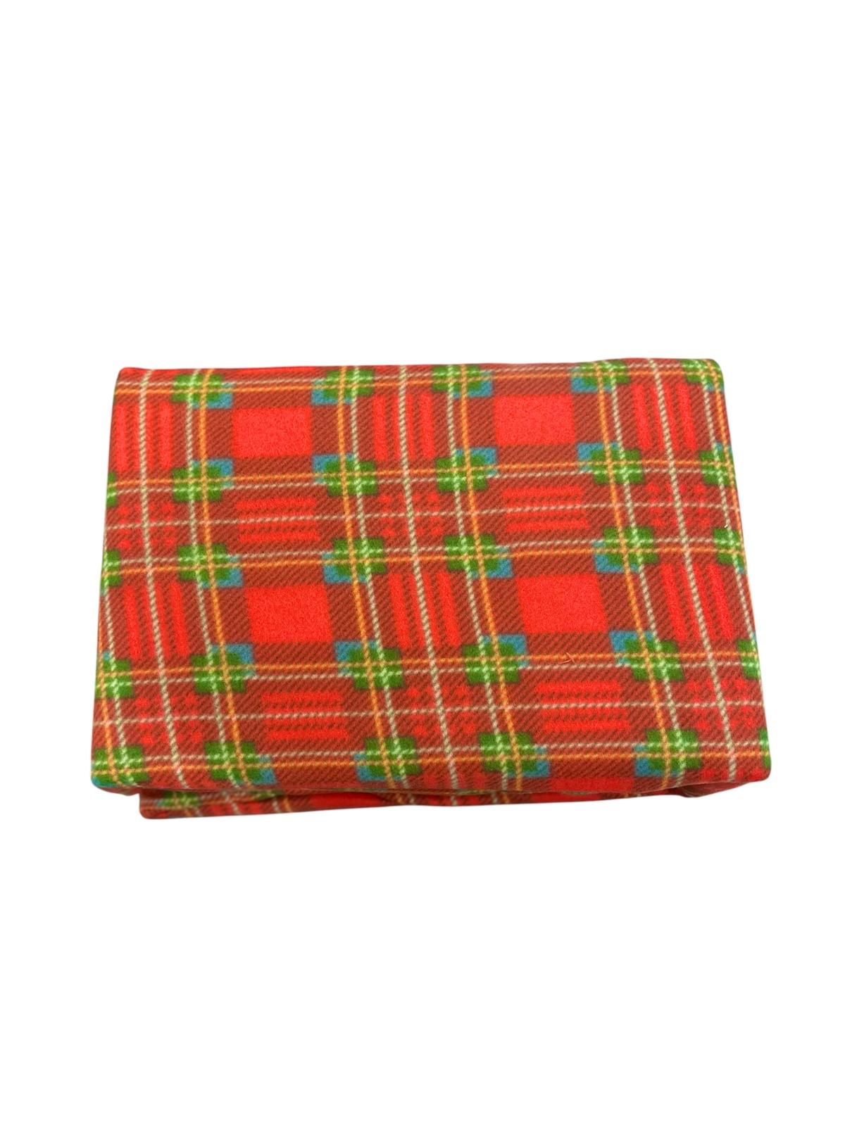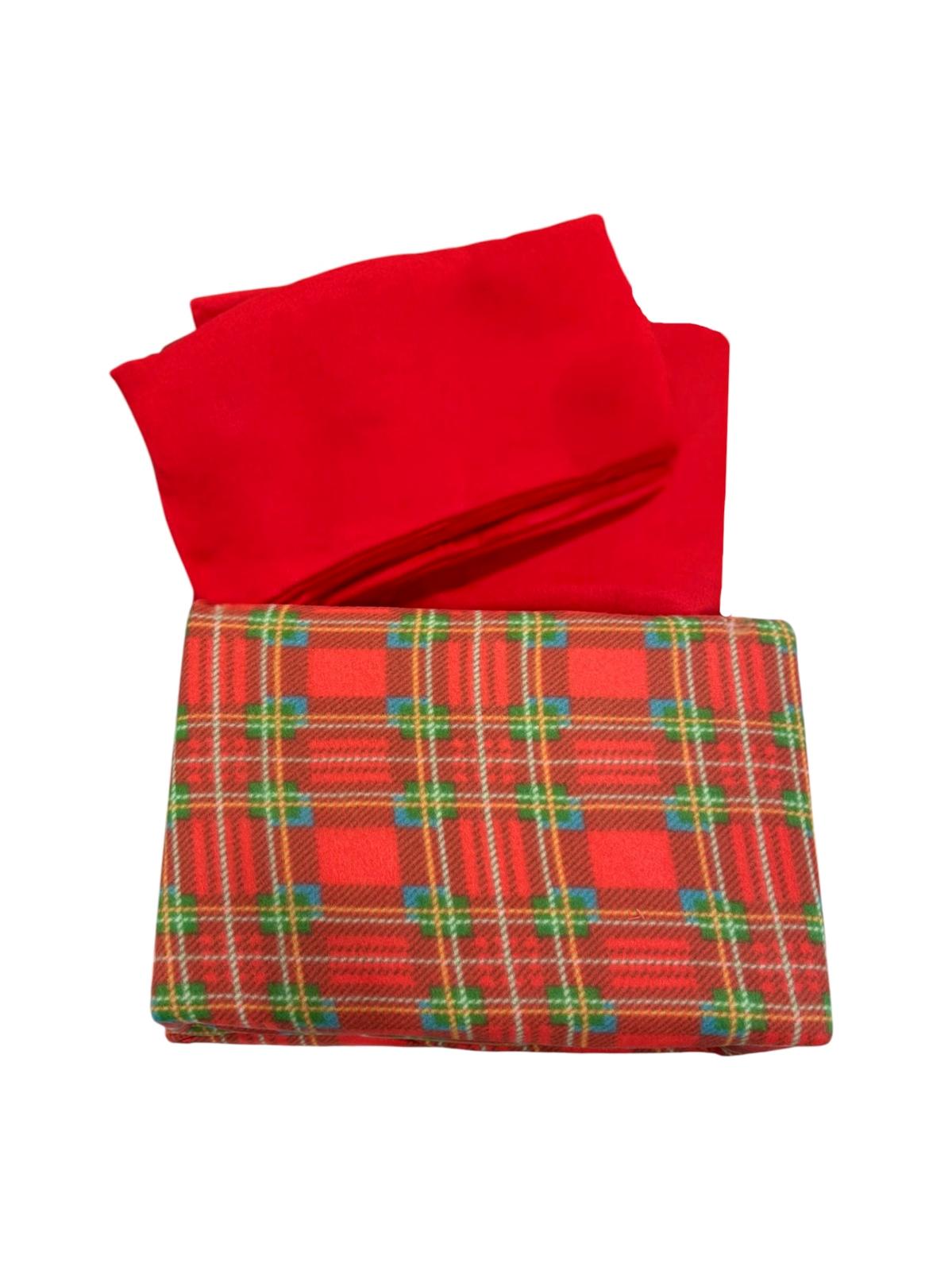 Completo letto in caldo pile matrimoniale: composto da un copriletto rosso, da un lenzuolo con fantasia scozzese e da due federe per cuscini rosse.