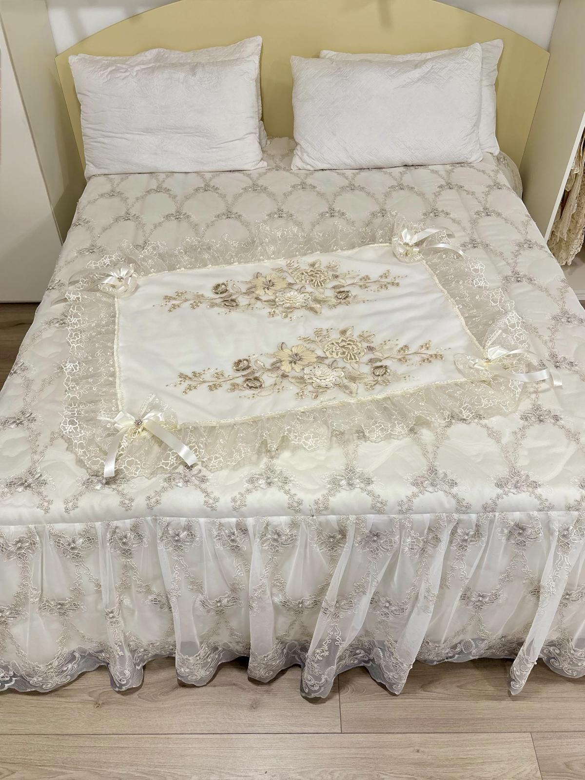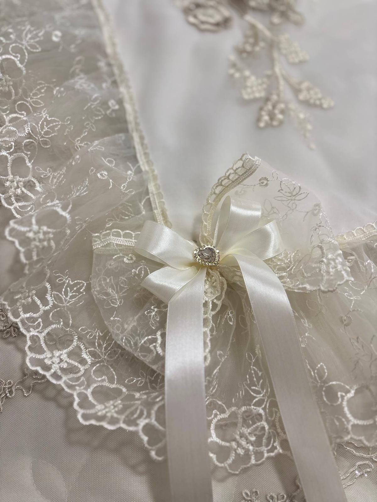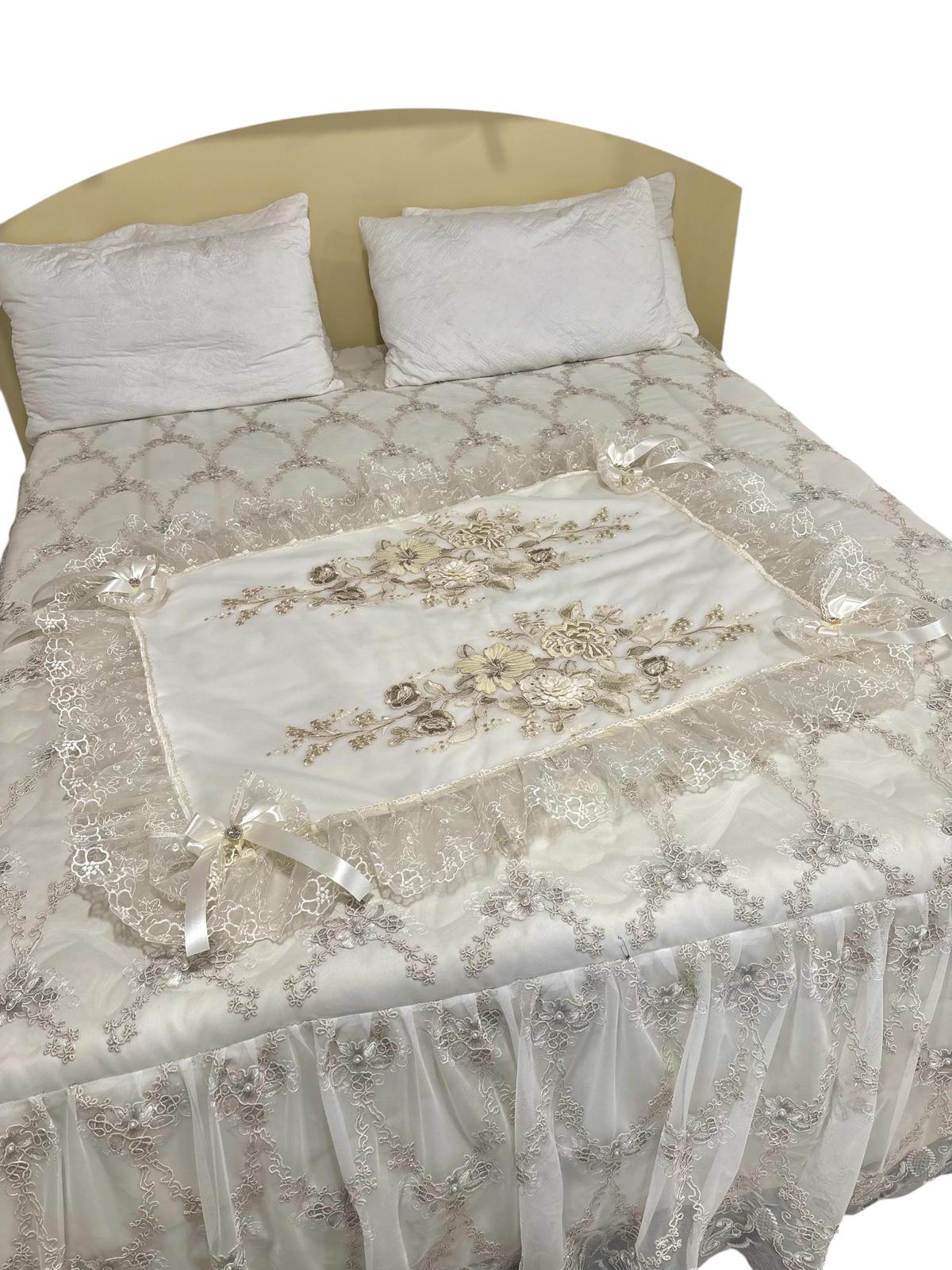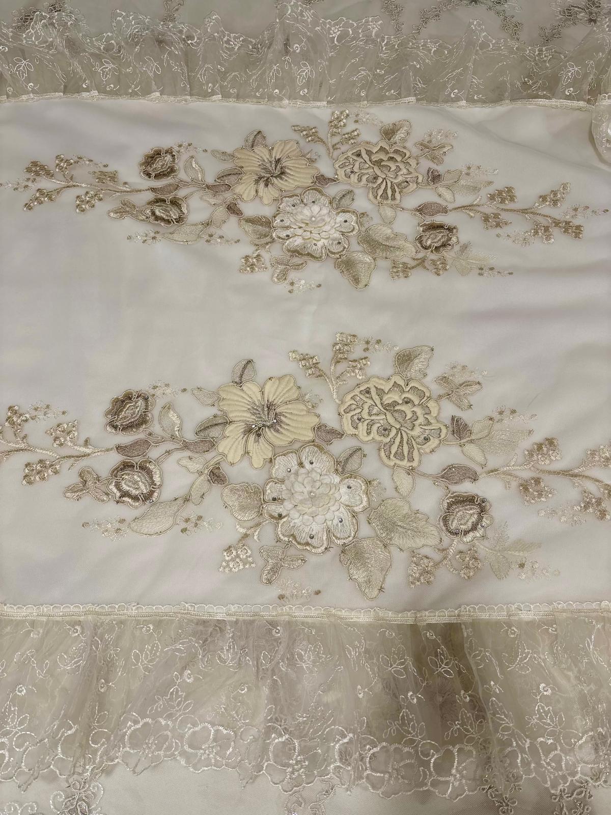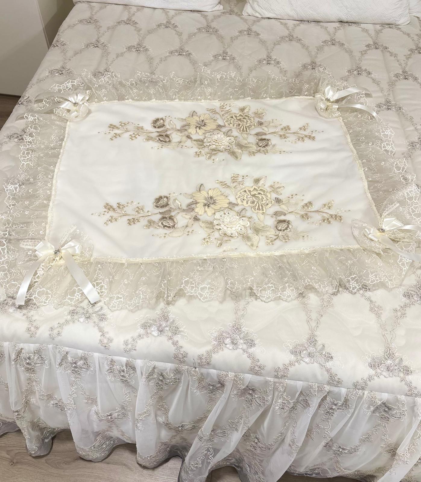 Centro letto avorio decorato con pizzo avorio, fiori dorati ricamati, brillantini e con doppi fiocchi avorio in raso. Lavorazione artigianale