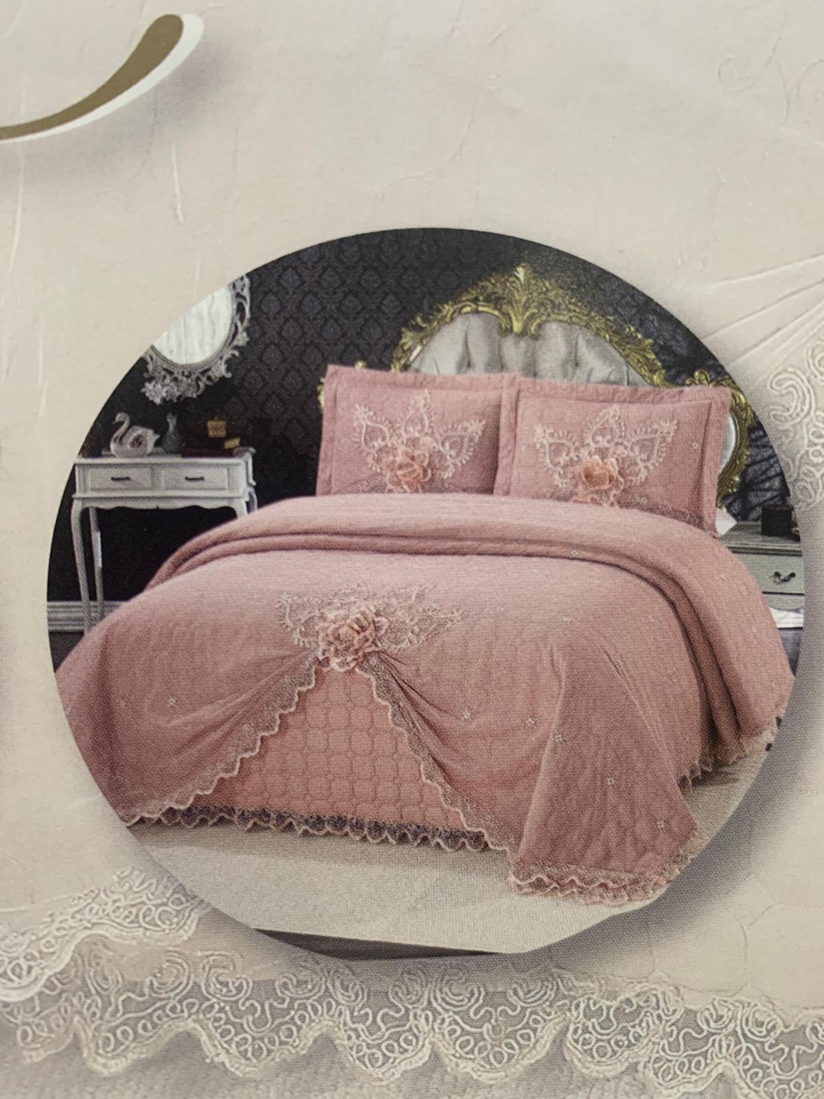Trapuntino elegante con pizzo rebrodè rosa con due guanciali