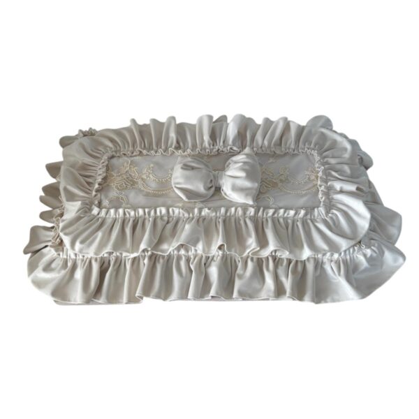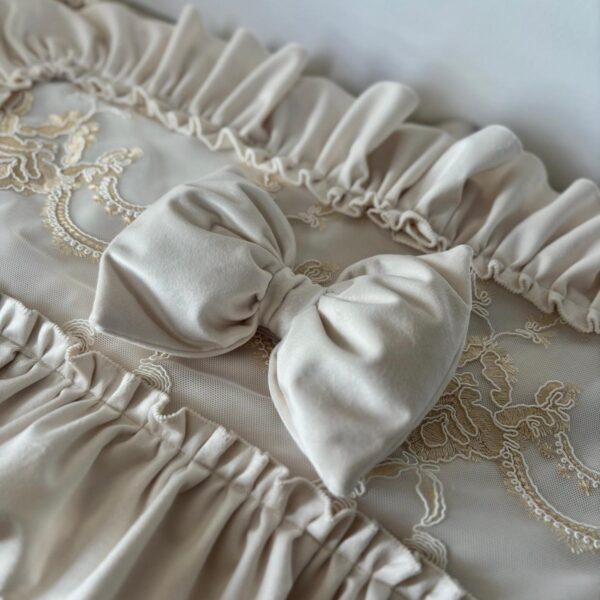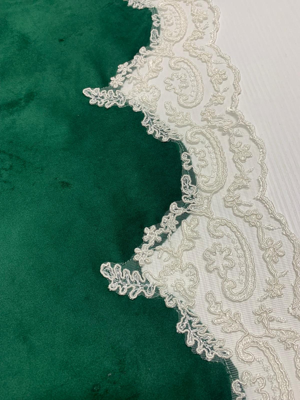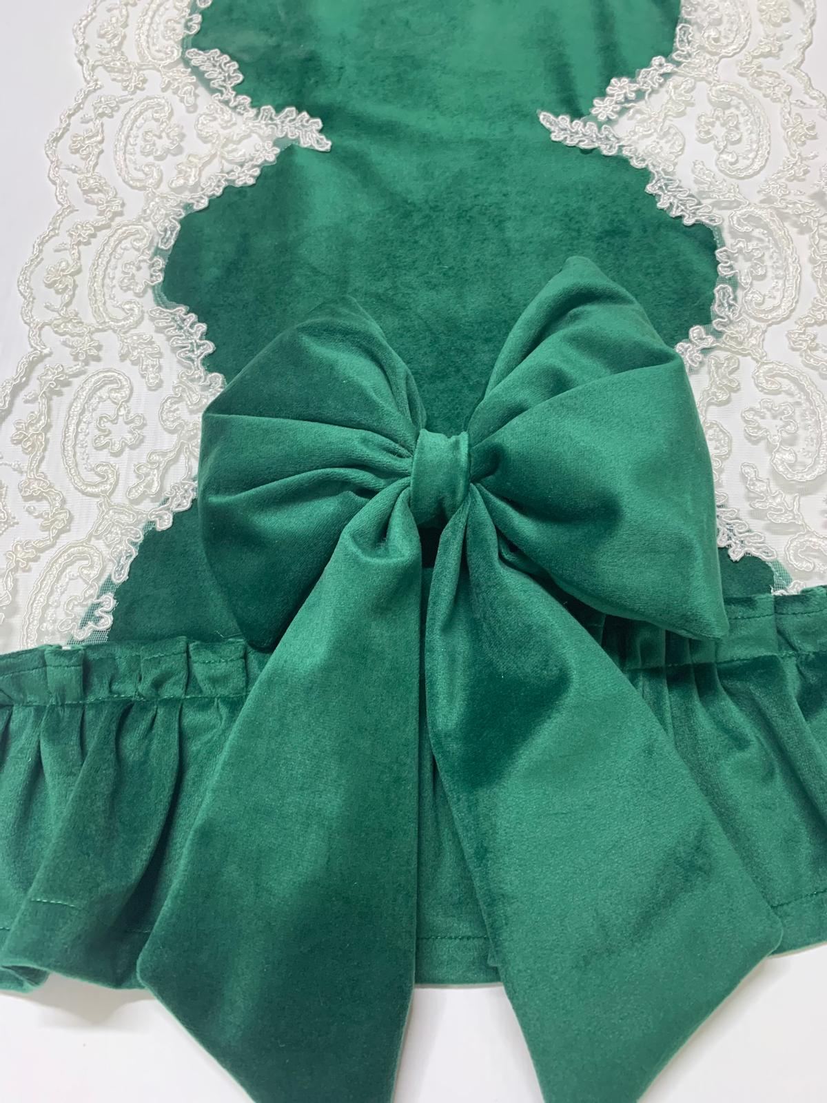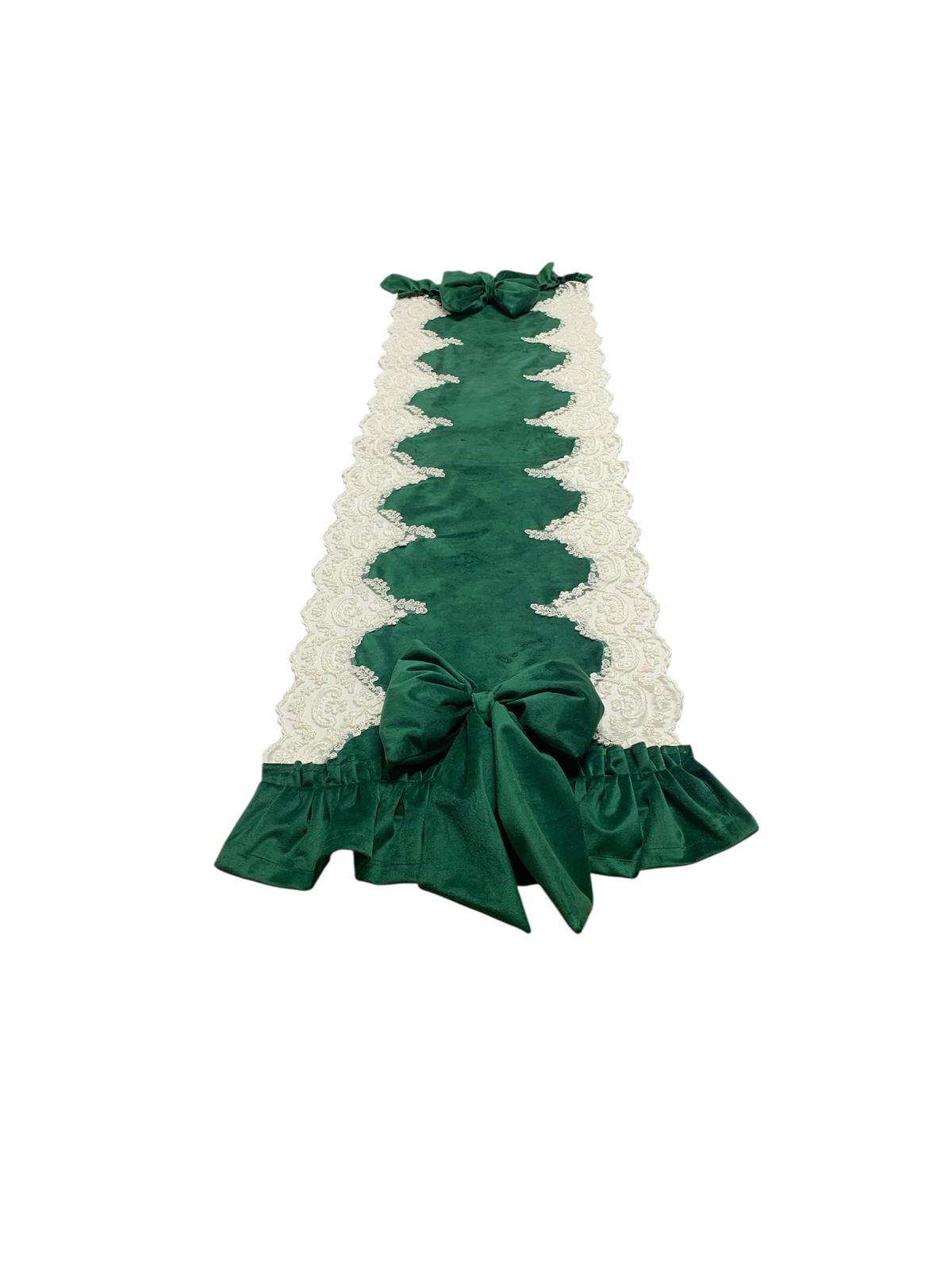 Runner velluto verde inglese in puro cotone rifinito con pizzo rebrodè di nostra produzione.