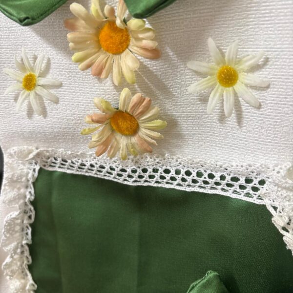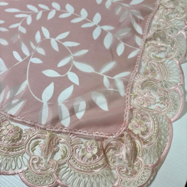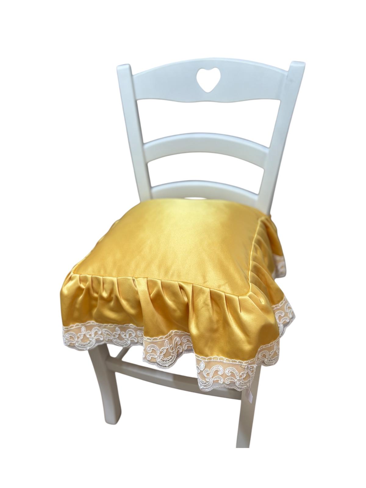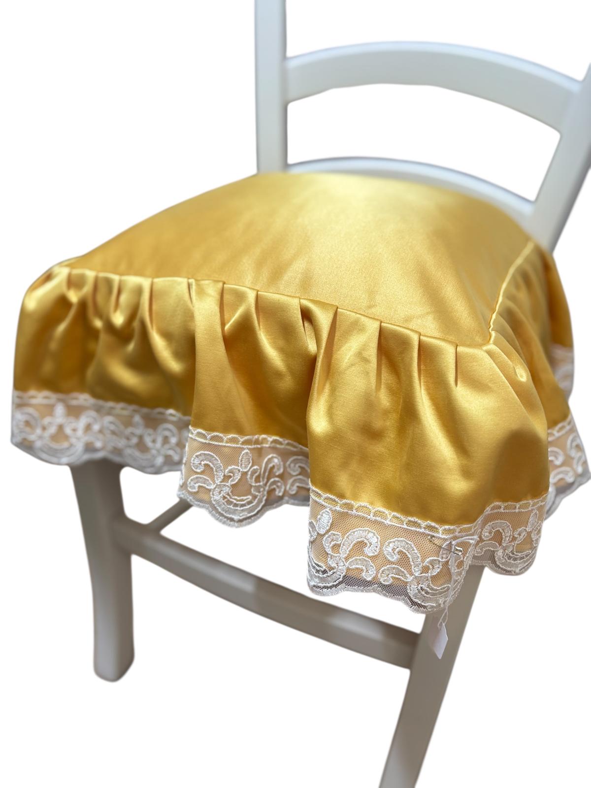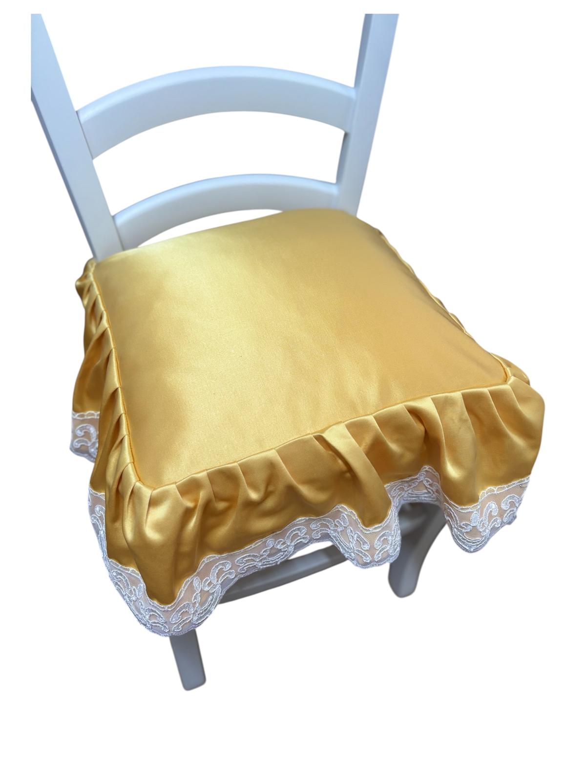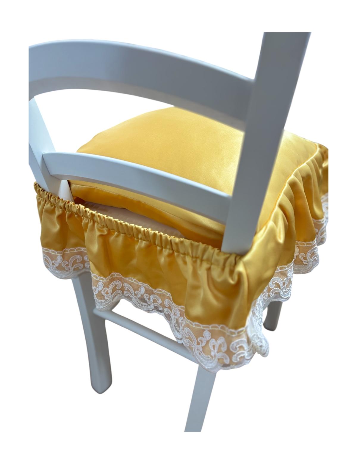 Cuscino giallo in damasco in seta decorato con pizzo macramè bianco.