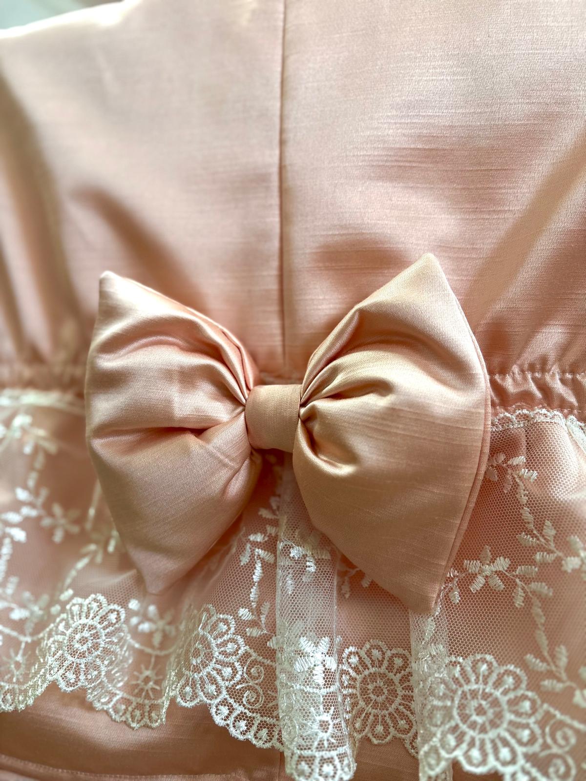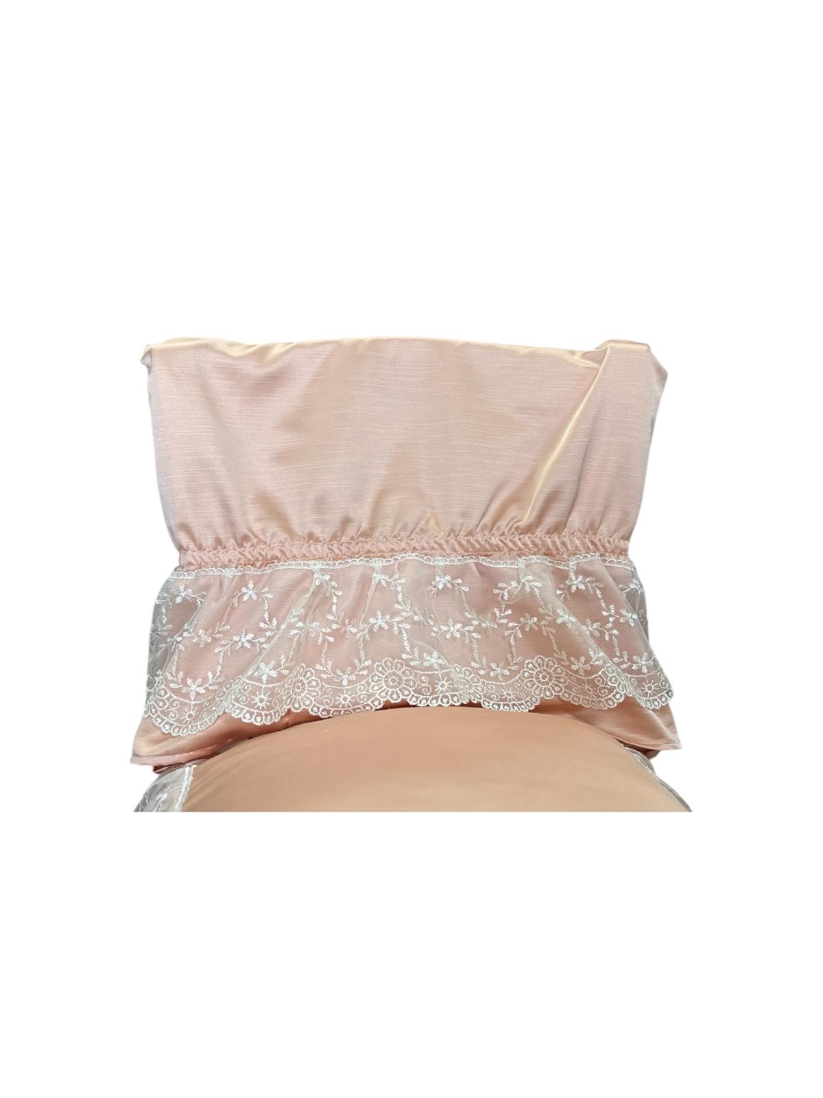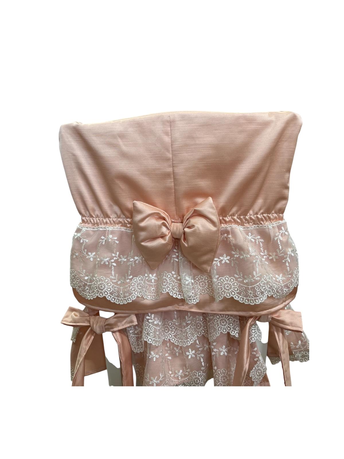 Copri schienale x sedia rosa salmone in damasco in seta decorato con volant con pizzo bianco e con fiocco rosa posteriore.