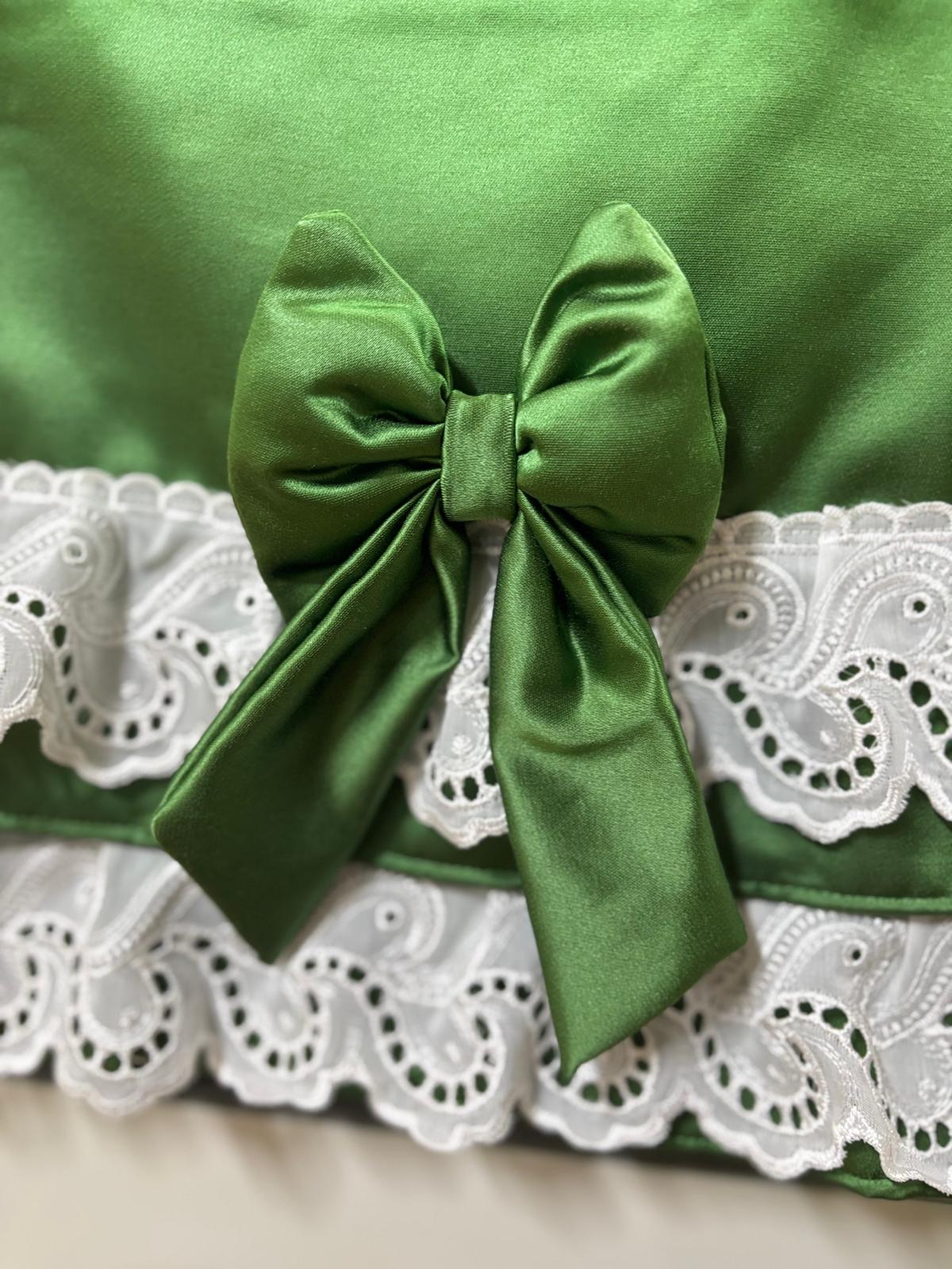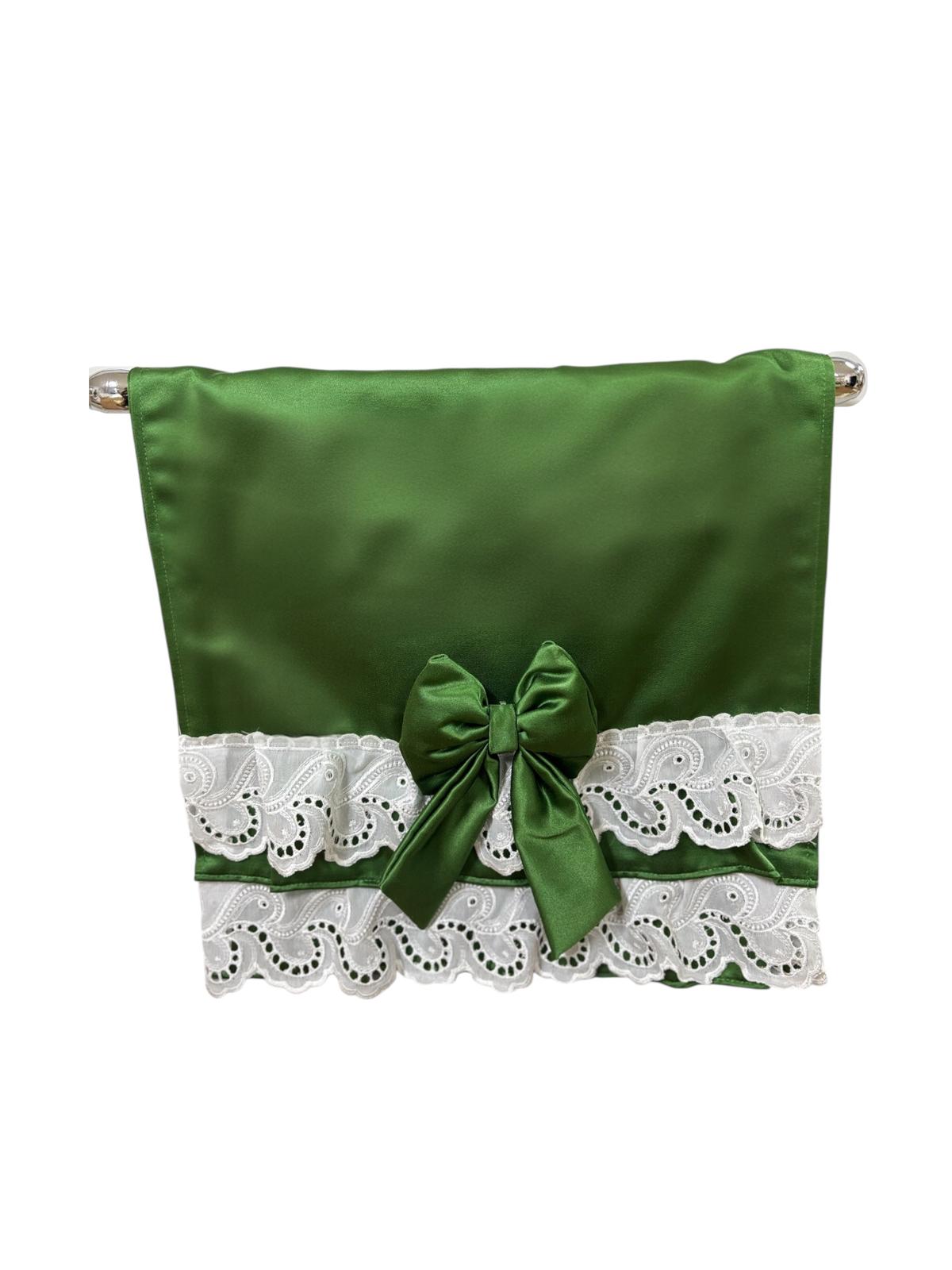 Copriforno verde in damasco in seta decorato con pizzo bianco e con fiocco verde.