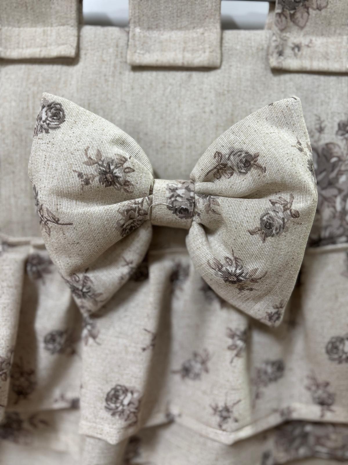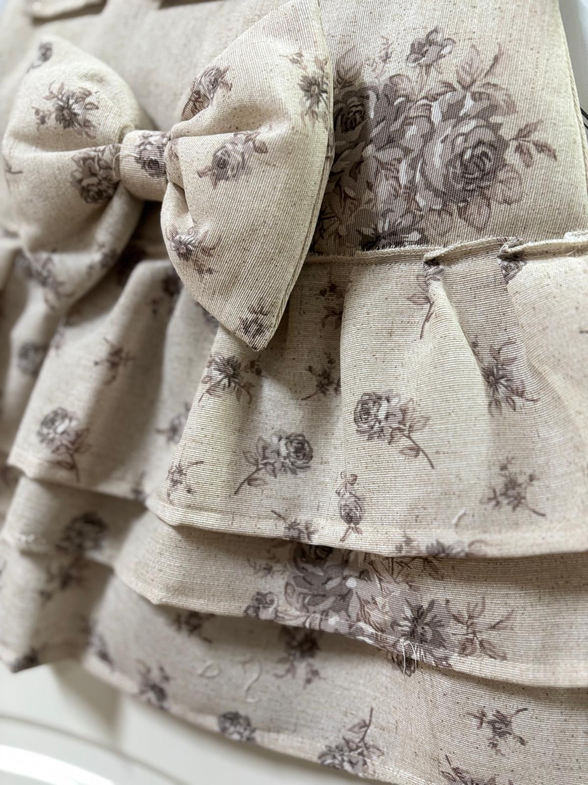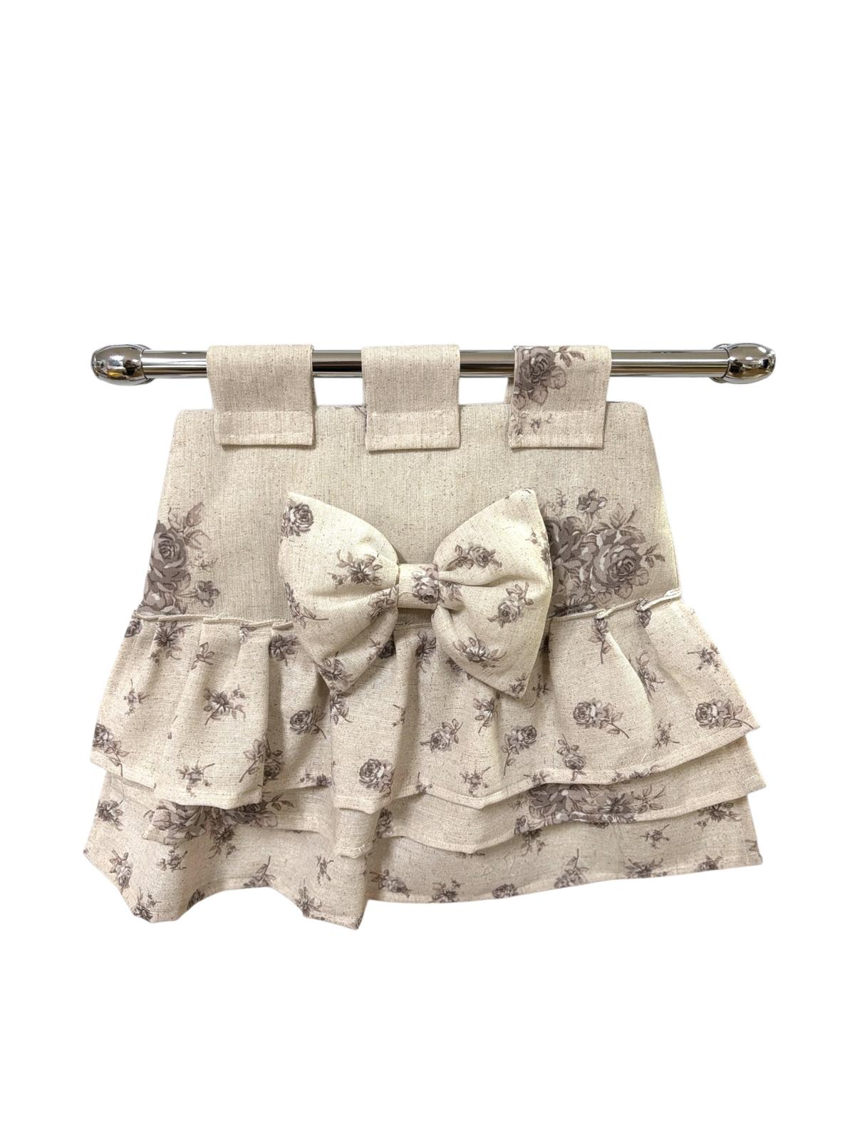 Copriforno in cotone tortora decorato con fiori grigi stampati e con fiocco e volant coordinati.