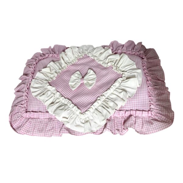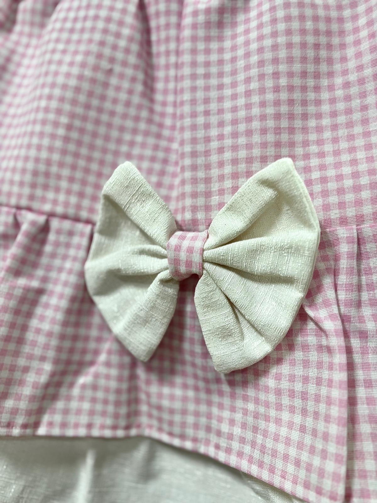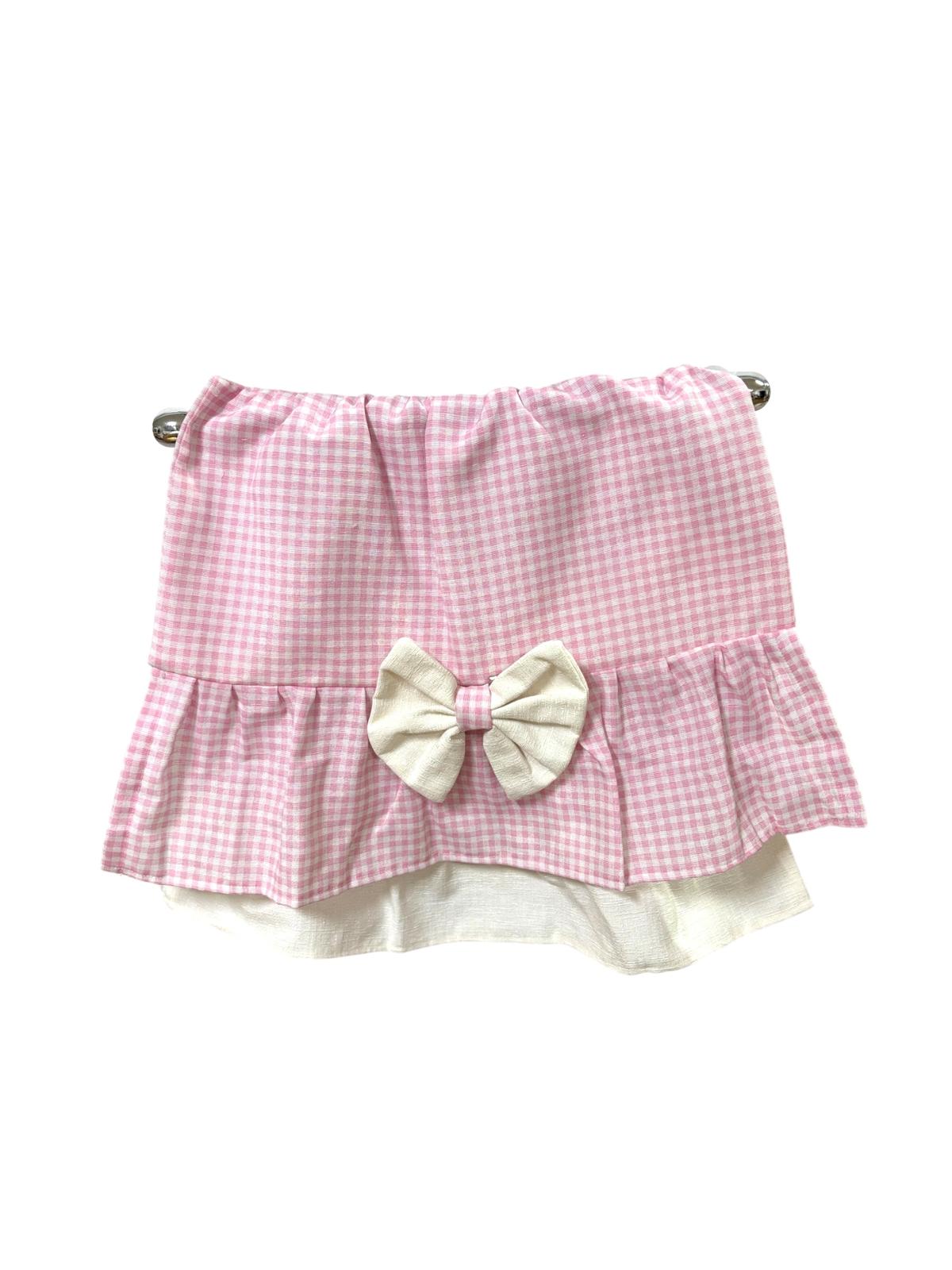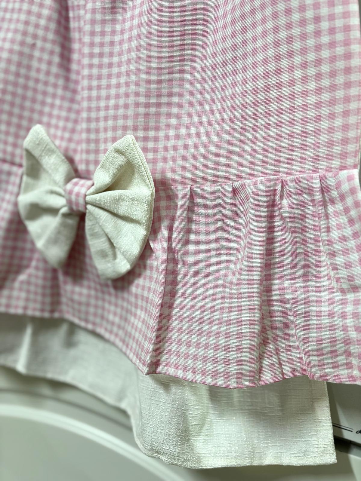 Copriforno in cotone rosa e bianco con stampa a quadretti decorato con volant e con fiocco bianco.