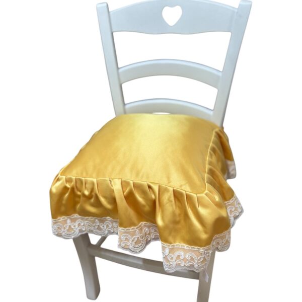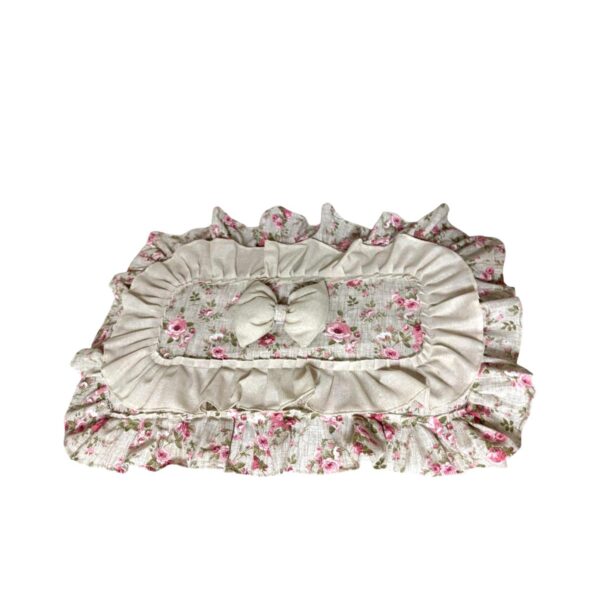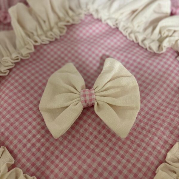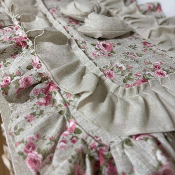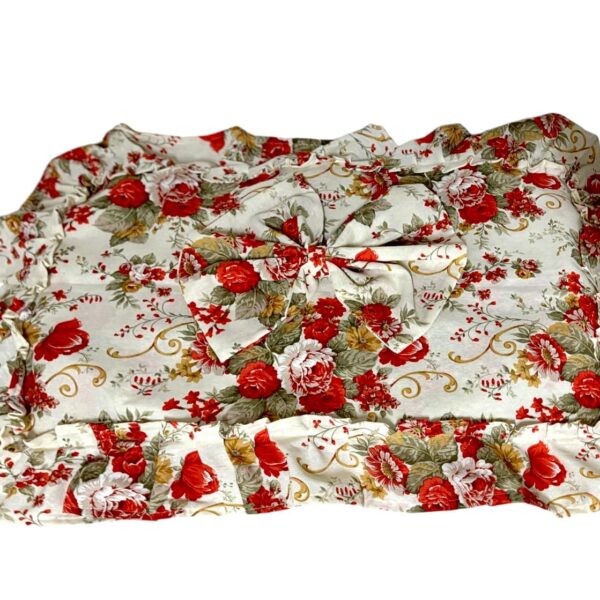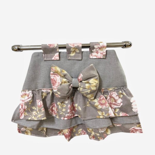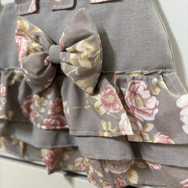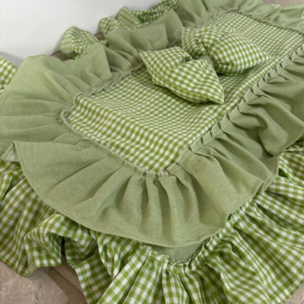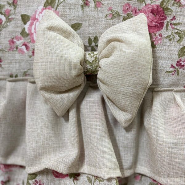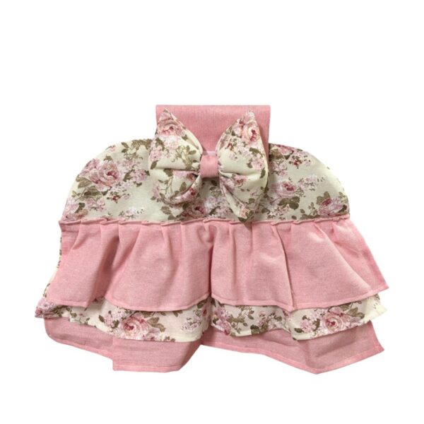 Copriforno in cotone rosa e bianco con stampa a quadretti decorato con volant e con fiocco bianco.