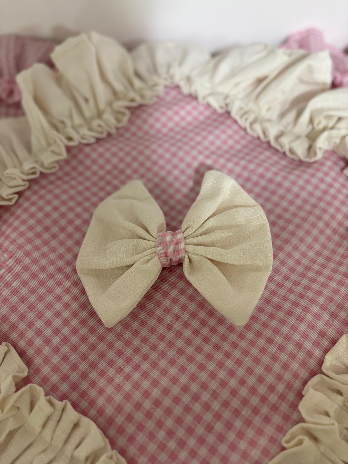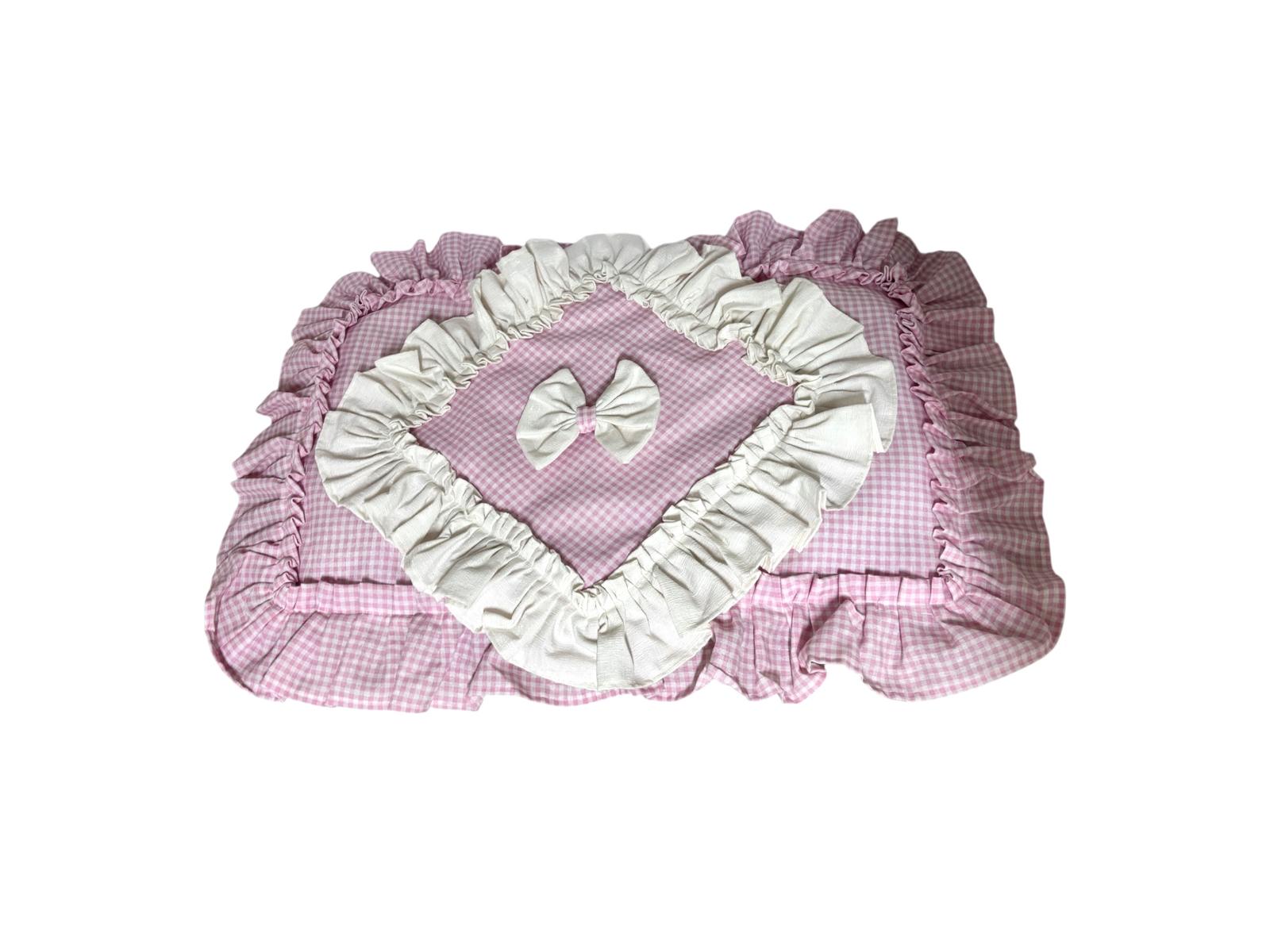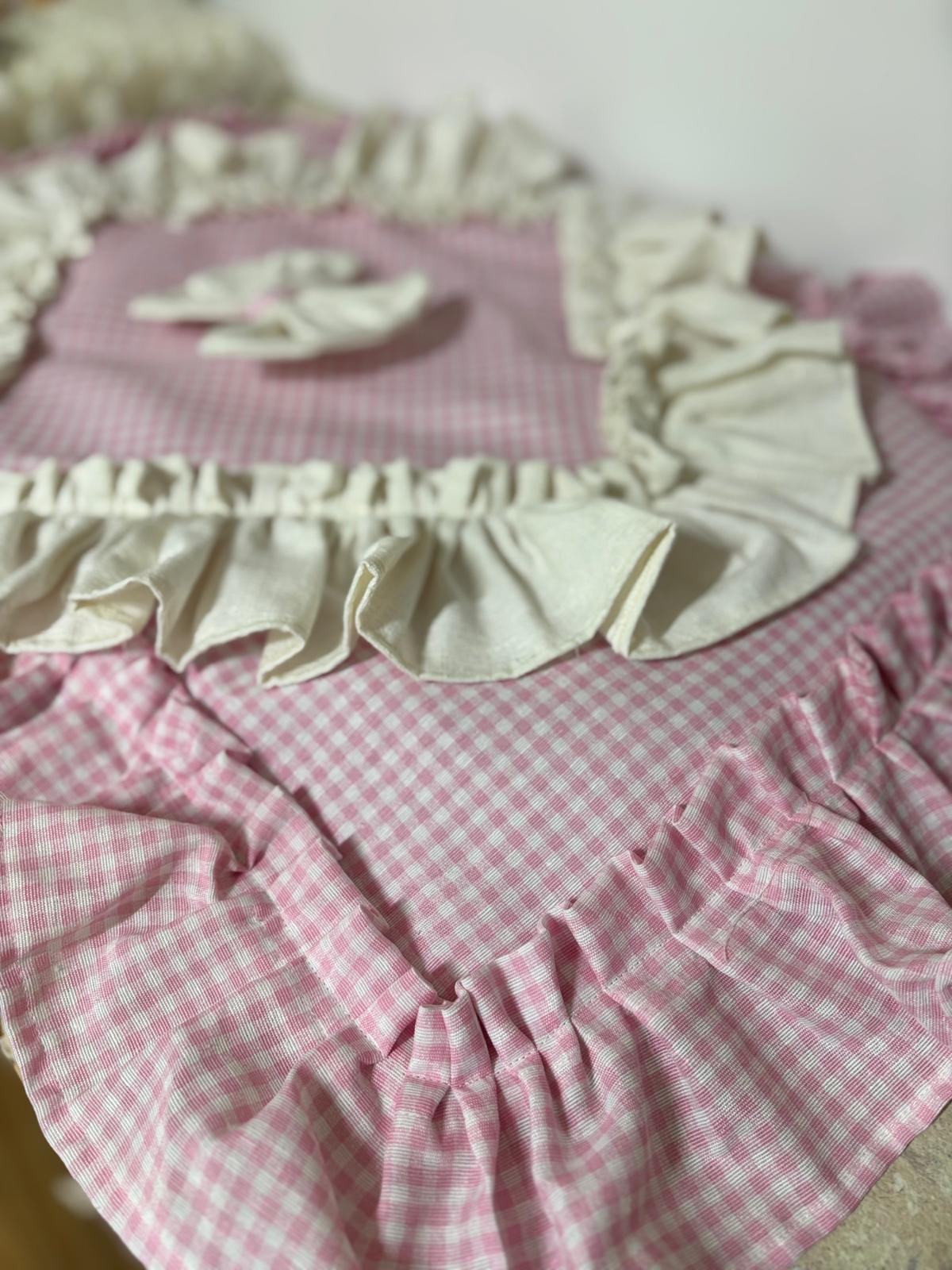 Copricucina in cotone rosa e bianco con stampa a quadretti decorato con volant e con fiocco bianco.