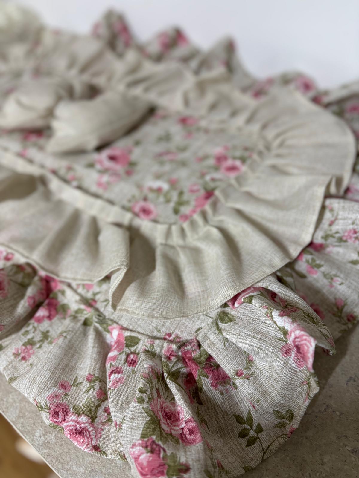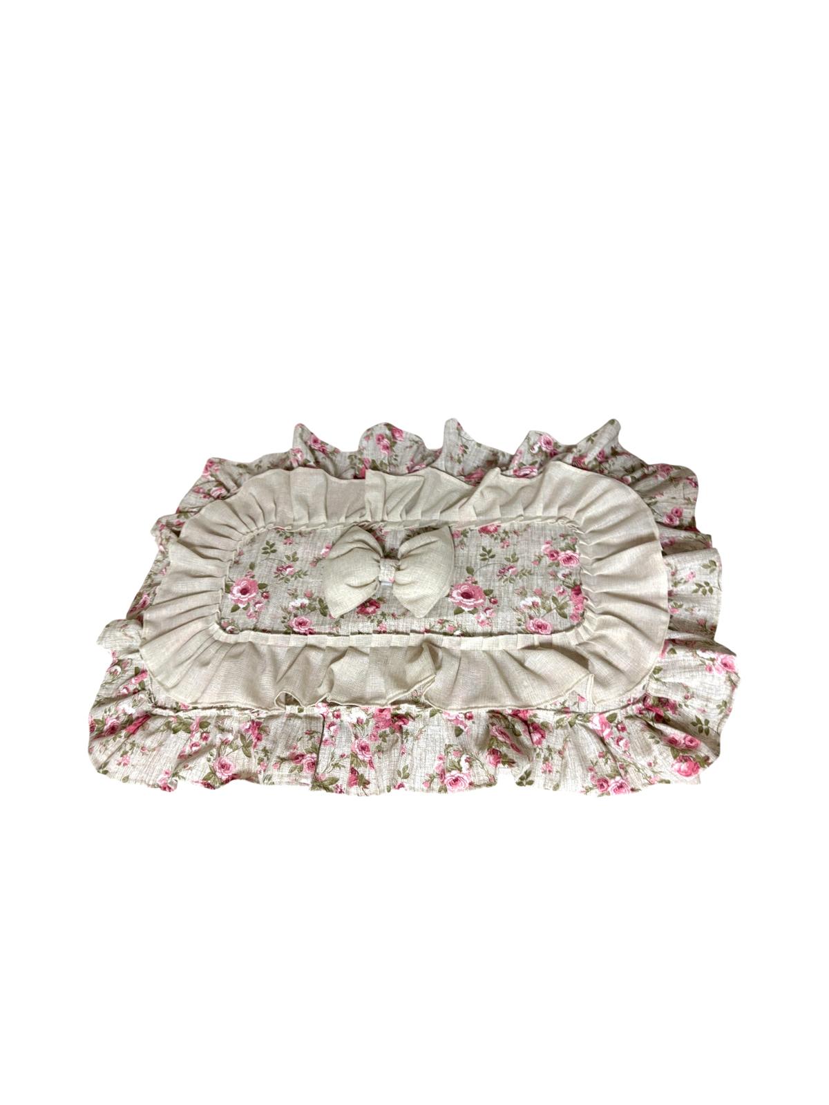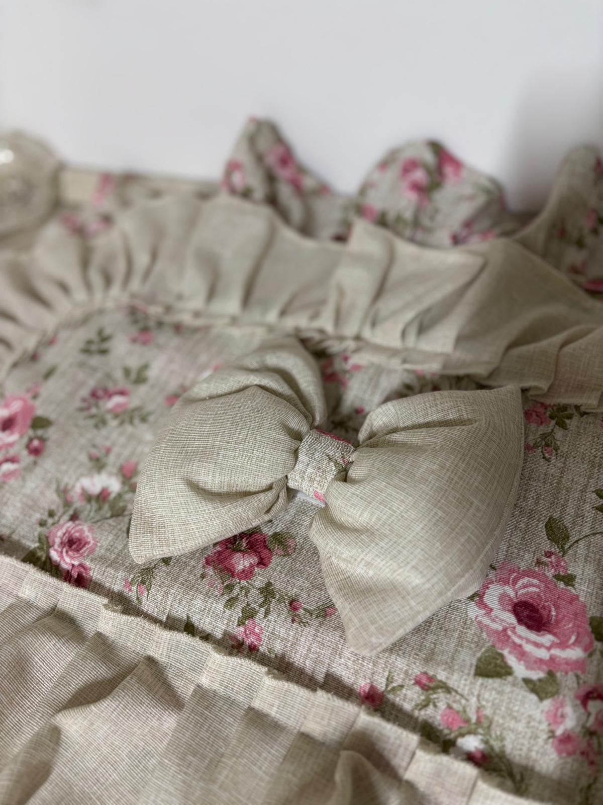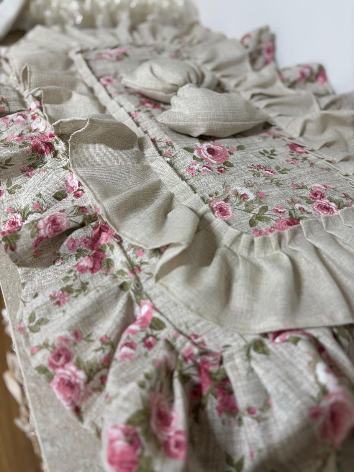 Copricucina in cotone tortora decorato con stampa a fiori rosa, con fiocco tortora e con volant.