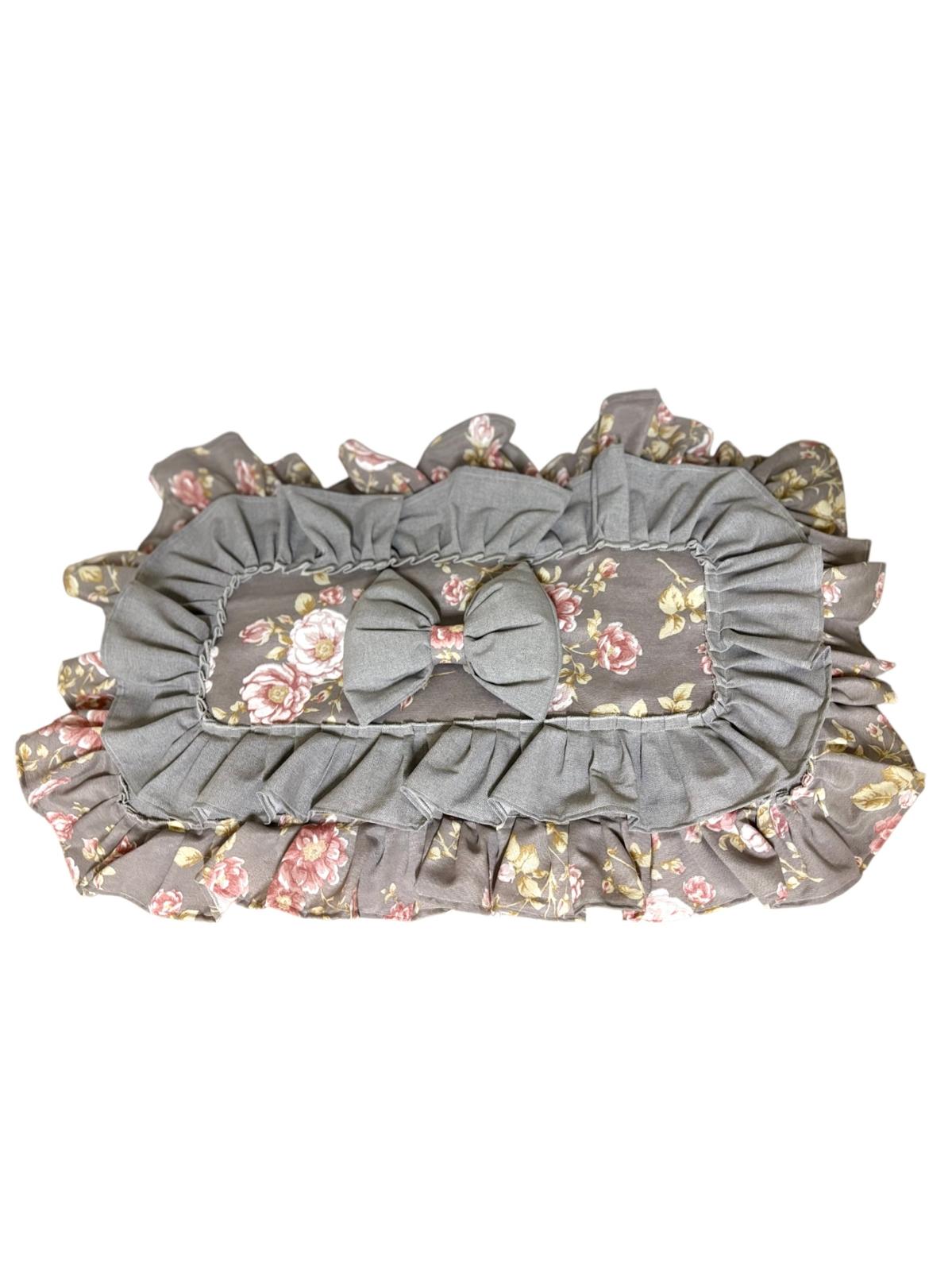 Copricucina in cotone grigio decorato con stampa a fiori rosa, con fiocco grigio e con volant.