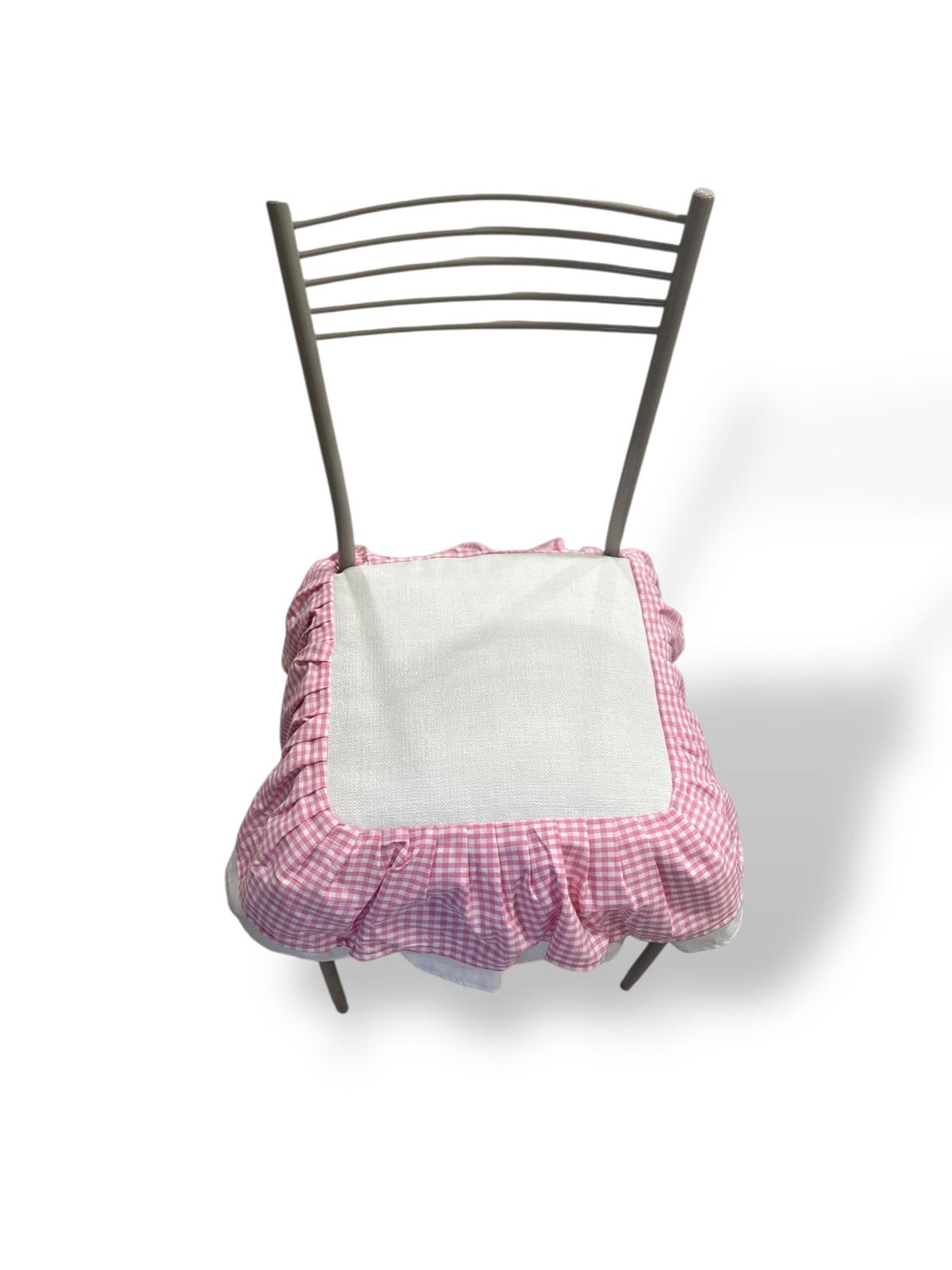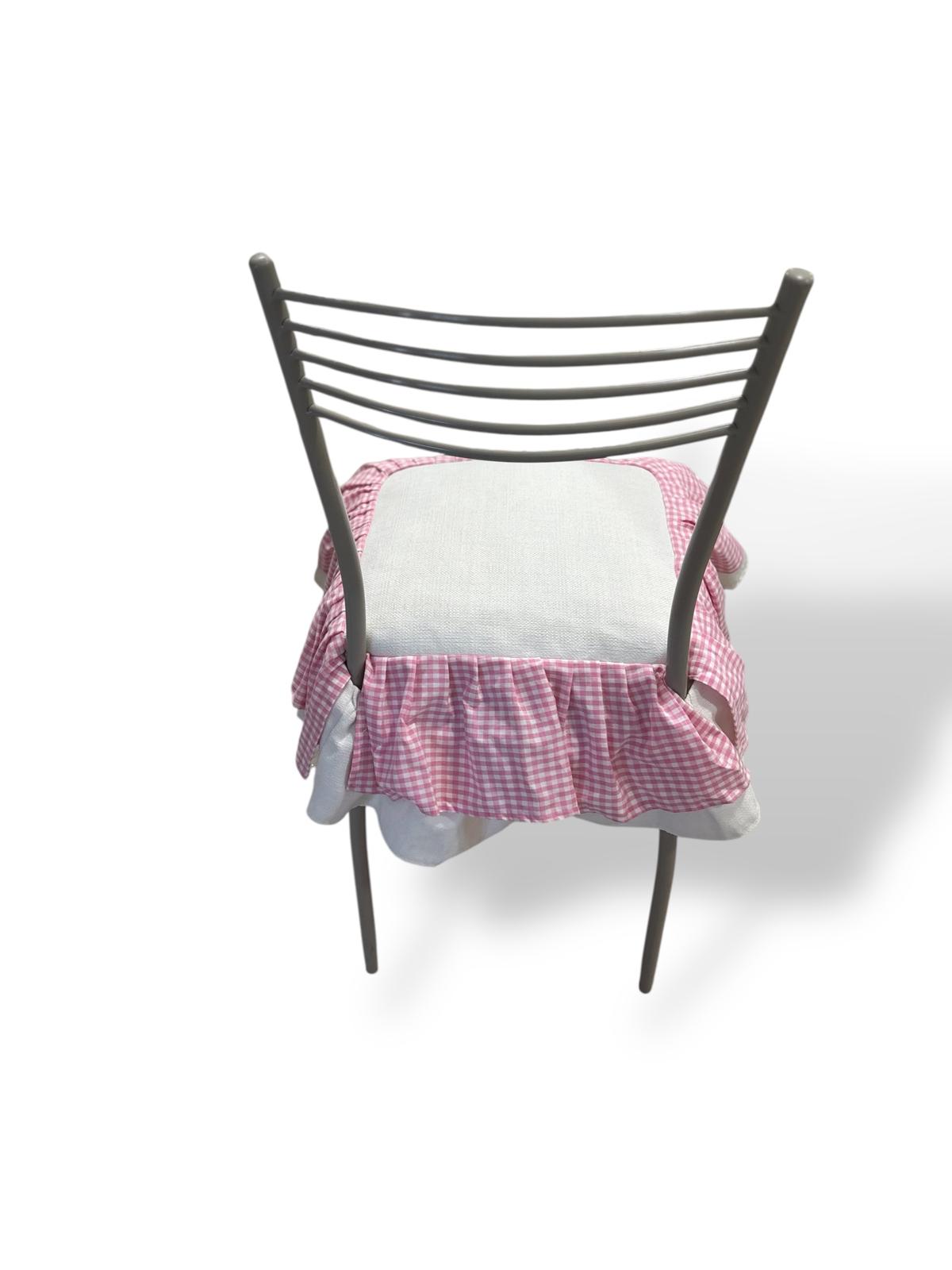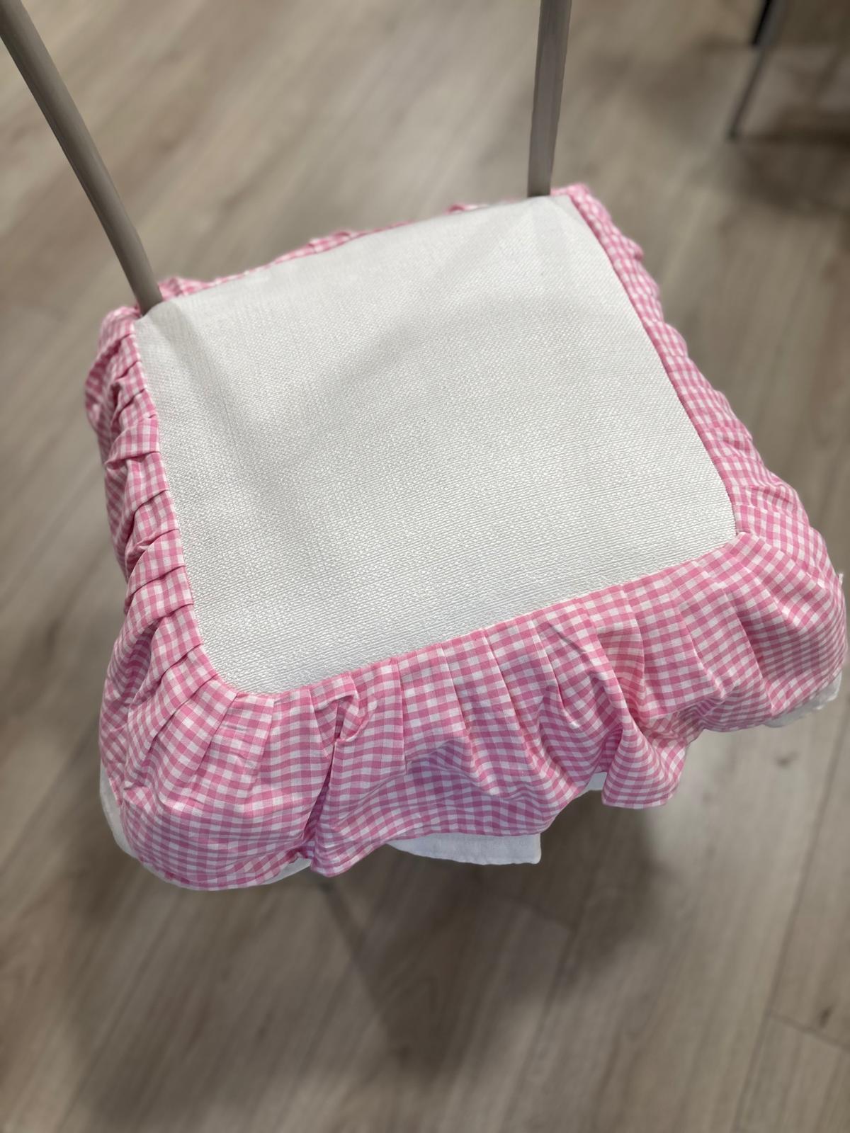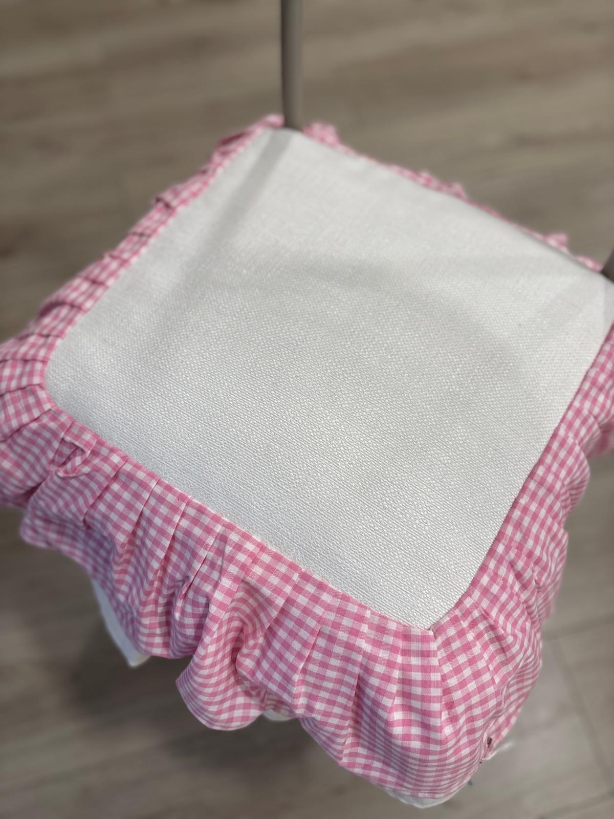 Cuscino in cotone pesante rosa decorato con volant bianchi e con quadretti bianchi e rosa.