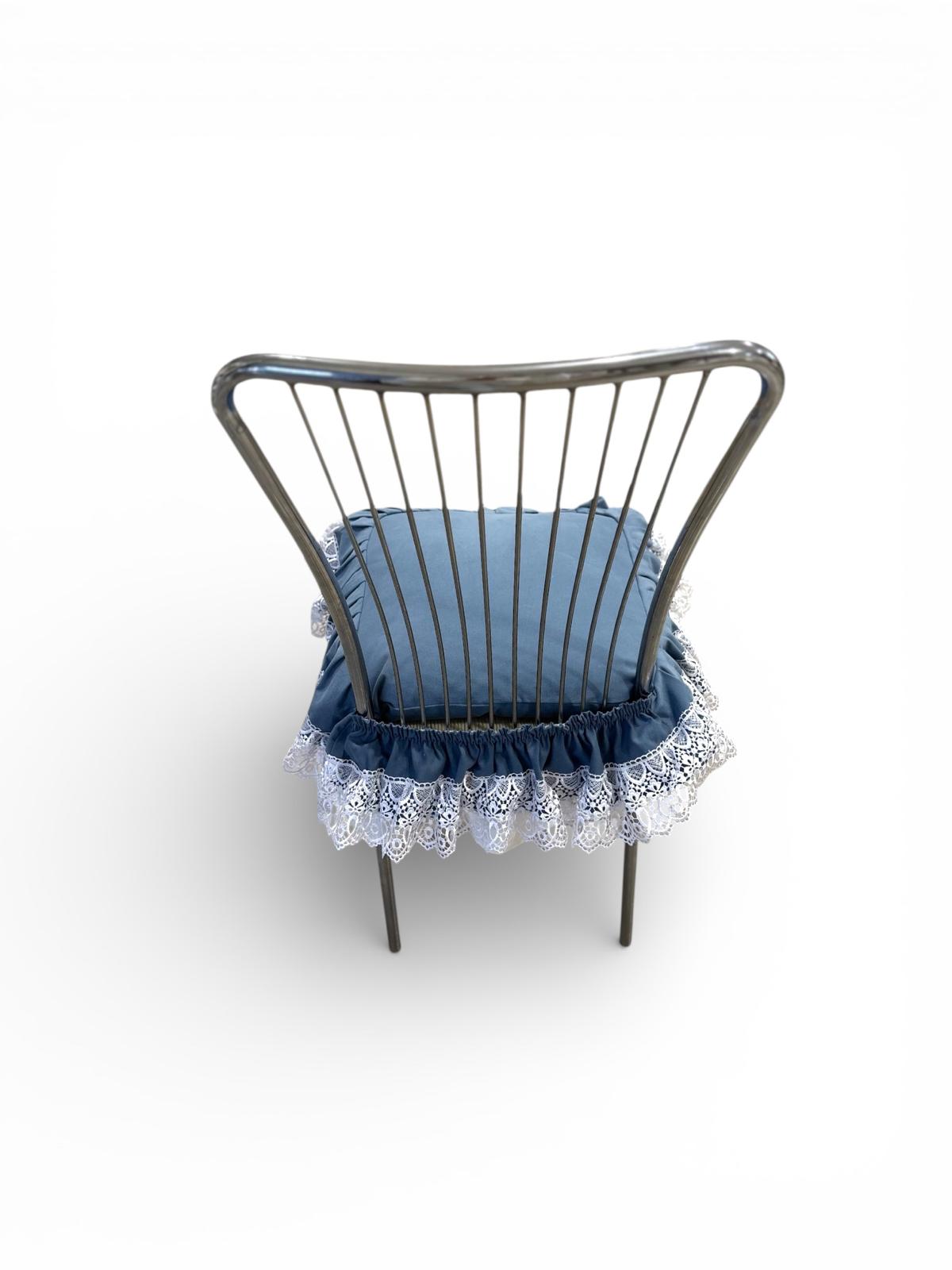 Cuscino per sedia azzurro polvere decorato con pizzo macramè bianco.