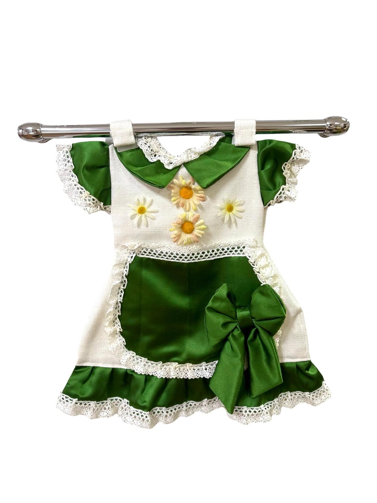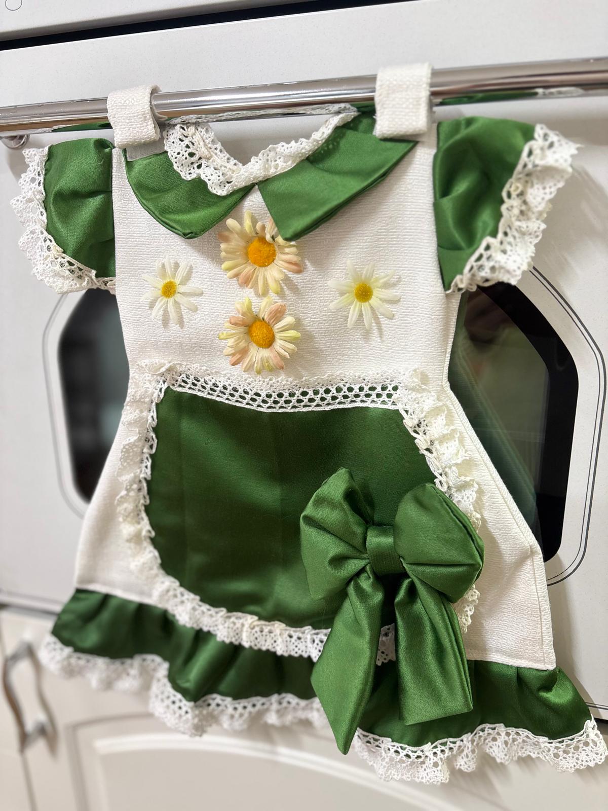 Copriforno a forma di abitino bianco verde in damasco decorato con fiorellini finti.