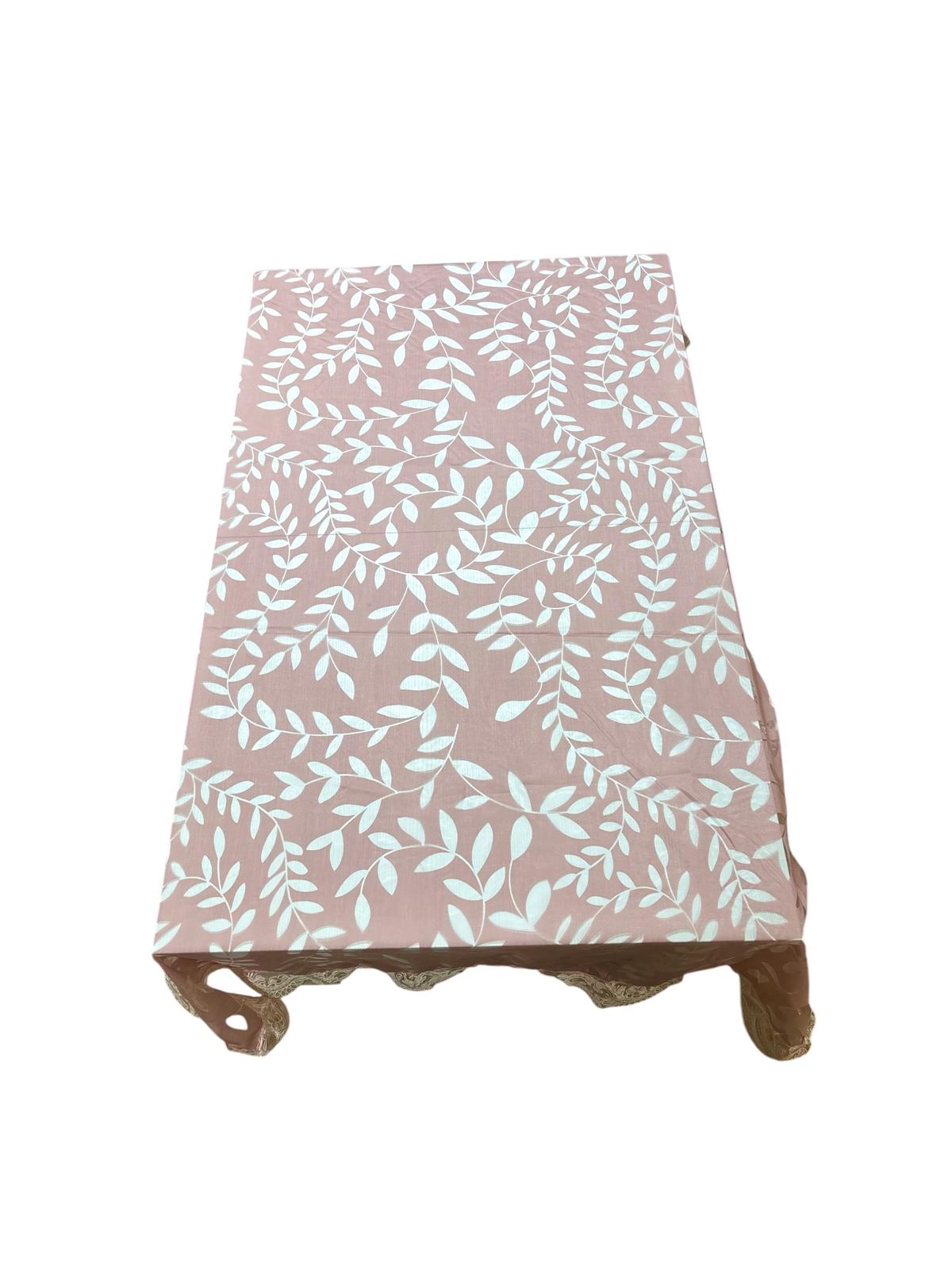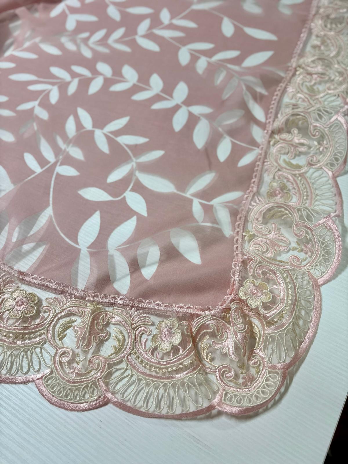 Tovaglia rosa con trasparenze a forma di foglia e con pizzo ricamato rosa.