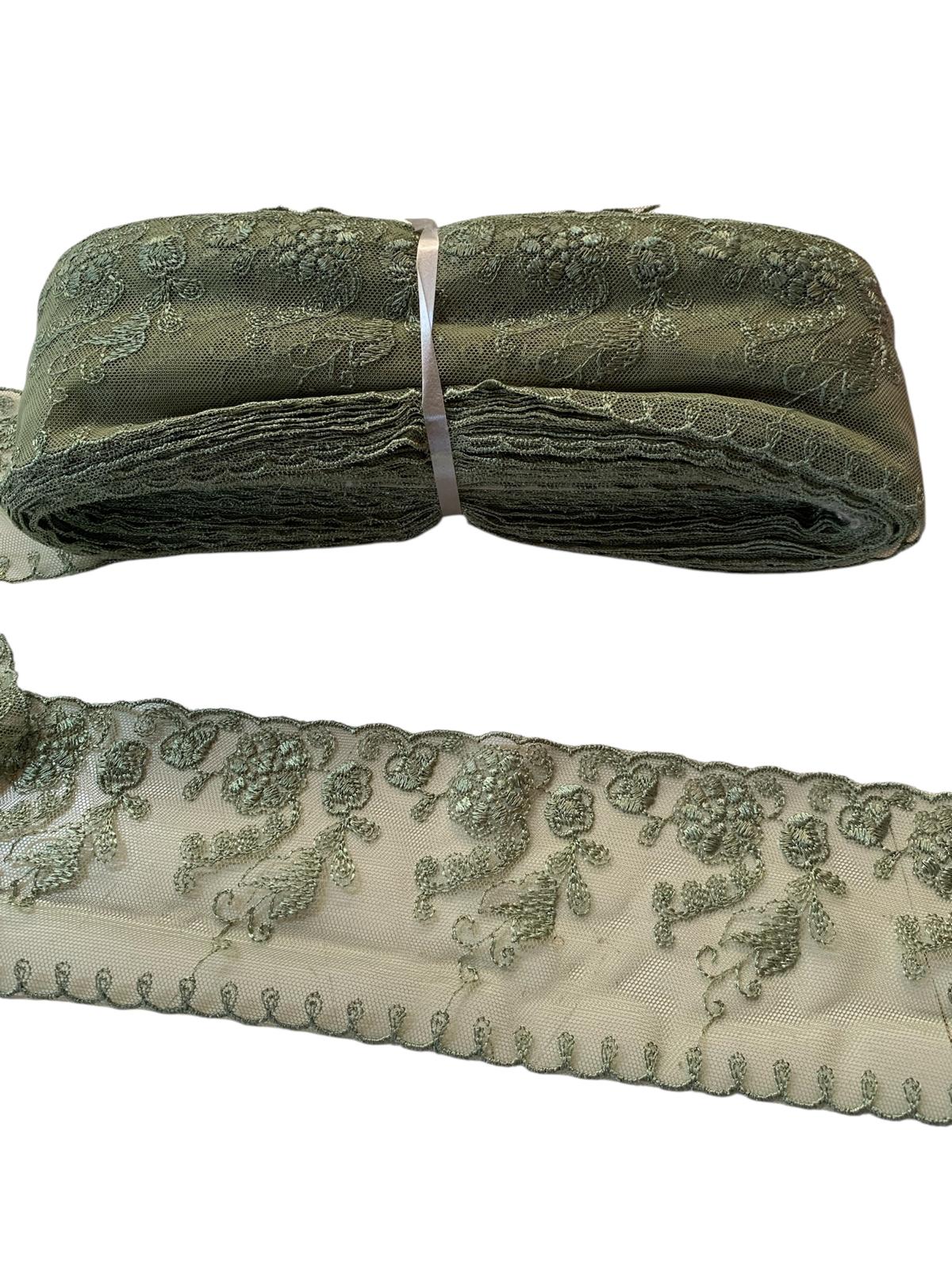Pizzo in tulle ricamato verde antico