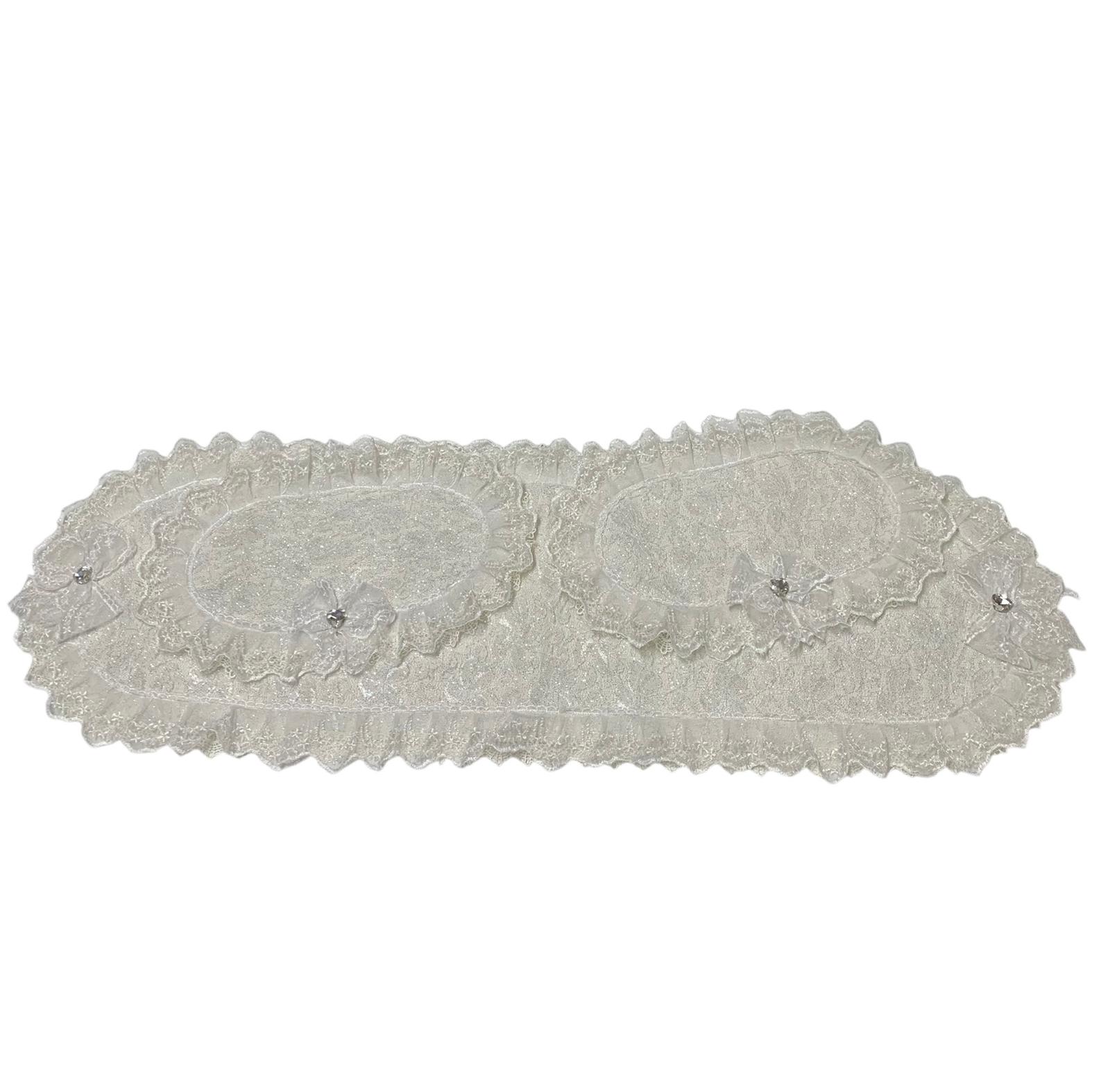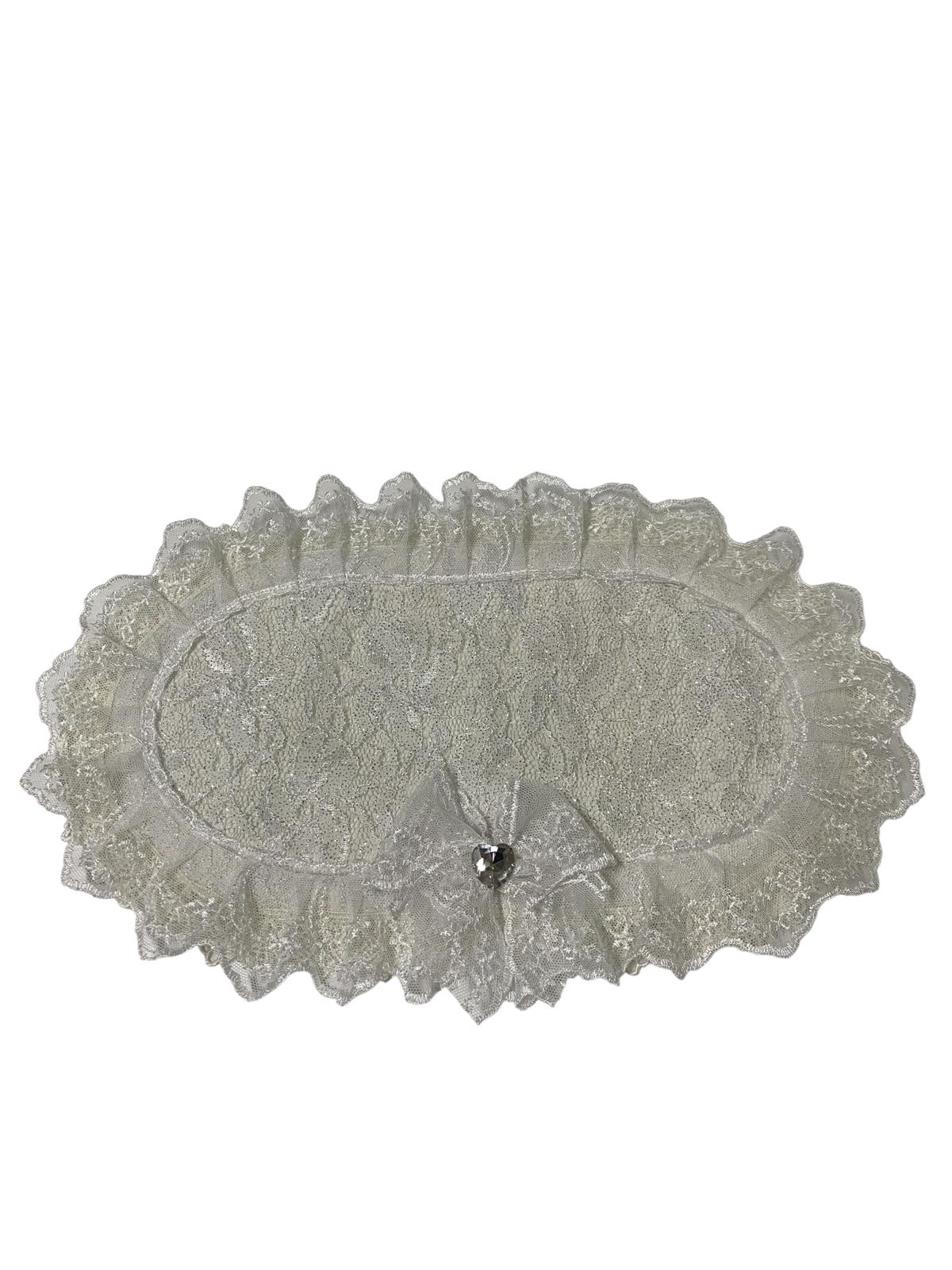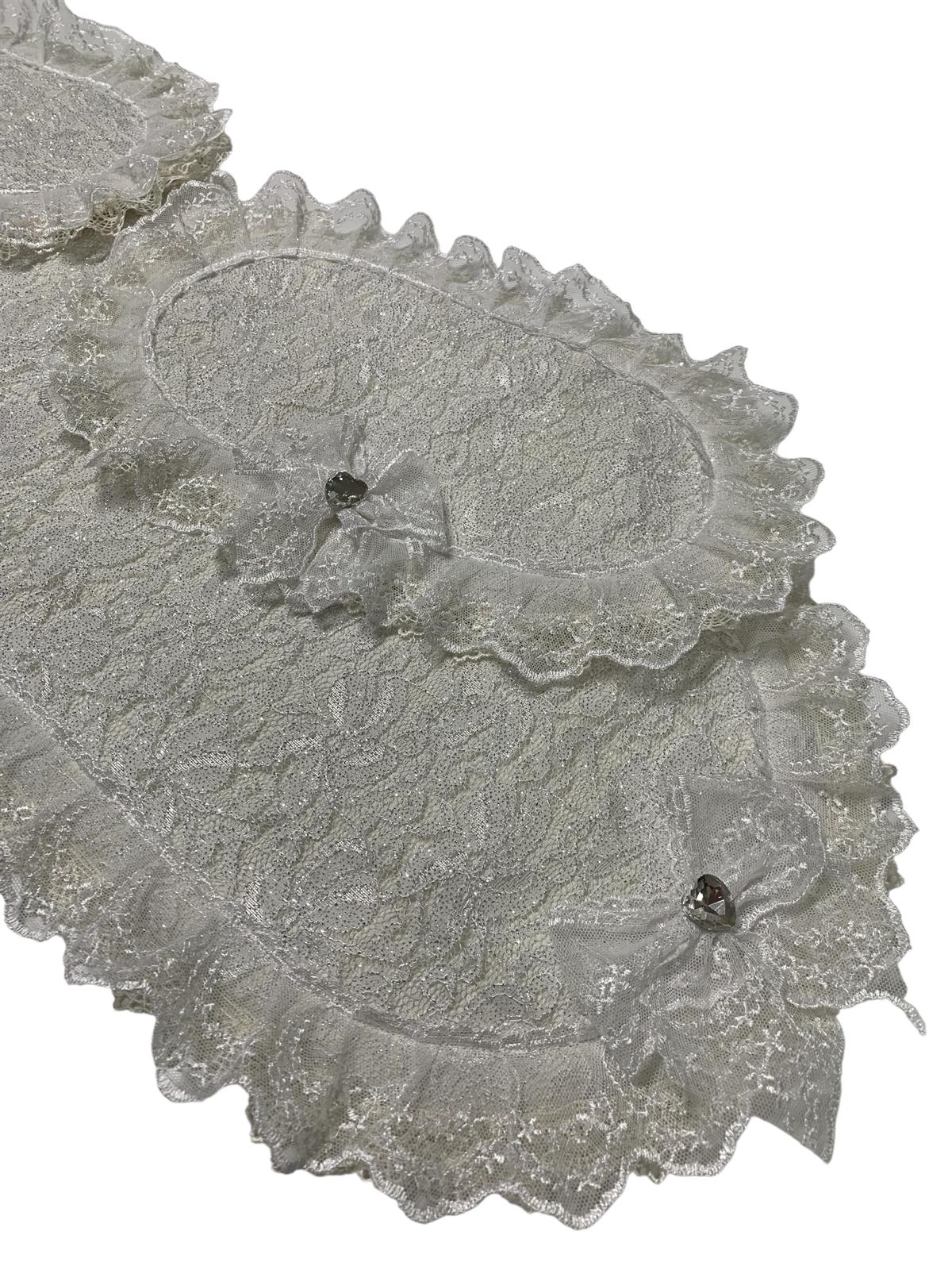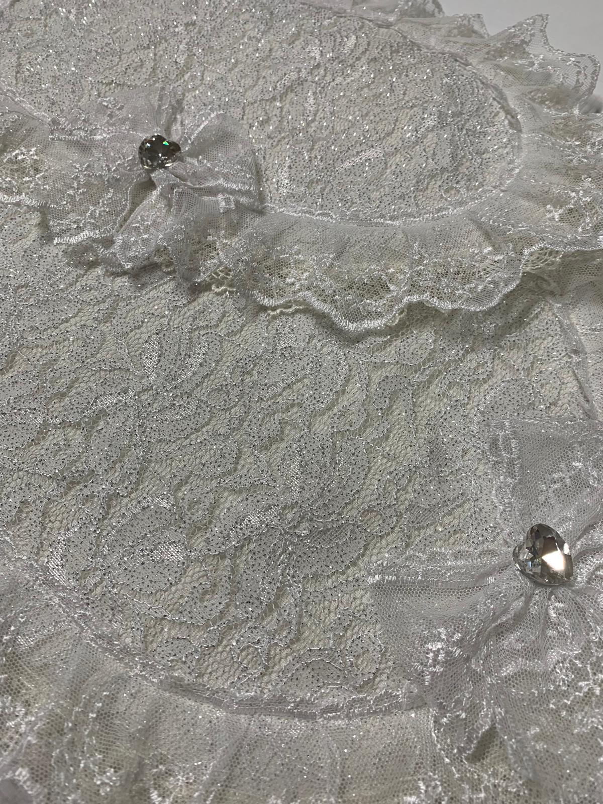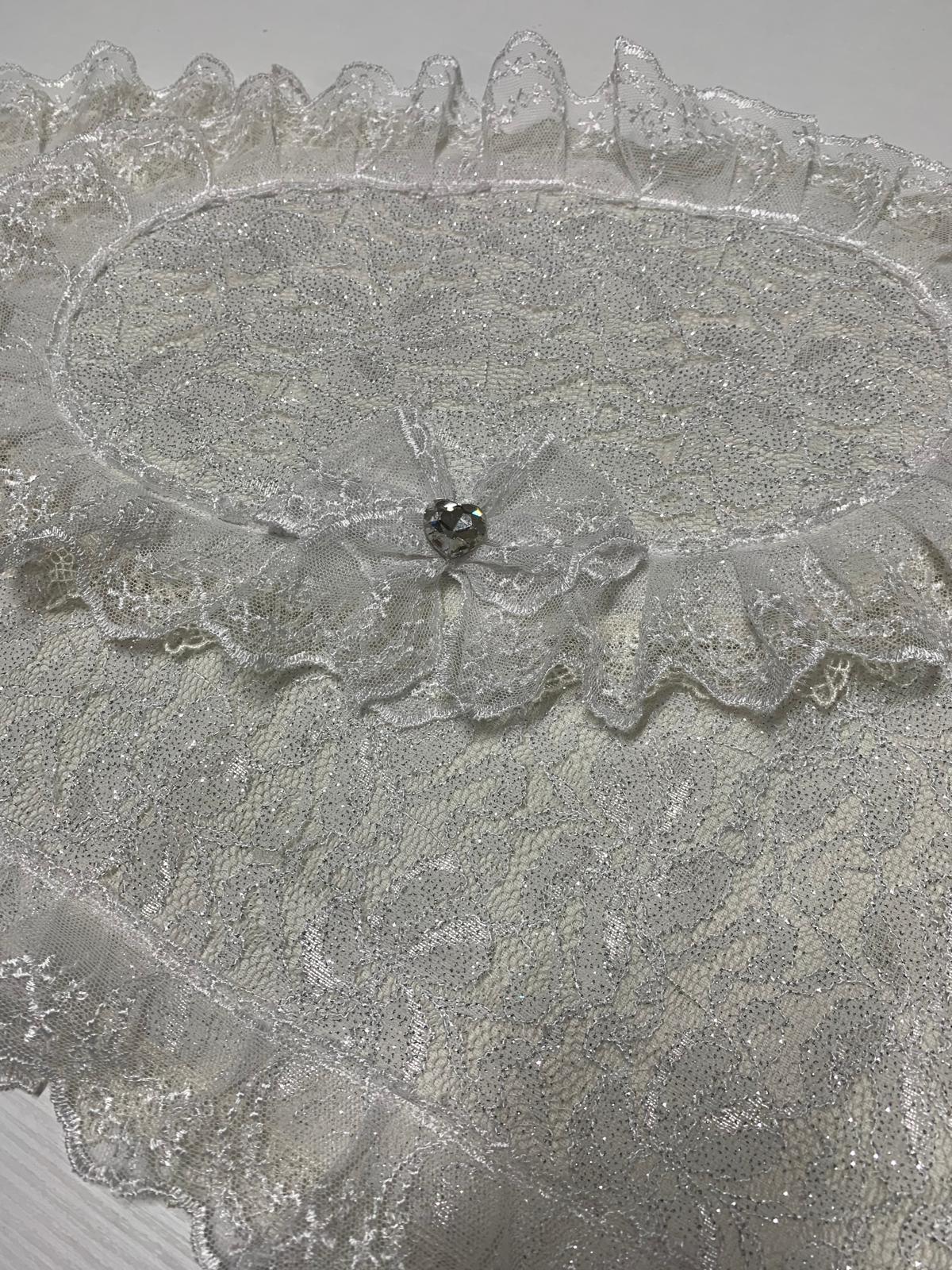 Tris centri con pizzo argento foderati con damasco in seta e trapuntino con bordi in pizzo macramè e pizzo in tulle bianco con 4 fiocchi in pizzo con un bellissimo cuore in sw.