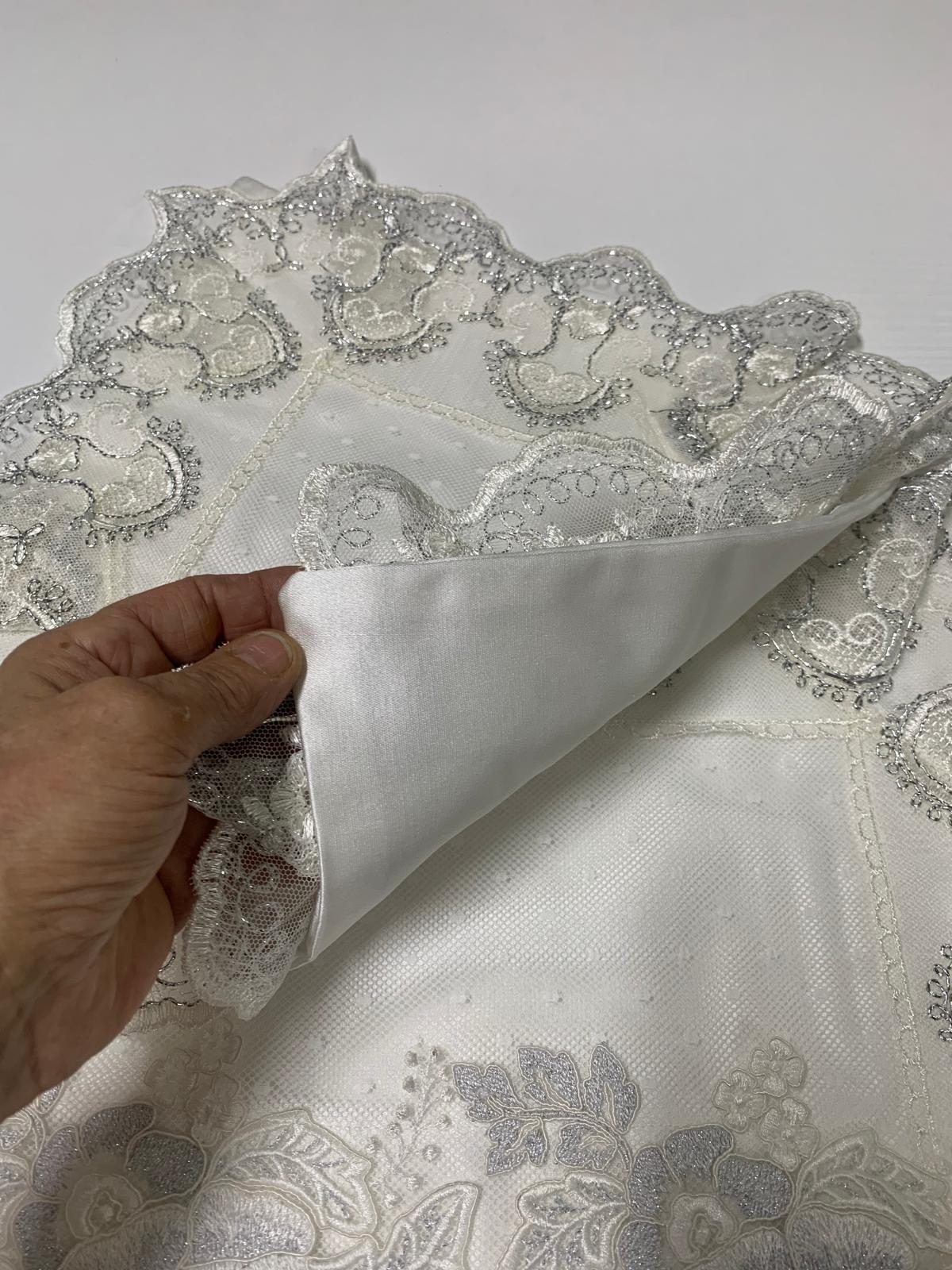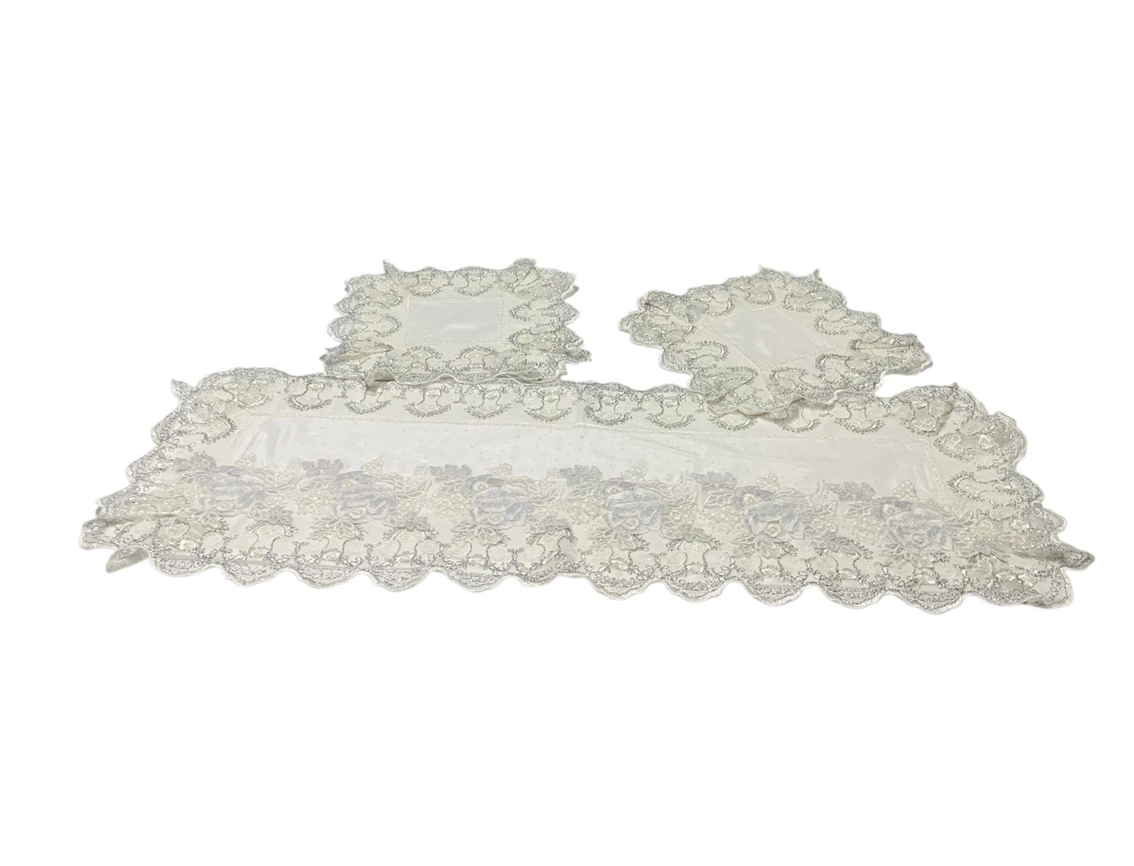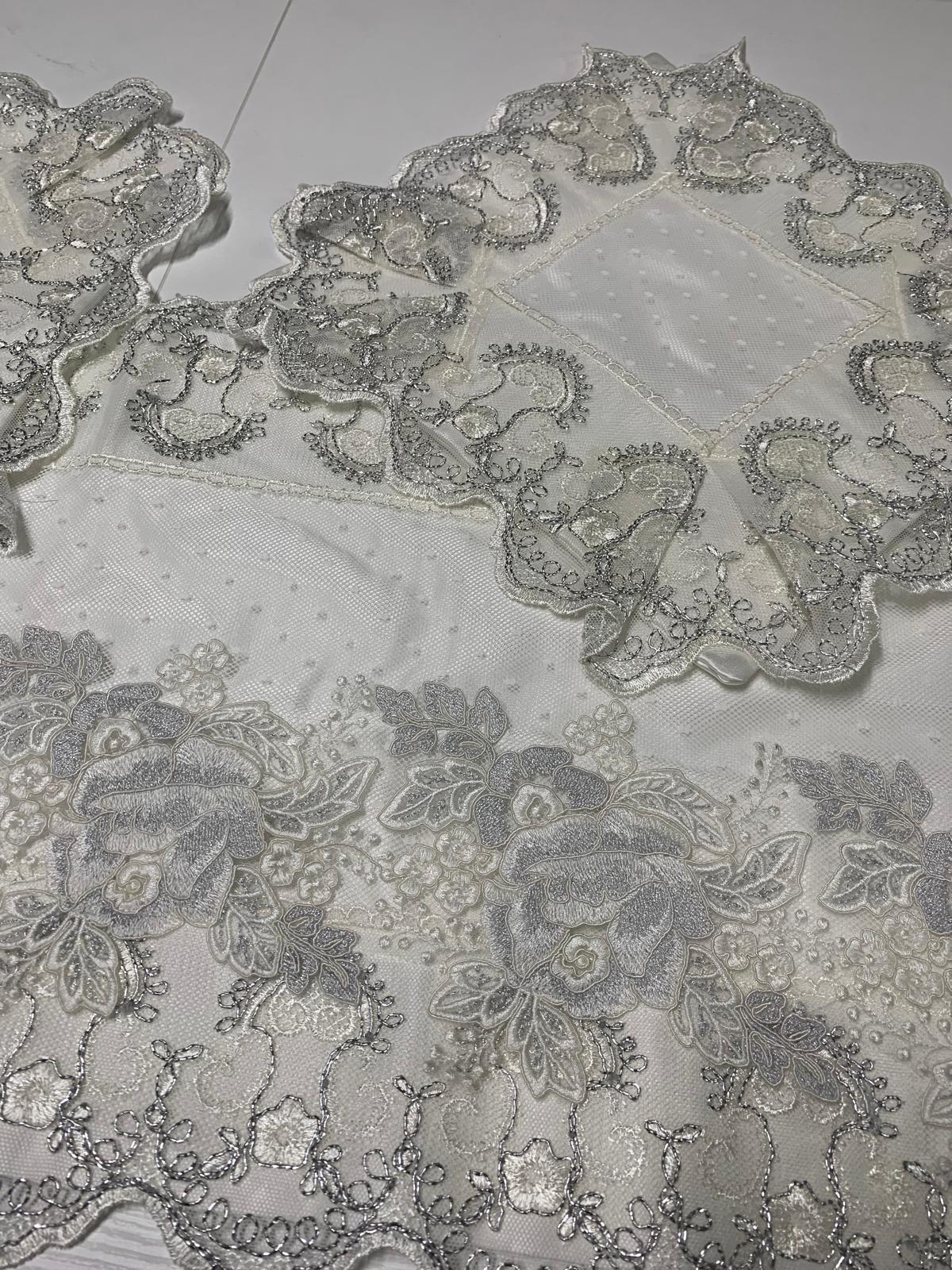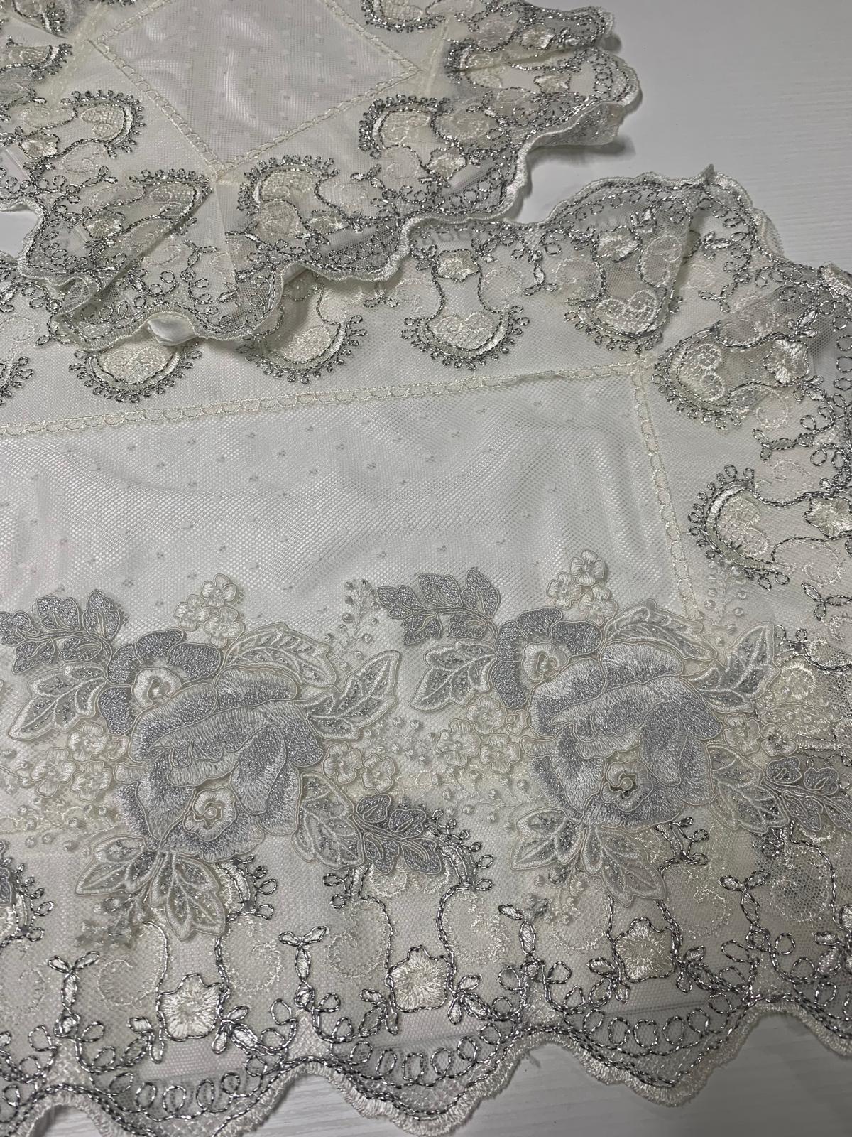 Tris centri damasco bianco in seta foderati e rifiniti con pizzo pois colore seta applicazioni di pizzo colore seta e argento lavorazione artigianale di nostra produzione.