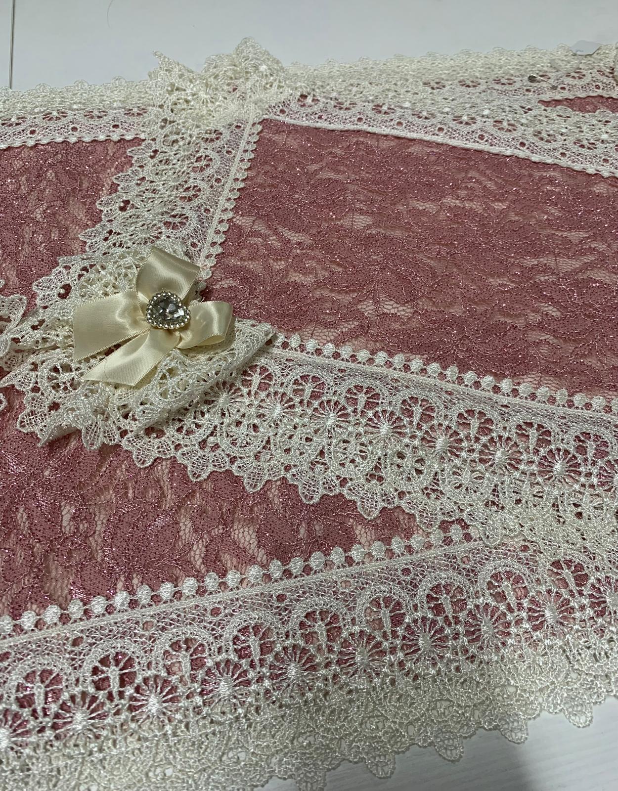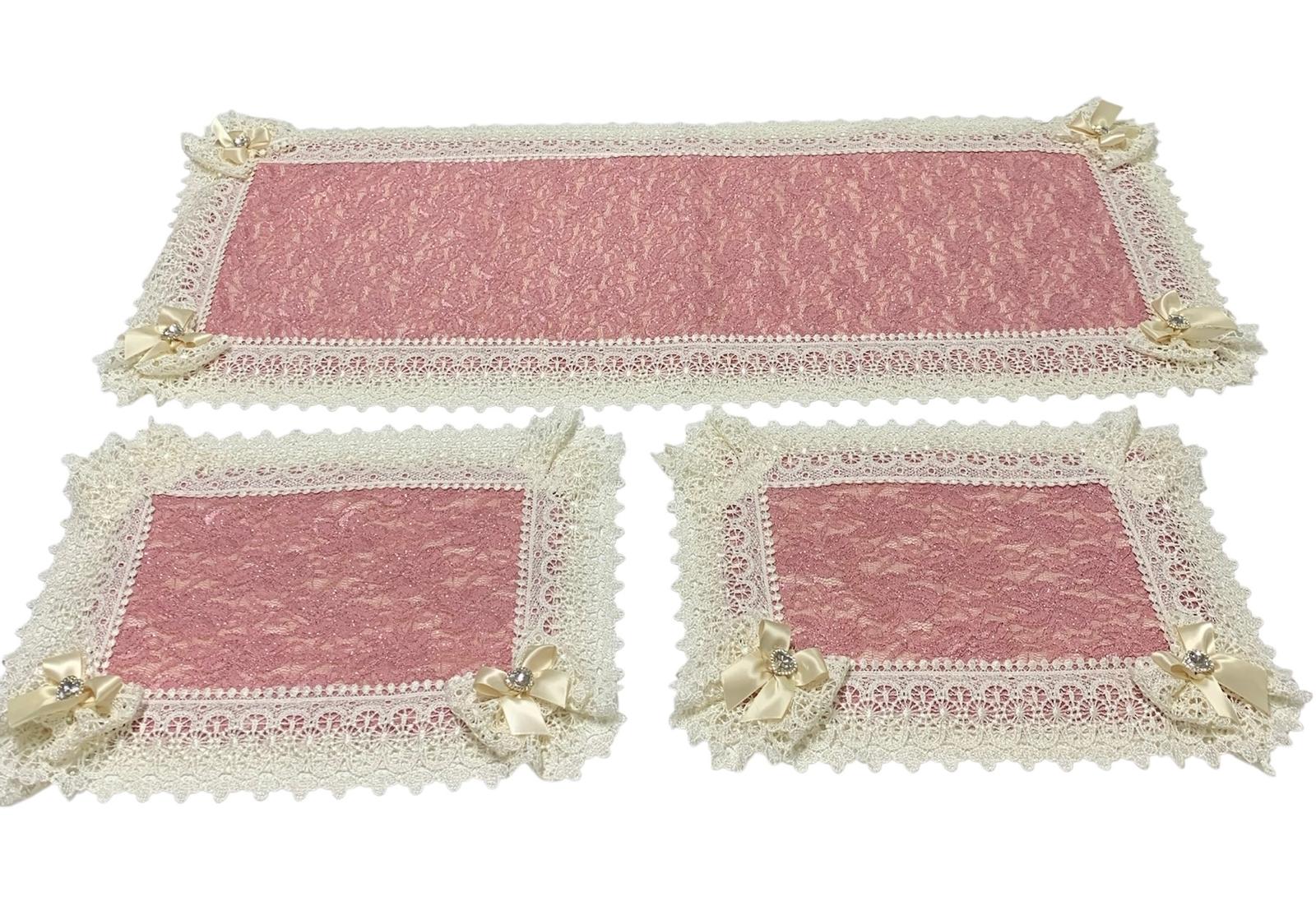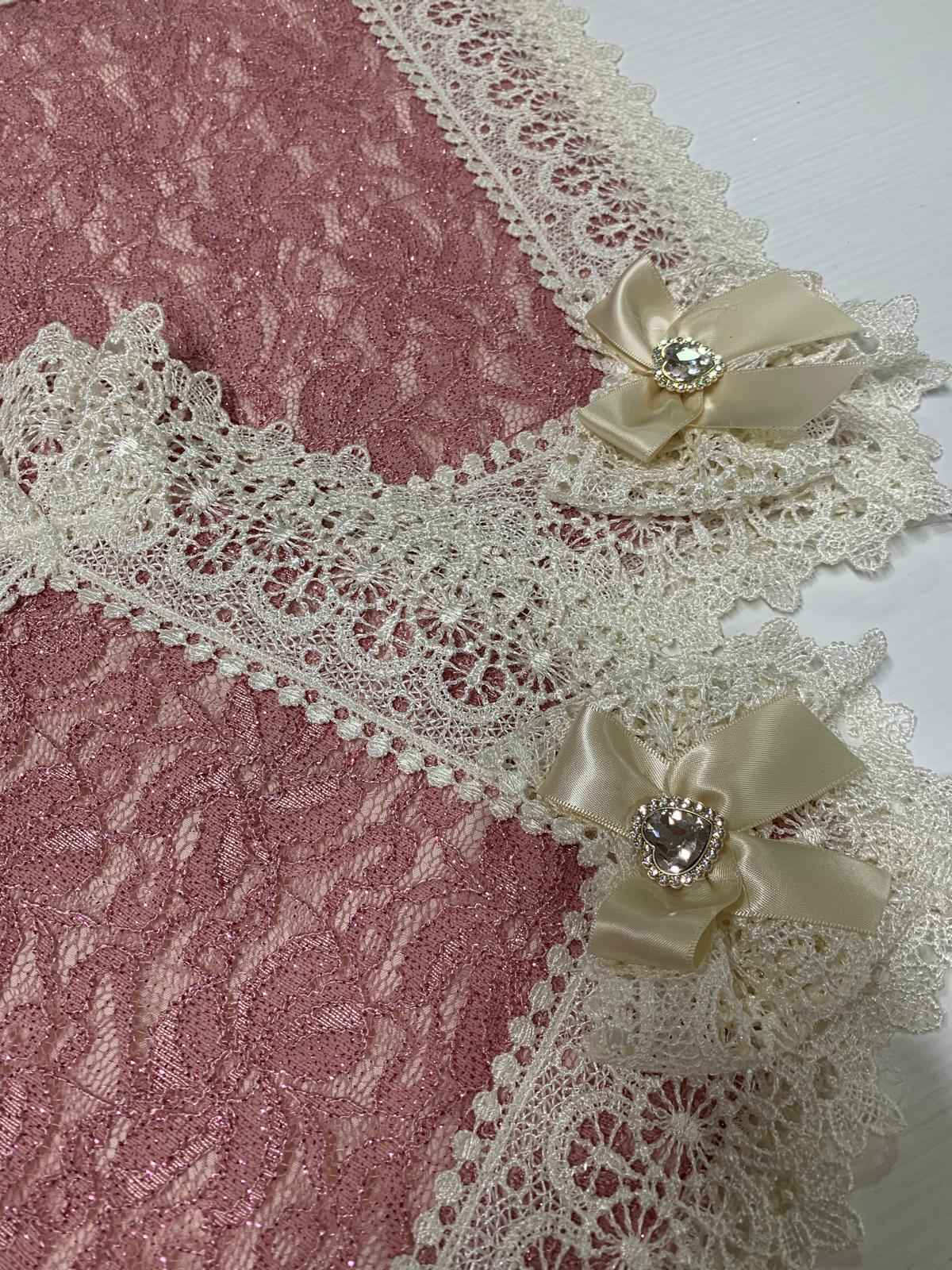 Tris centri rosa glitterato foderati con trapuntino e rifiniti con pizzo macramè di nostra produzione.
