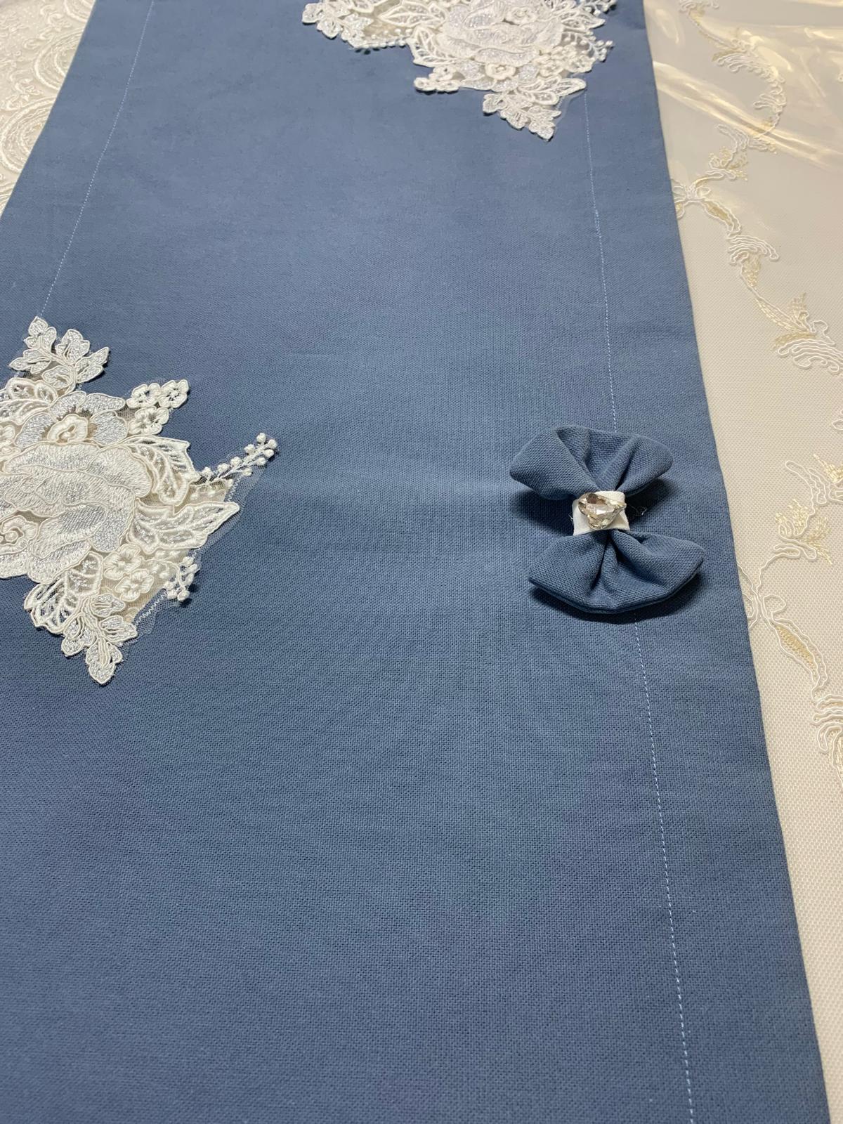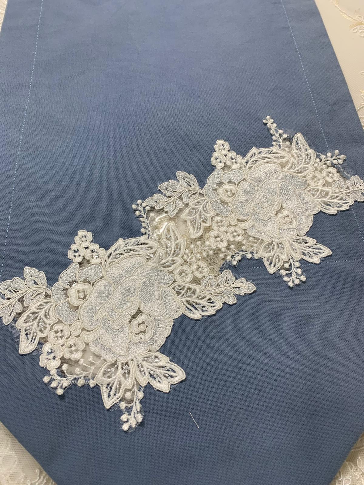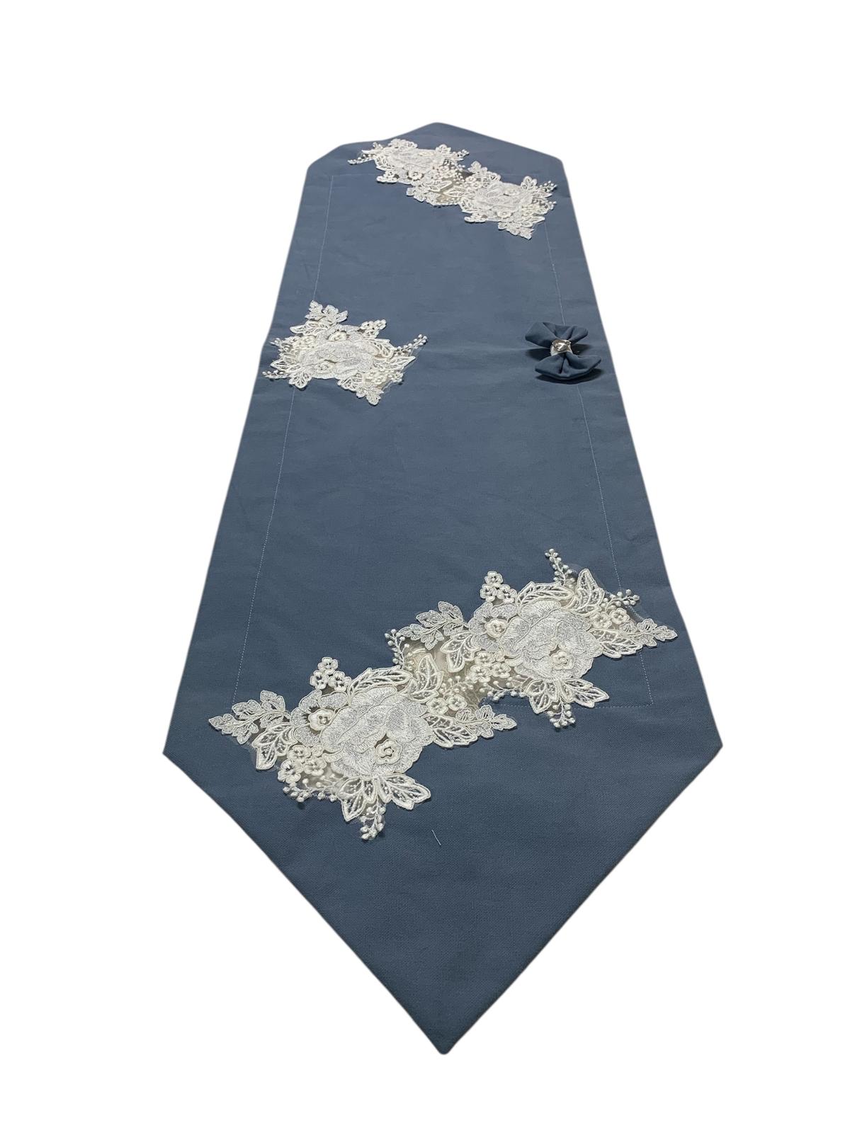 Runner azzurro polvere esagonale rifinito con pizzo avorio con sfumature argento intagliato a mano.