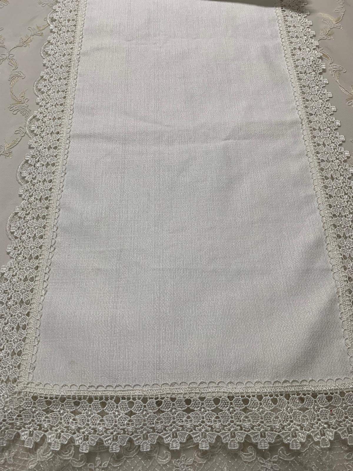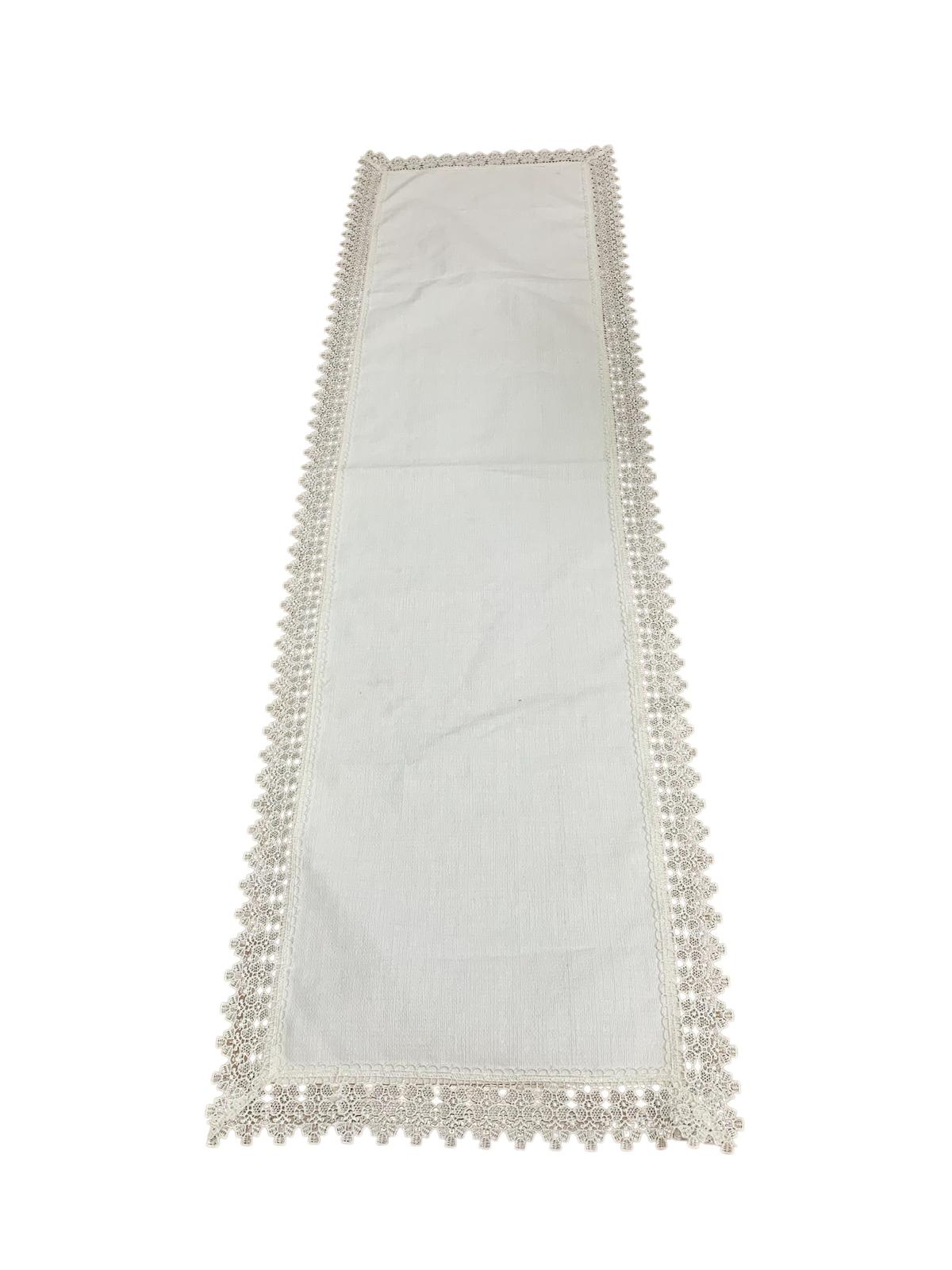 Runner in puro cotone bianco millerighe pesante rifinito con macramè panna chiaro.