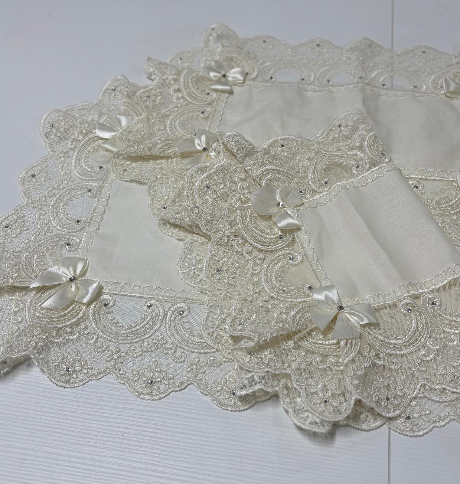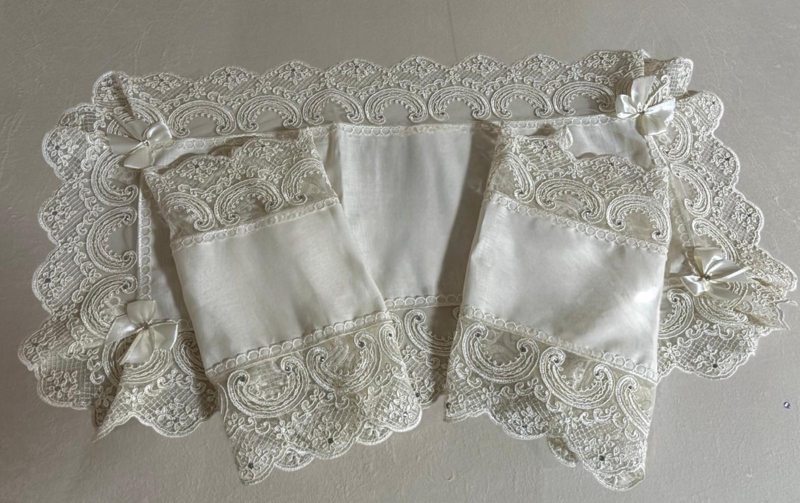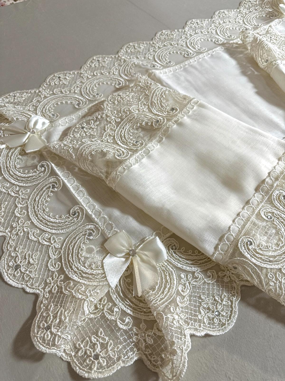Tris centri in puro lino avorio decorati con pizzo rebrodè con swarovski e con fiocchi di raso bianchi con swarovki.