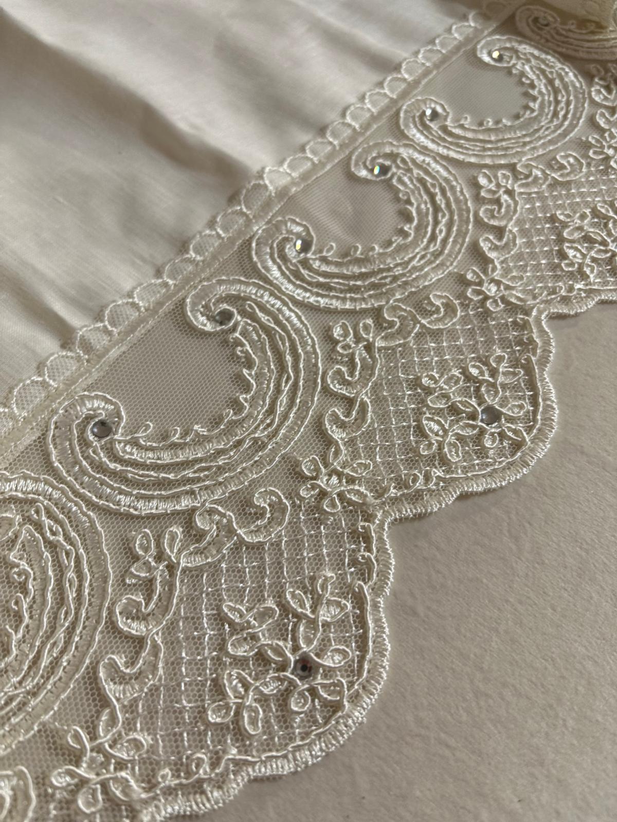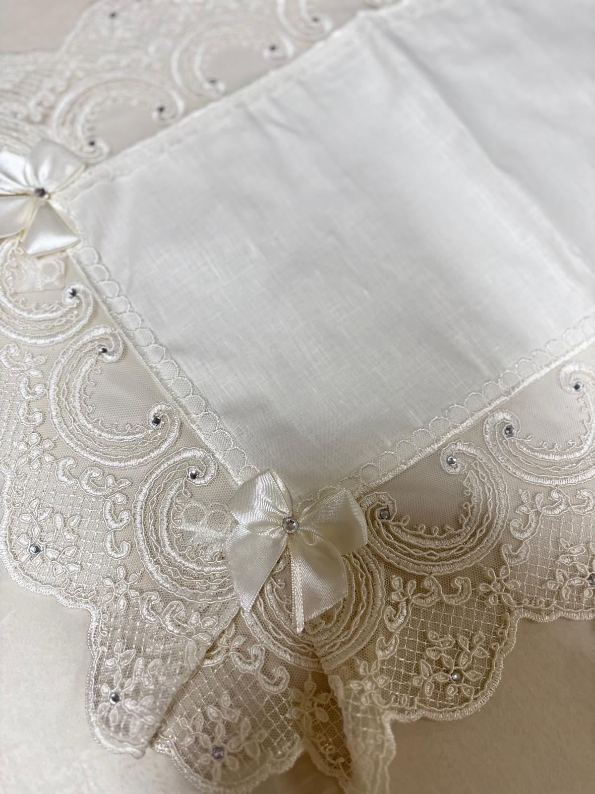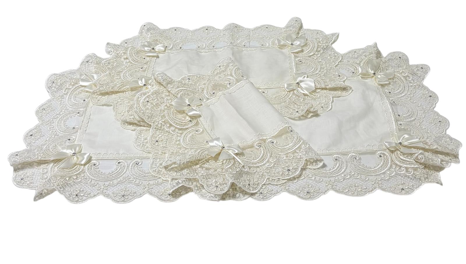 Tris centri in puro lino avorio decorati con pizzo rebrodè con swarovski e con fiocchi di raso bianchi con swarovki.