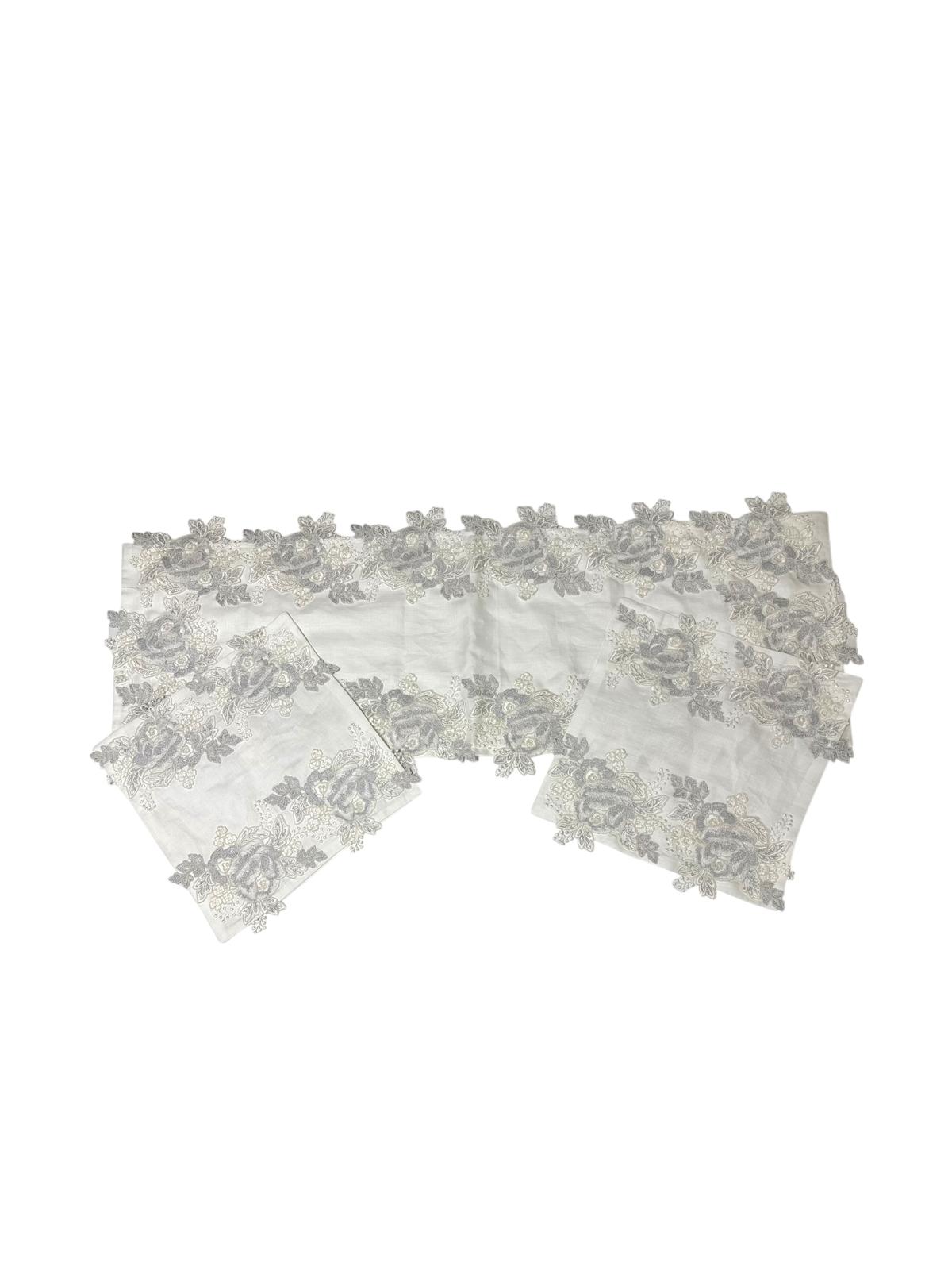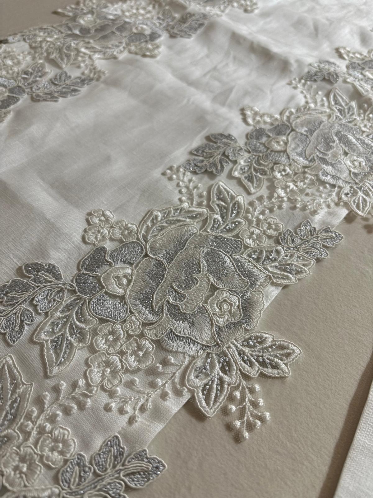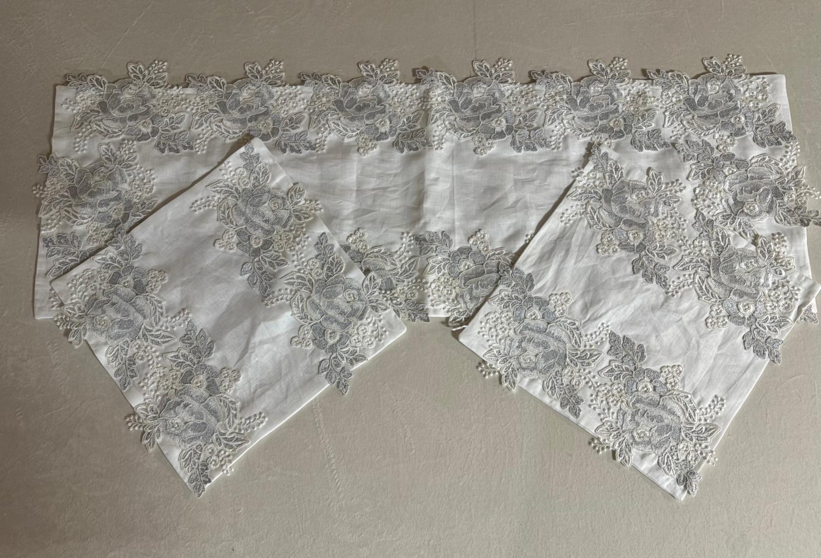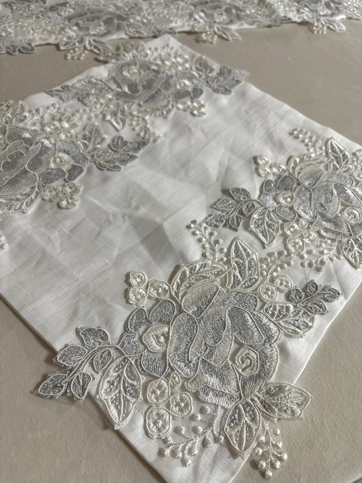 Tris centri in puro lino bianchi decorate con pizzo bianco e argento glitterato lavorazione artigianale.