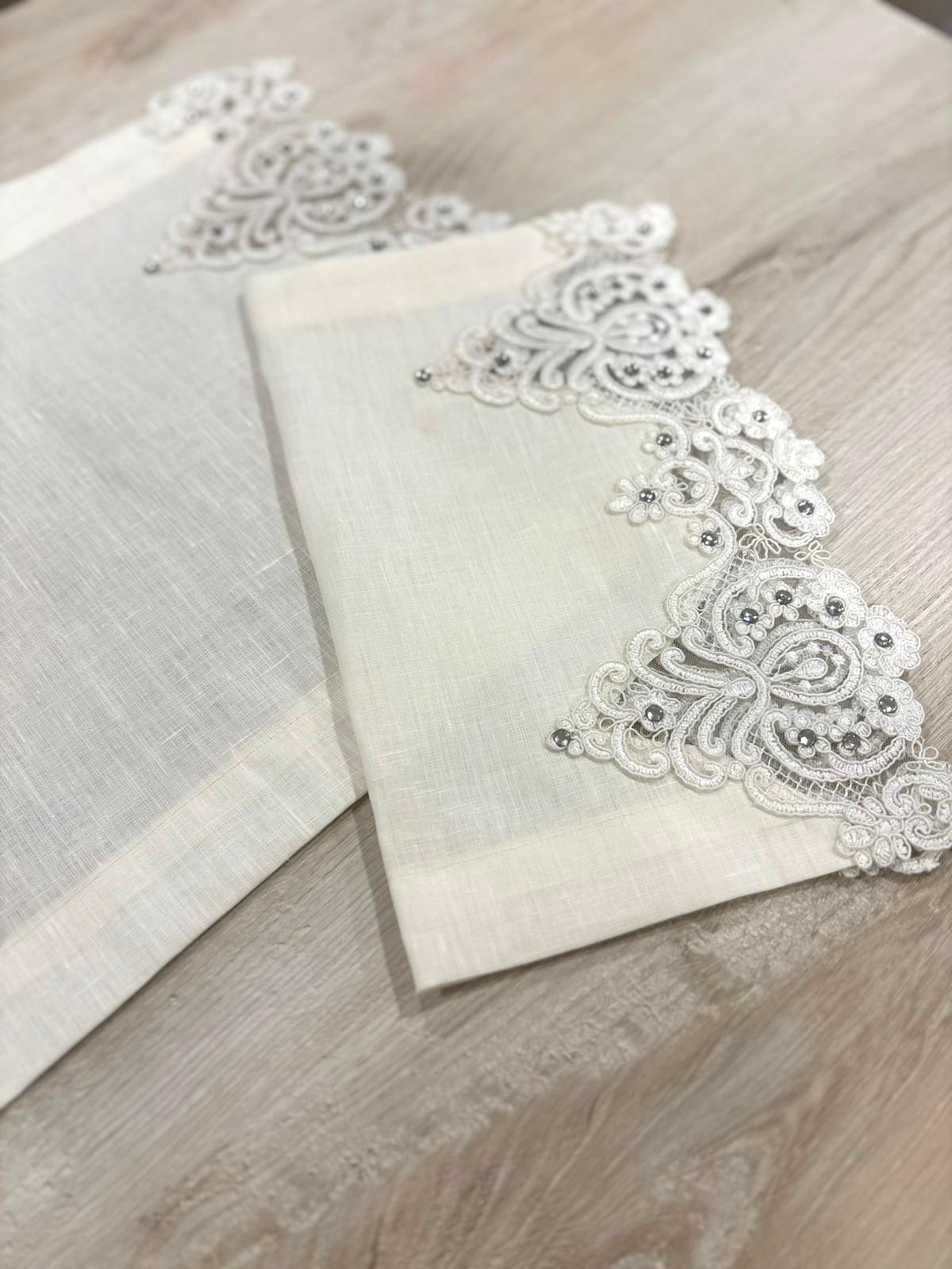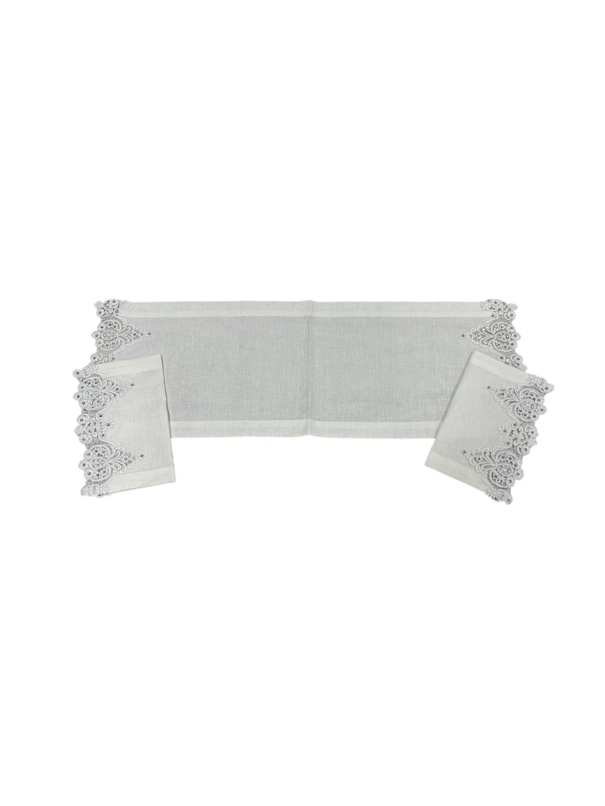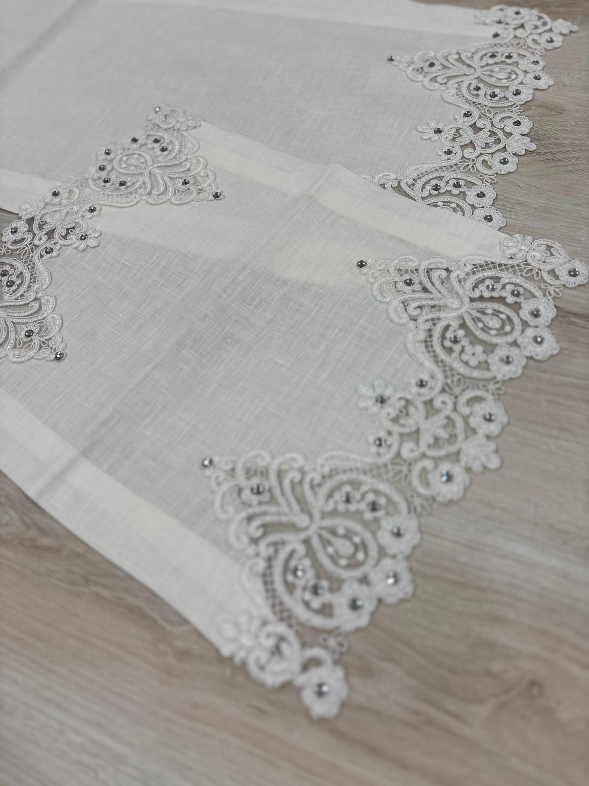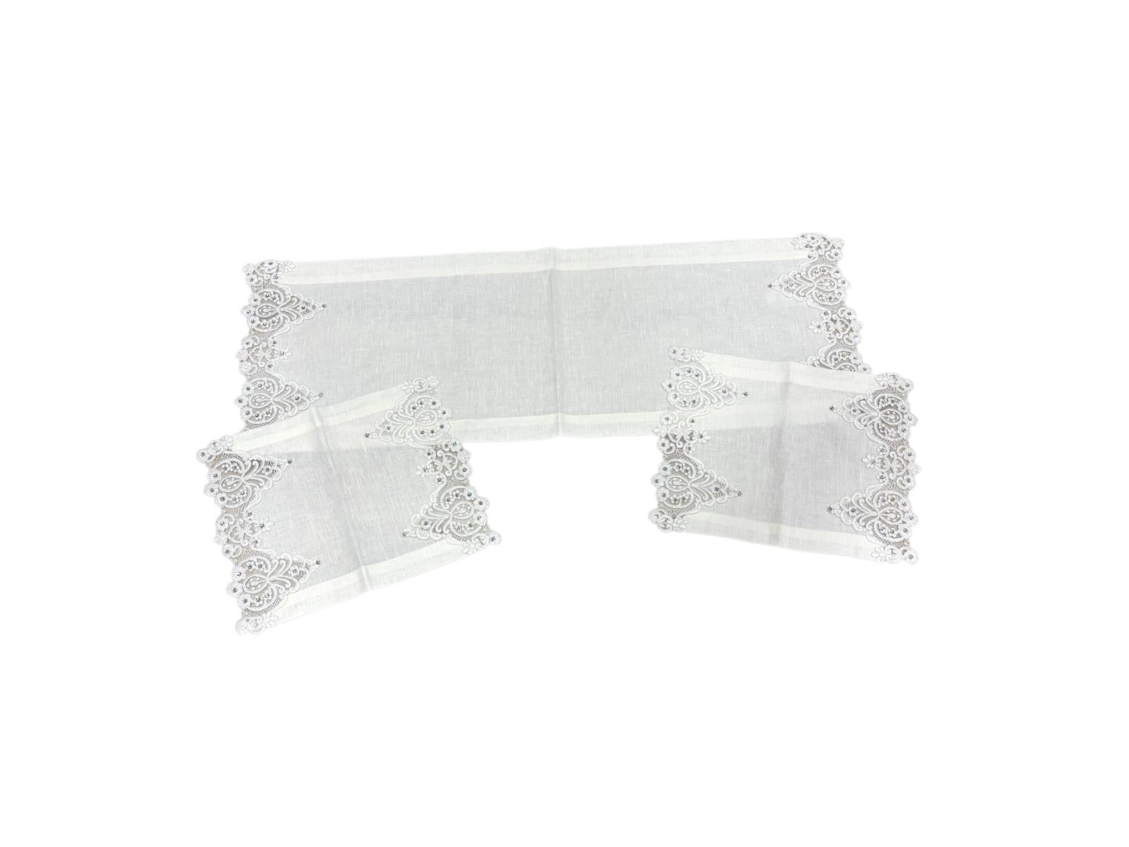 Tris centri in puro lino avorio decorati con pizzo con swarovski. Lavorazione artigianale.