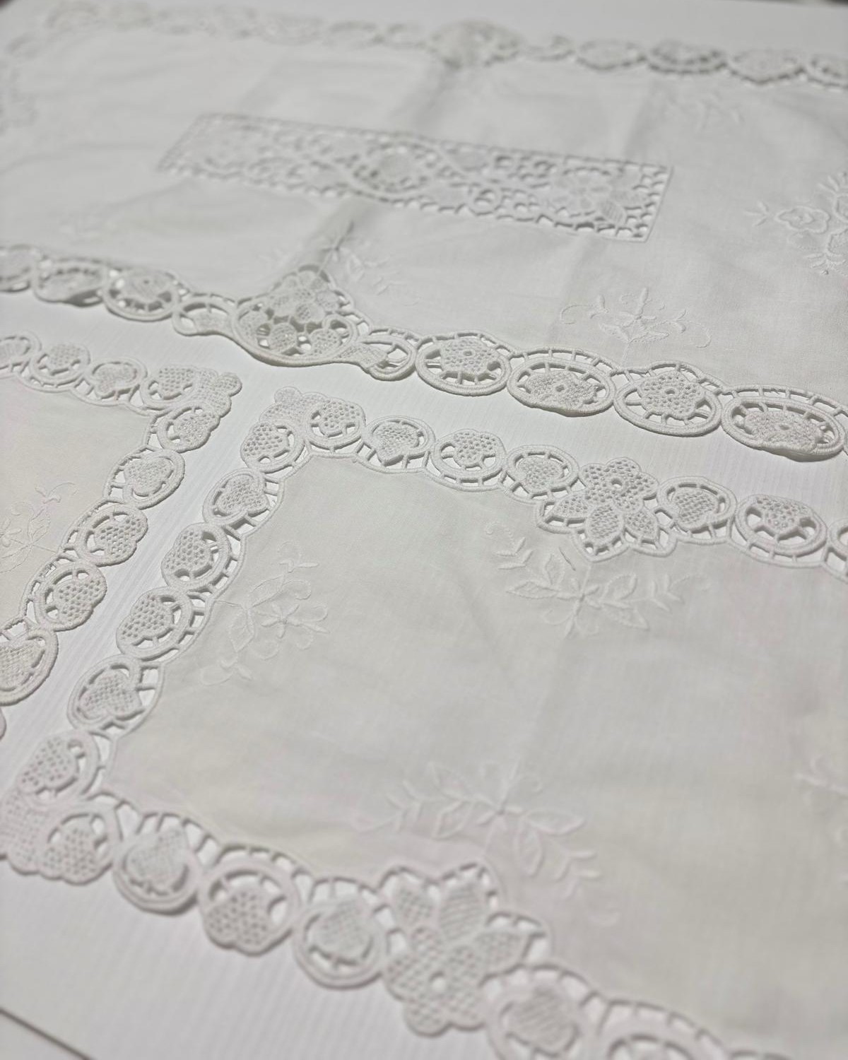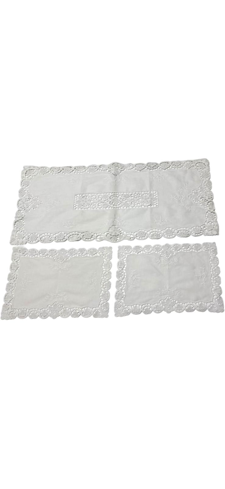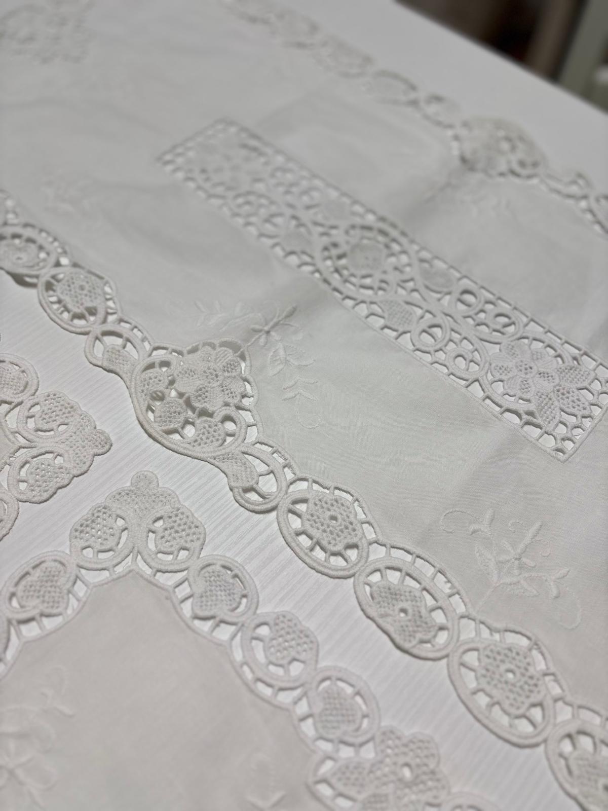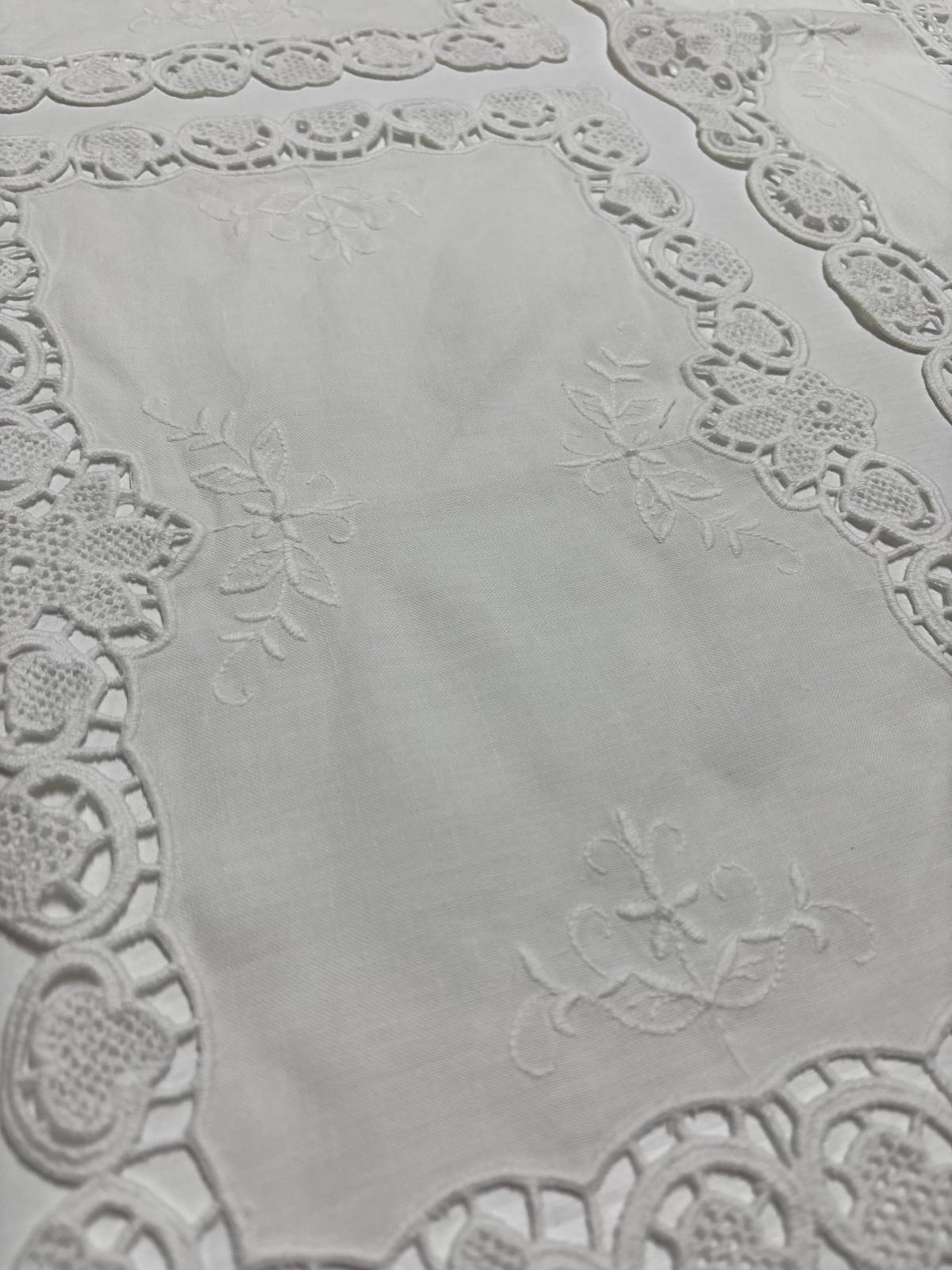 Tris centri in lino bianchi decorati con burano bianco. Lavorazione artigianale.