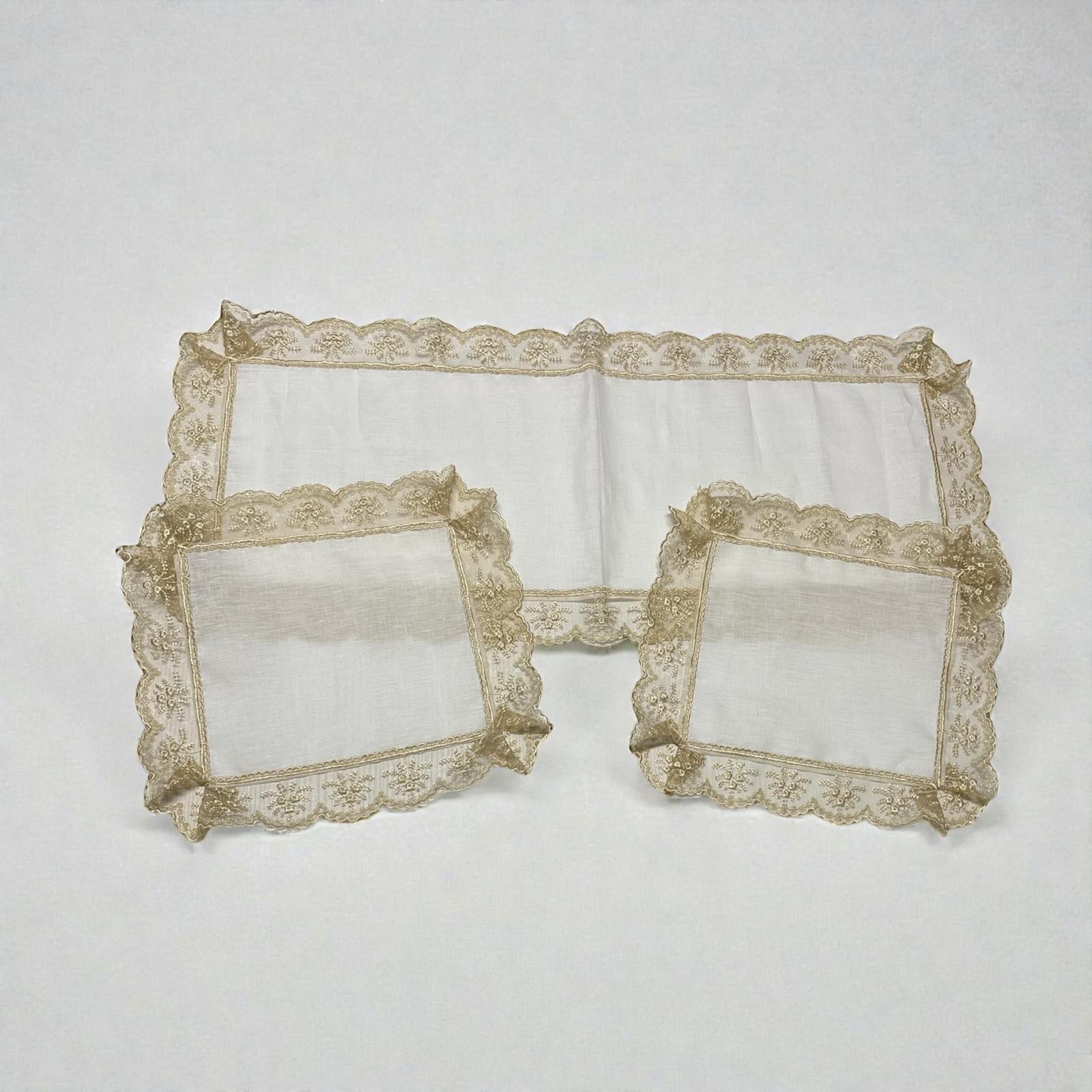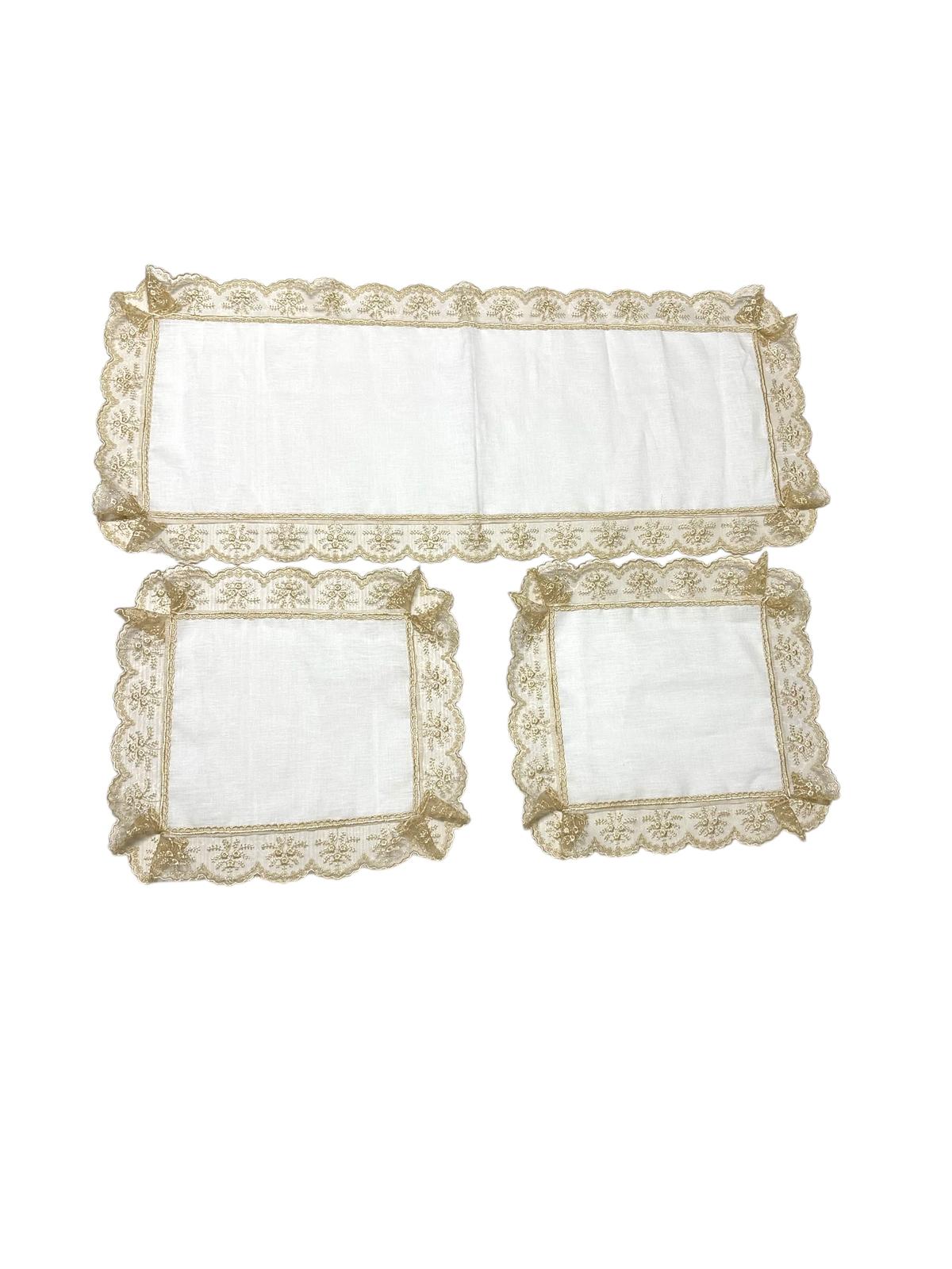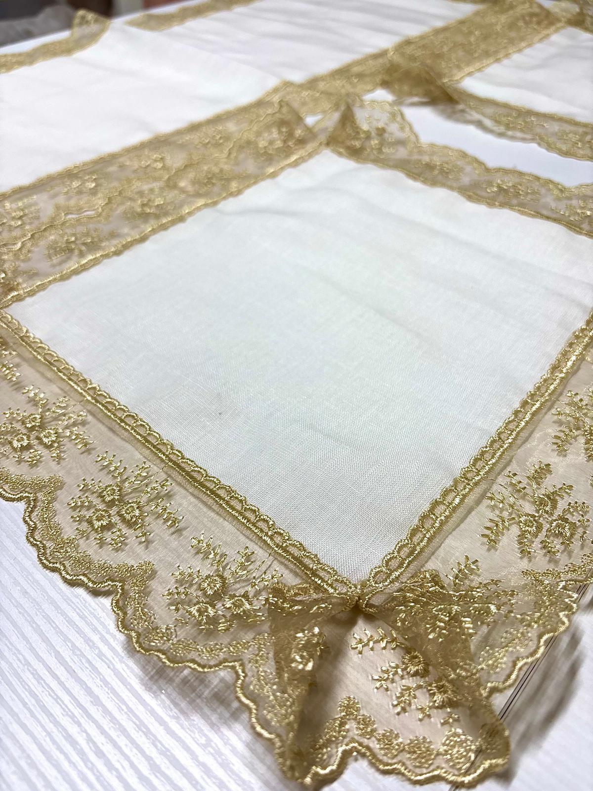 Tris centri in lino avorio decorati con pizzo velato dorato. Lavorazione artigianale.