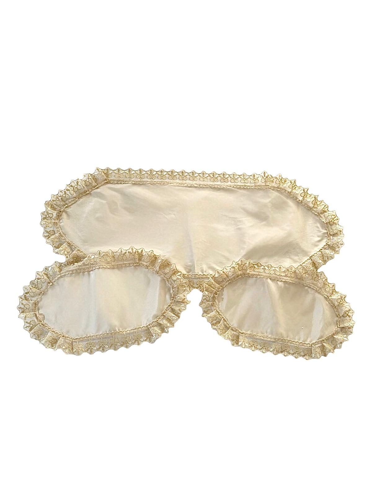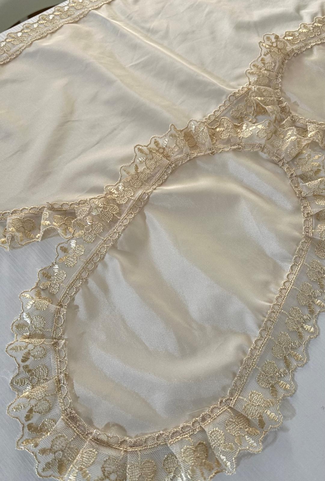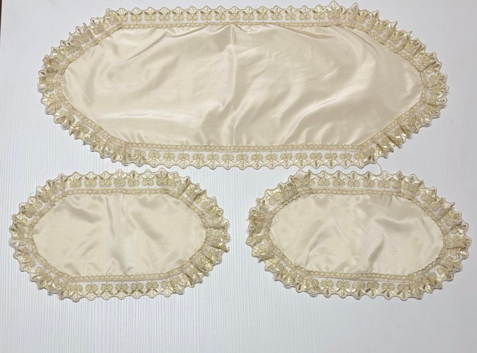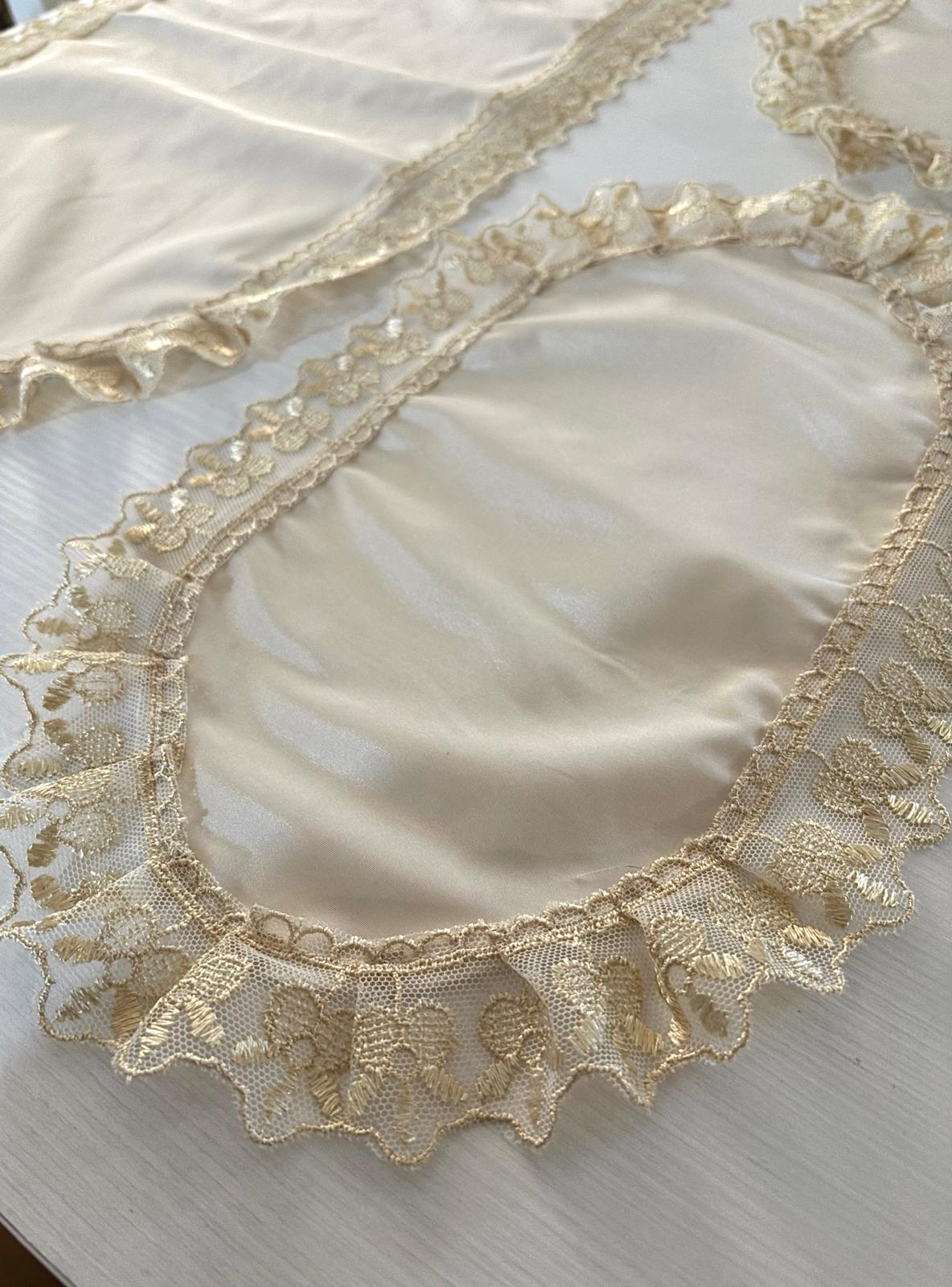 Tris centri avorio in taffettà decorati con pizzo oro antico. Lavorazione artigianale.