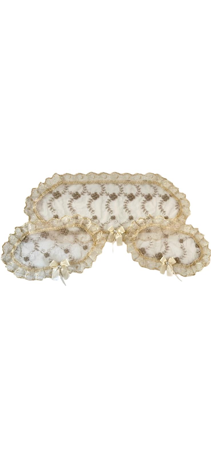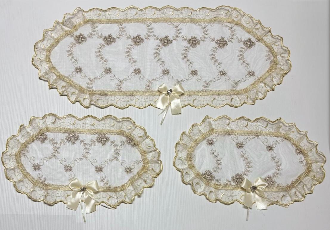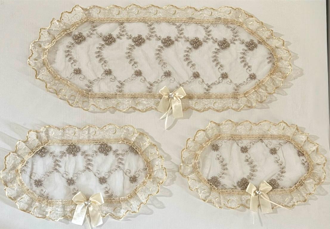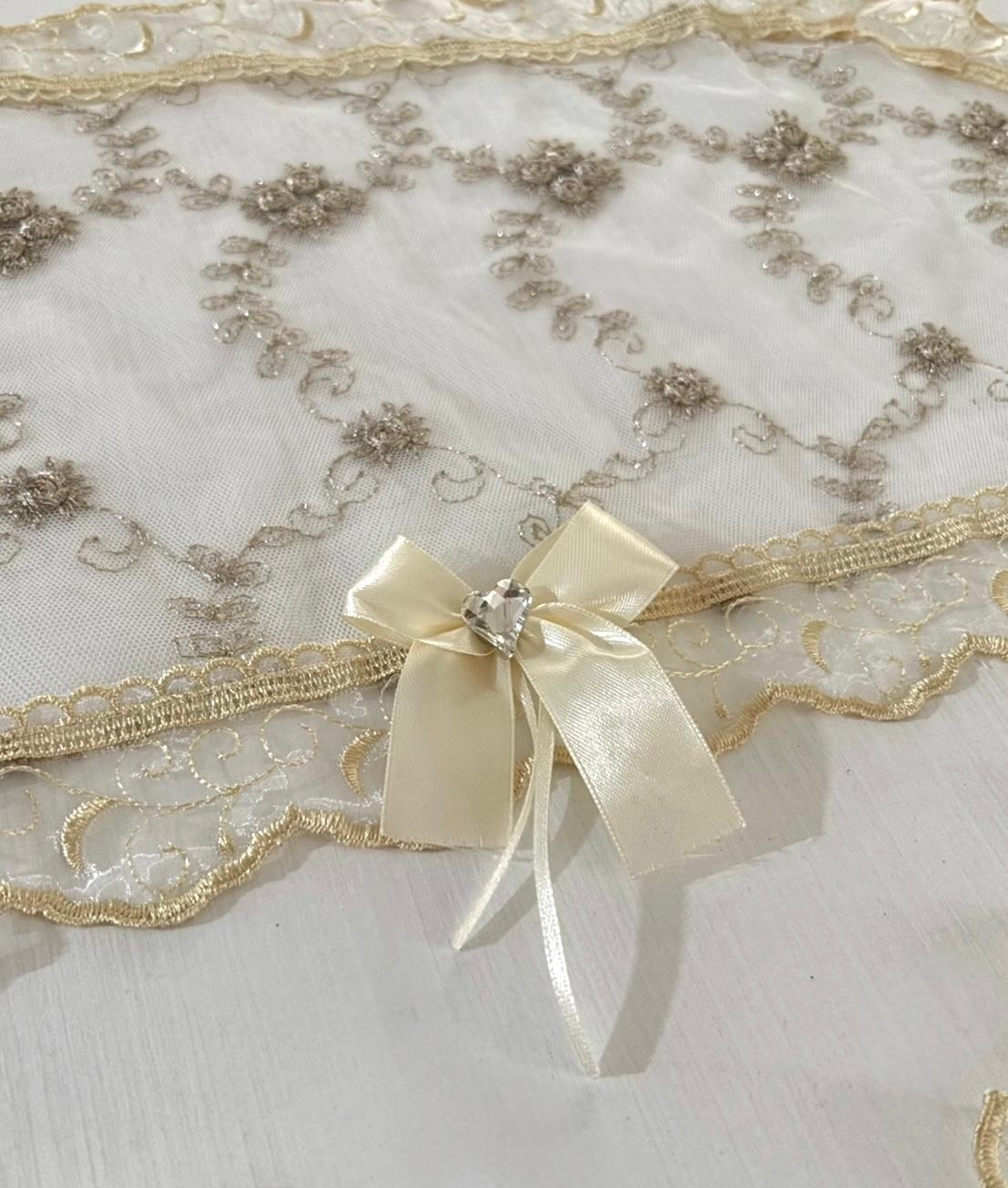Tris centri in tulle decorati con rose a rilievo, con pizzo oro antico e con fiocchi in raso avorio con brillantino a forma di cuore. Lavorazione artigianale.