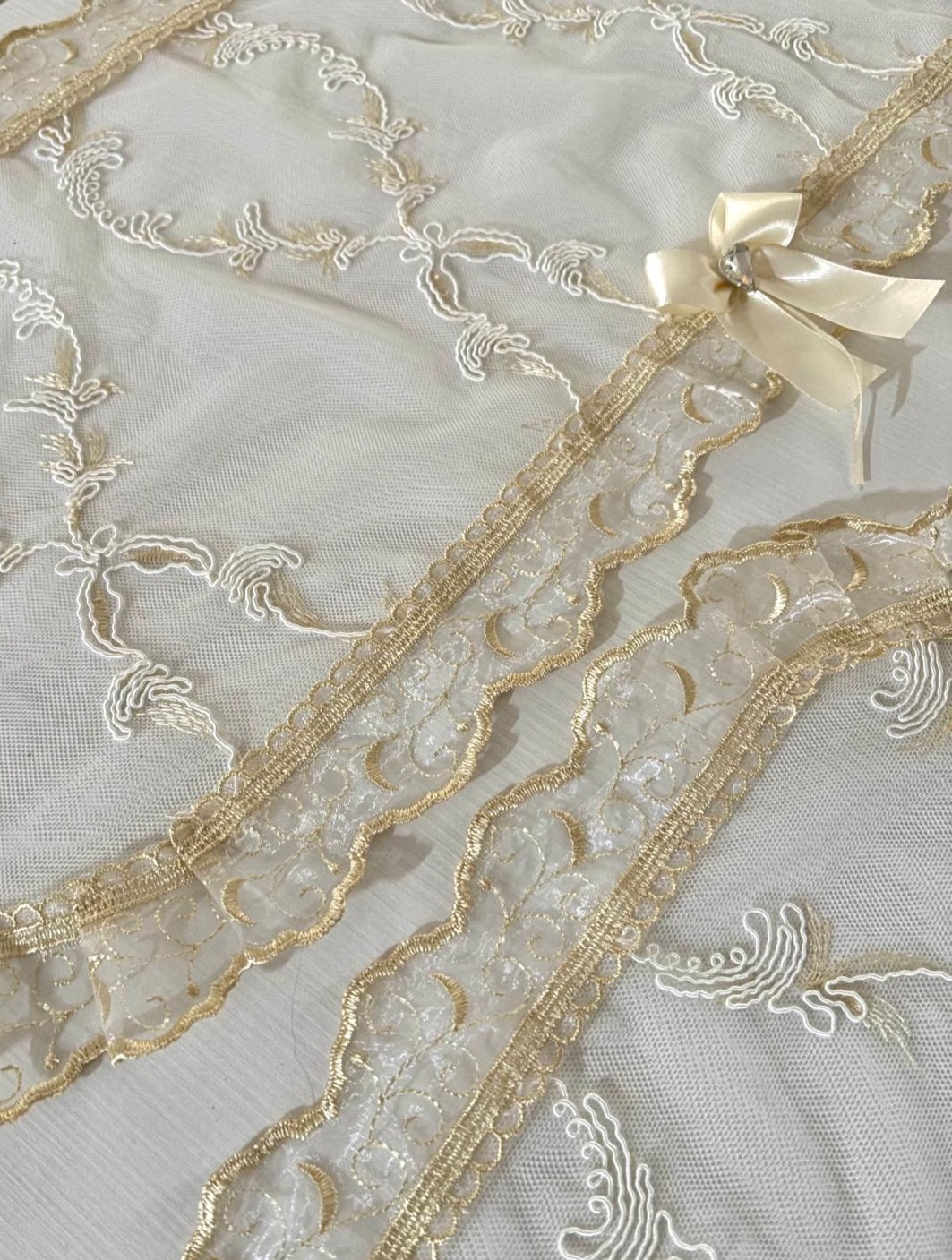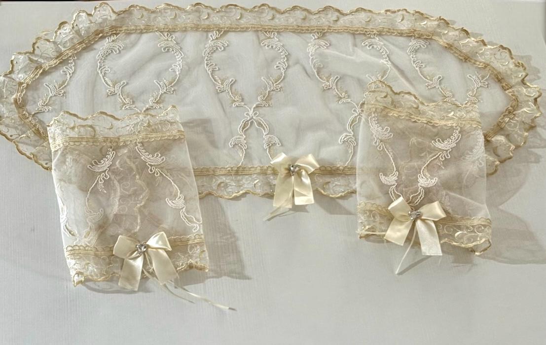 Tris centri in tulle decorati con pizzo oro antico e con fiocco in raso avorio con brillantino a forma di cuore. Lavorazione artigianale.