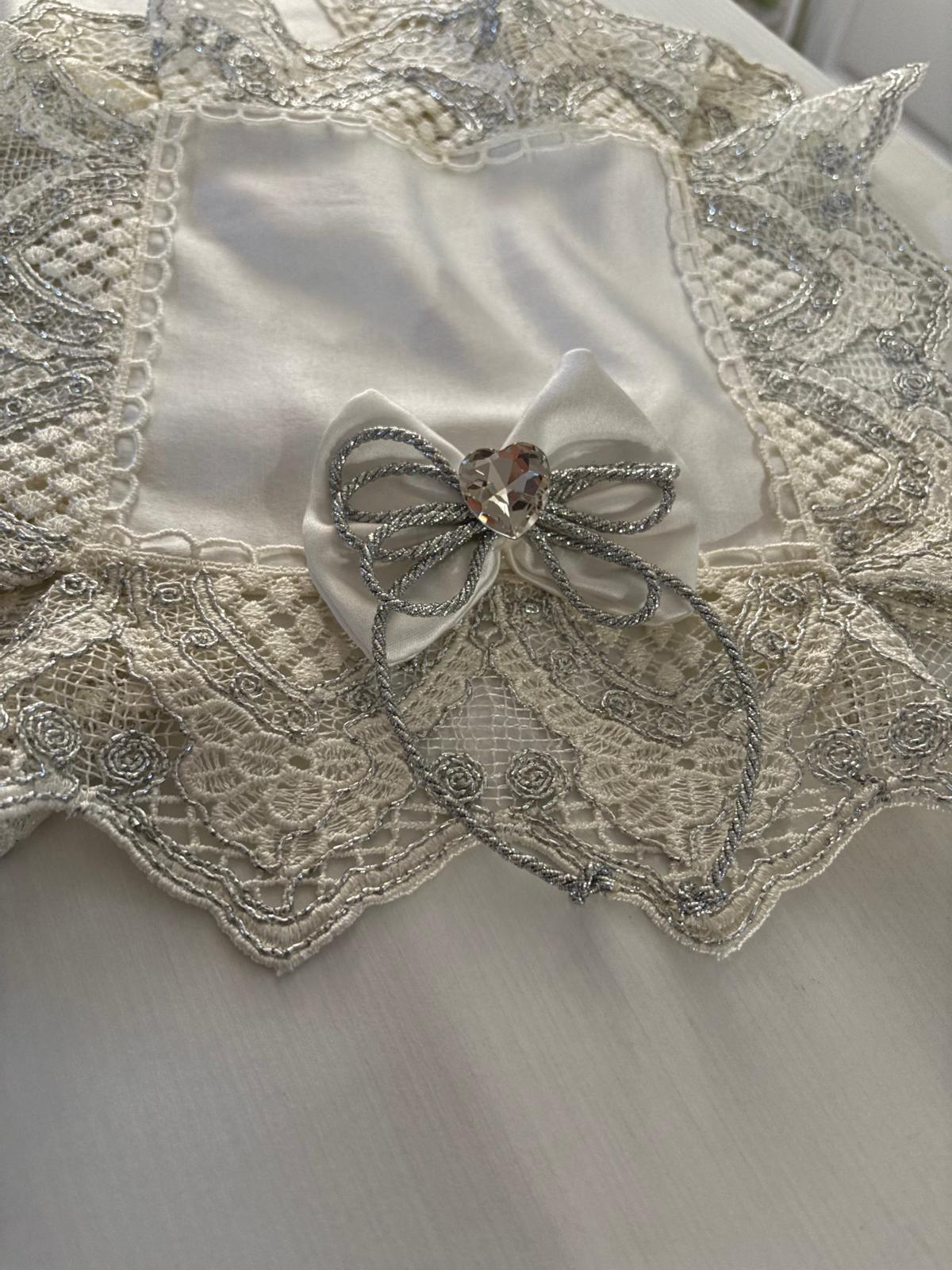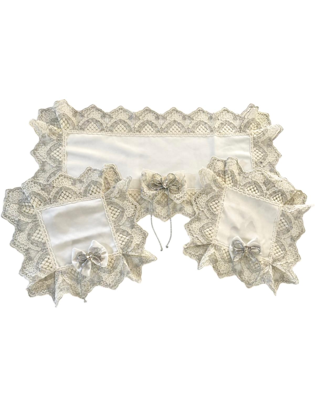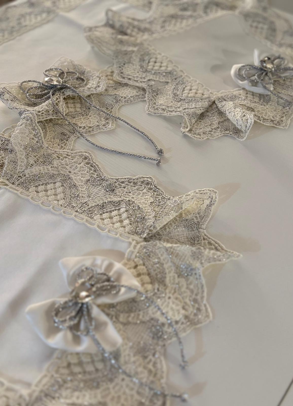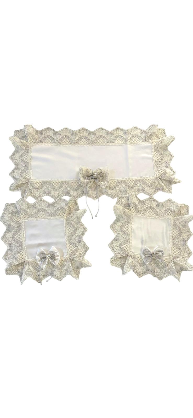 Tris centri in damasco in seta bianchi decorati con pizzo rebrodè bianco e argento, con fiocchi coordinati bianchi con fiocco argento e con brillantino a forma di cuore.