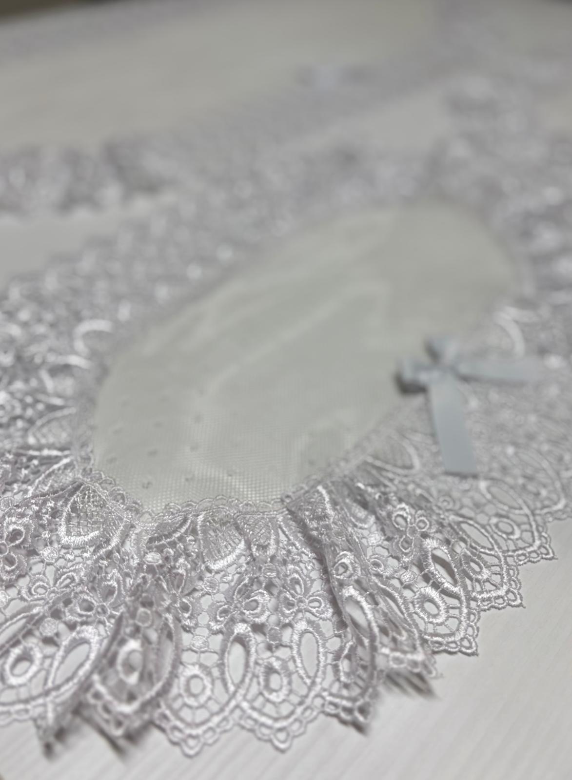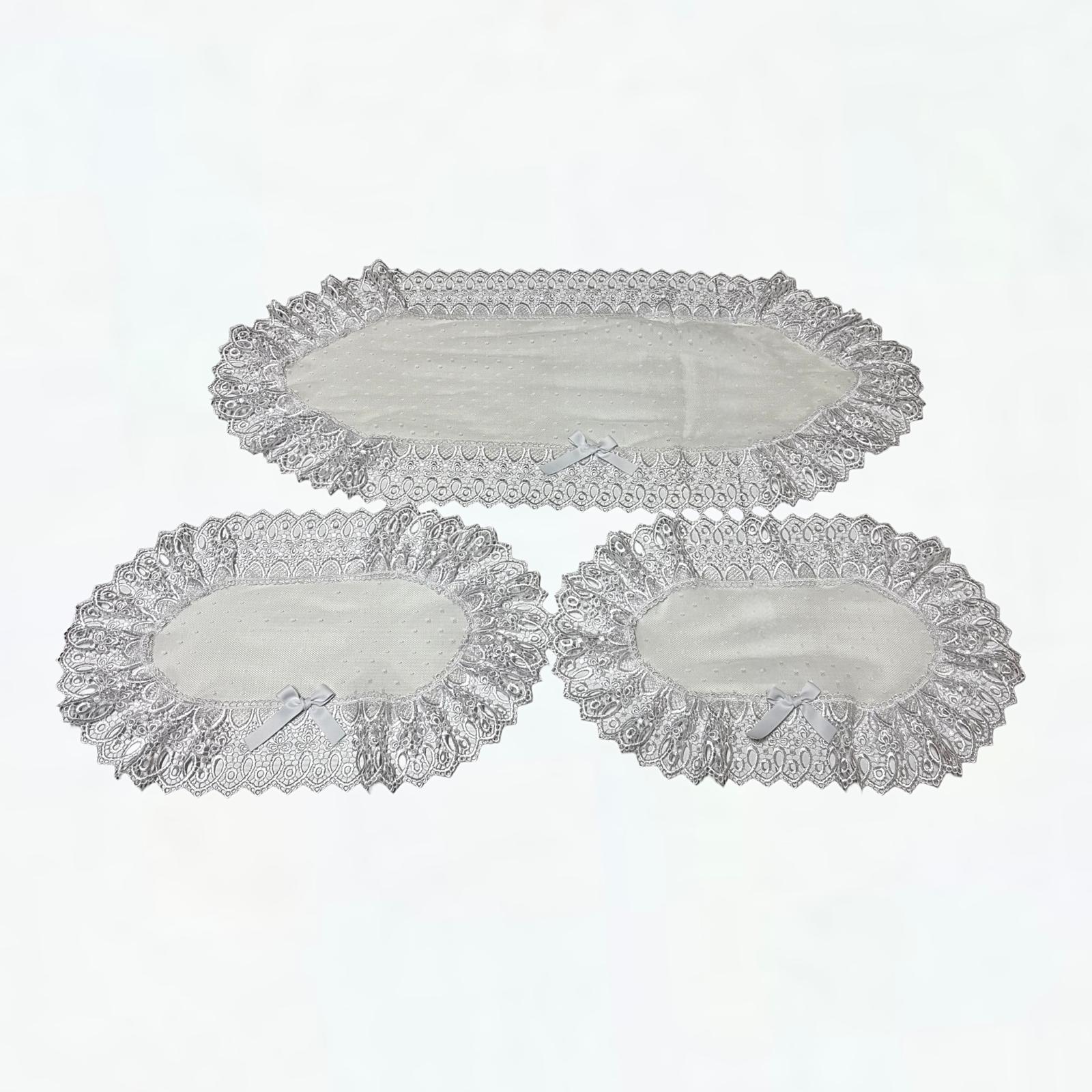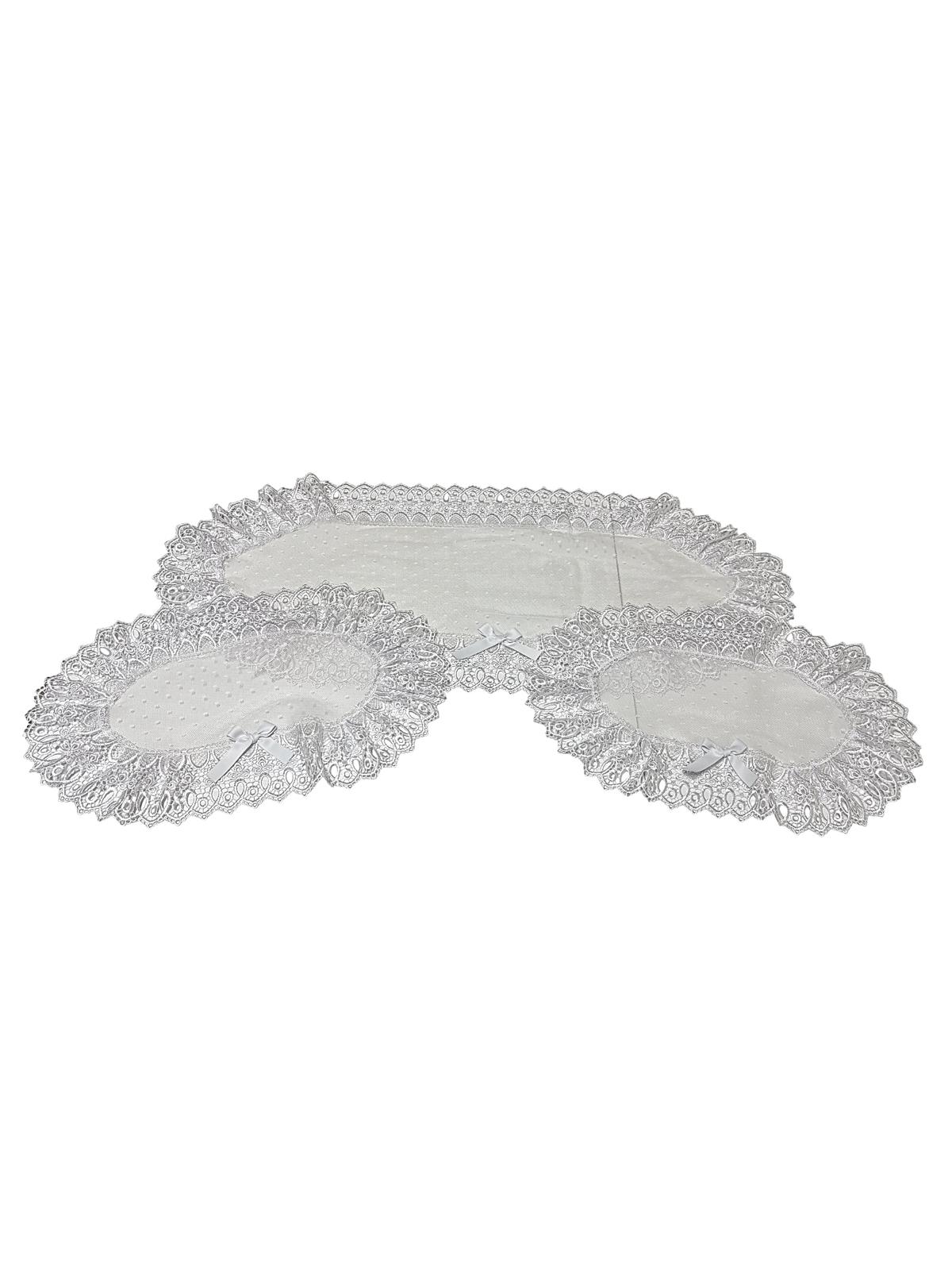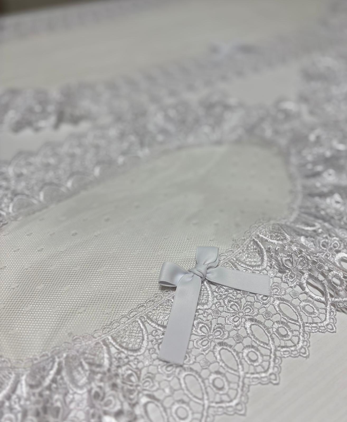 Tris centri in tulle pois bianco decorati con pizzo macramè e con fiocco in raso bianco.