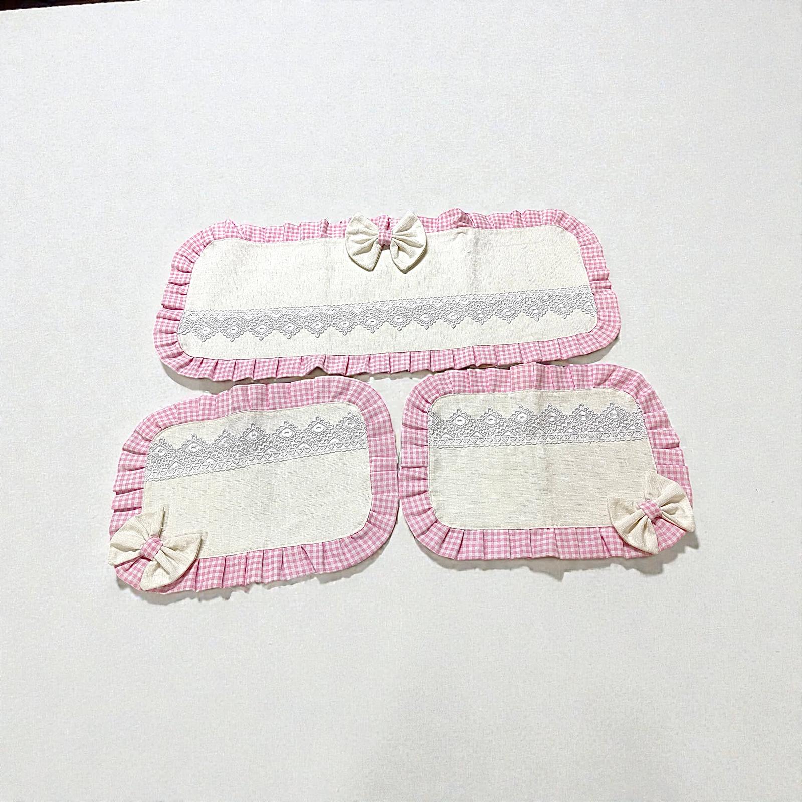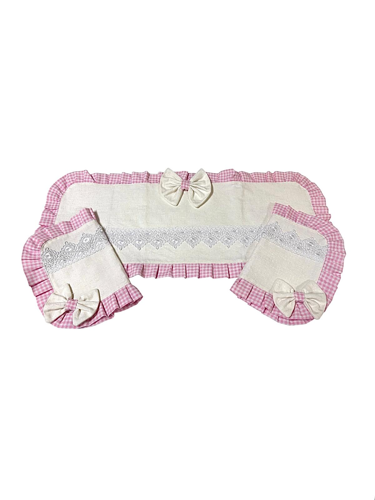 Tris centri in cotone rustico decorati con cotone liscio a quadretti rosa e bianchi, con fiocco bianco coordinato e con pizzo macramè bianco. Lavorazione artigianale.