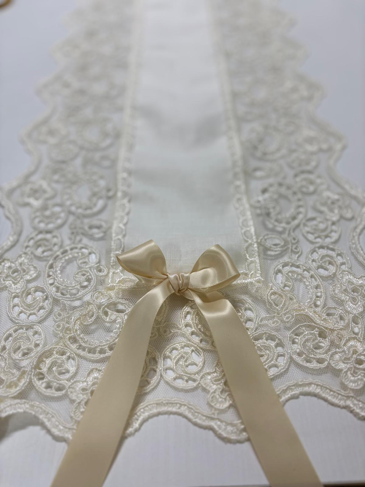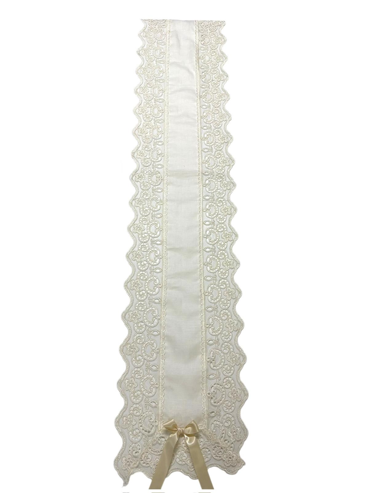 Runner avorio in lino decorato con pizzo rebrodè avorio e con fiocchi in raso avorio da entrambi i lati. Lavorazione artigianale.