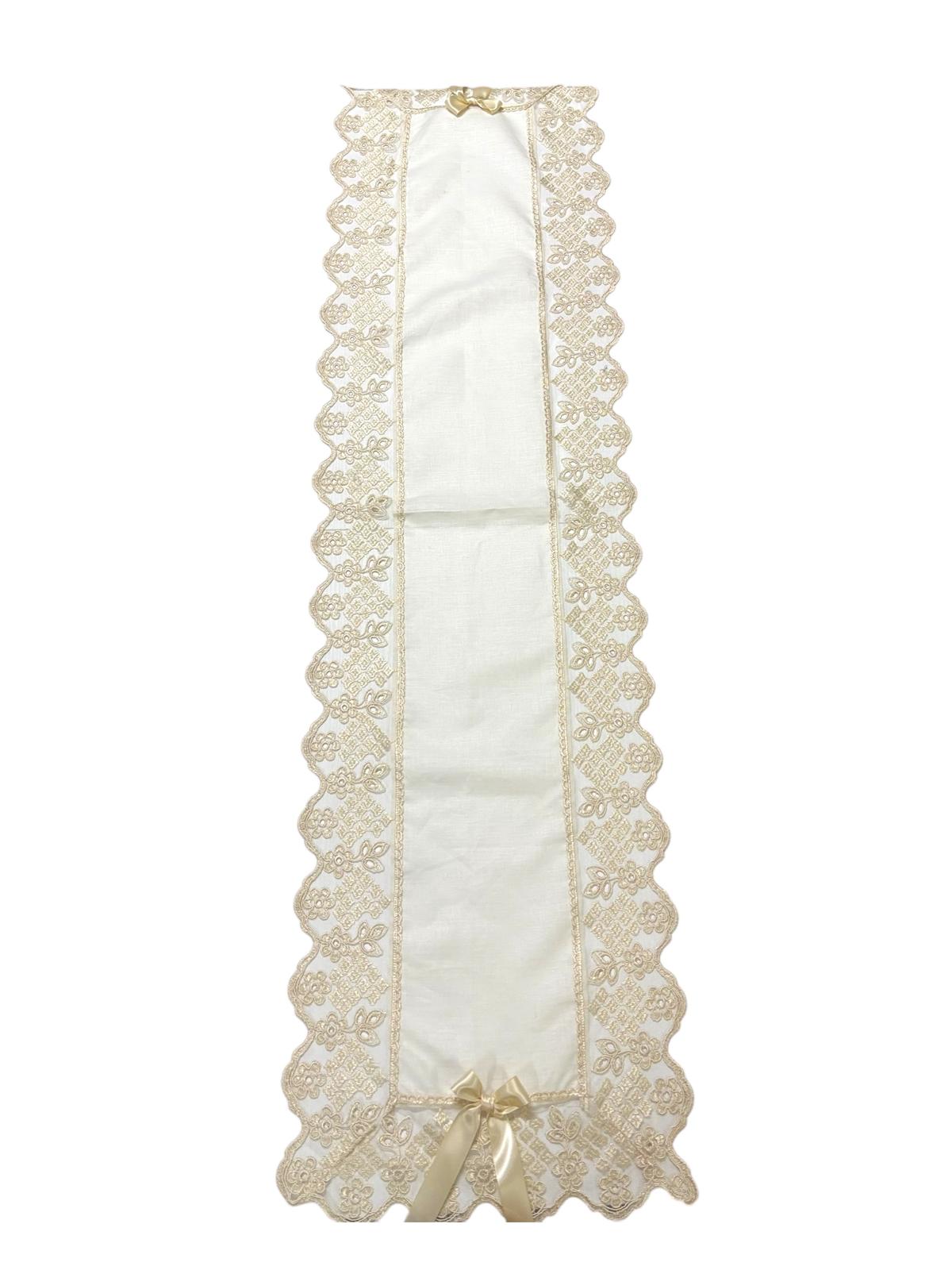 Runner avorio in lino avorio decorato con pizzo macramè crema e con fiocchi in raso avorio da entrami i lati. Lavorazione artigianale.
