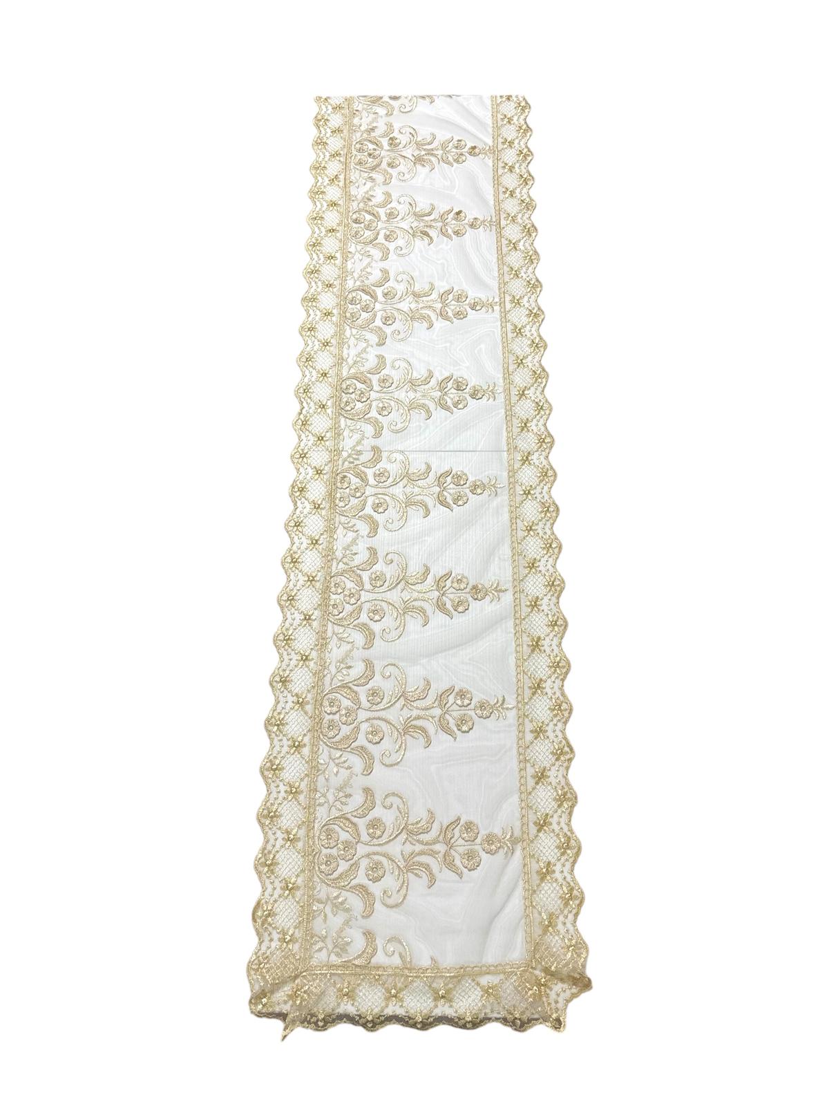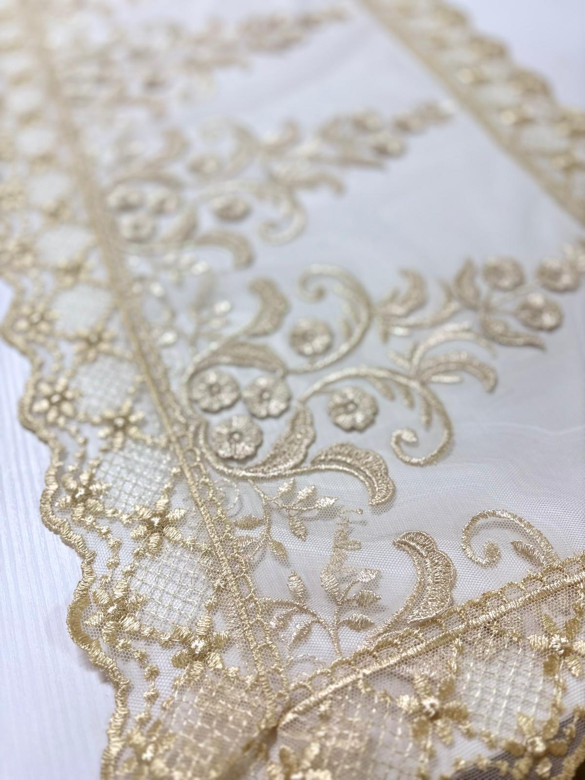 Runner in tulle crema decorato con pizzo rebrodè a rilievo crema con fiorellini. Lavorazione artigianale.