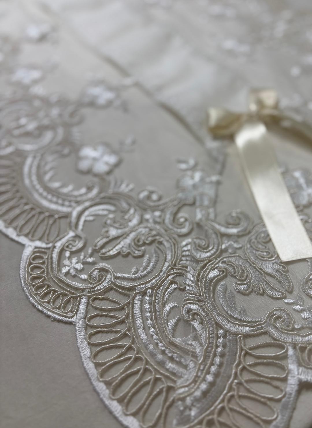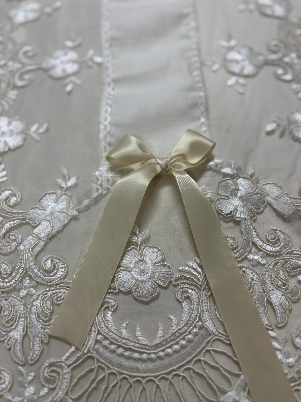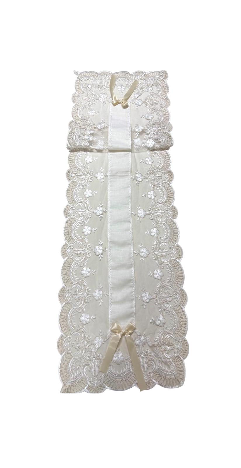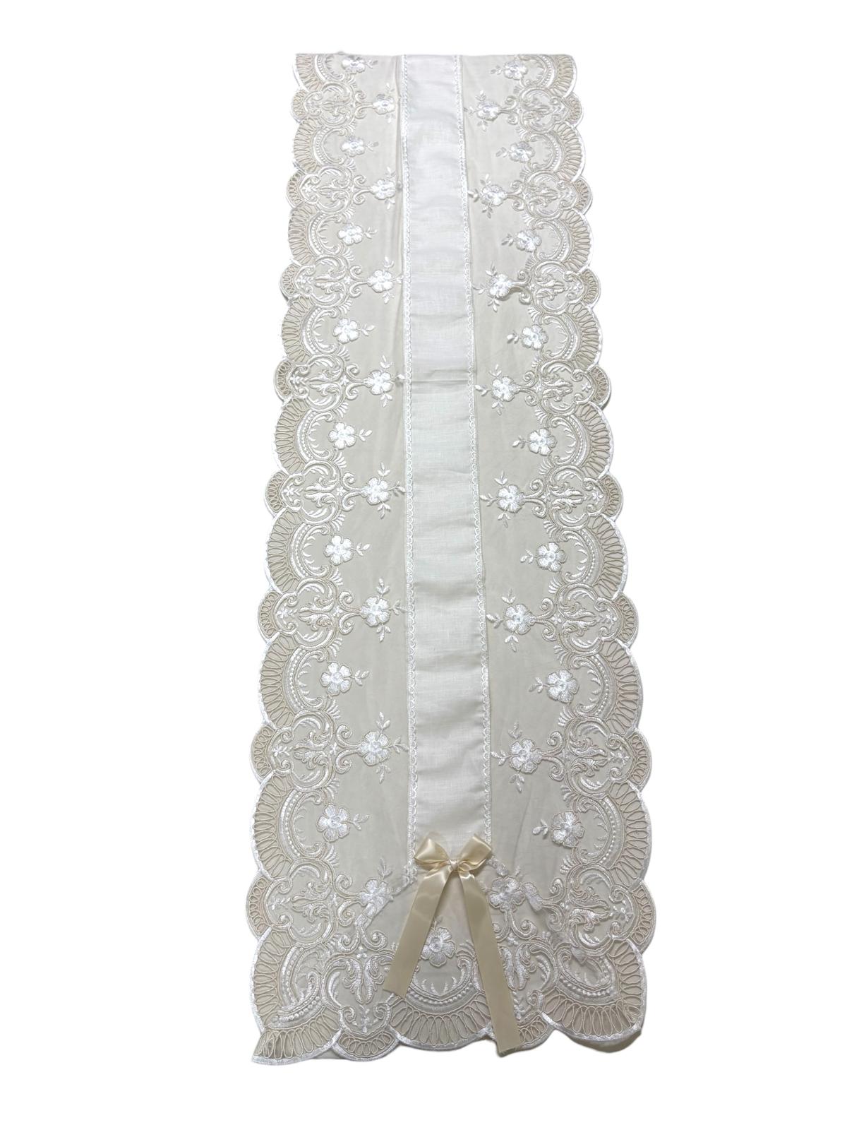 Runner in puro lino avorio decorato con fiocchi in raso avorio e con pizzo rebrodè.