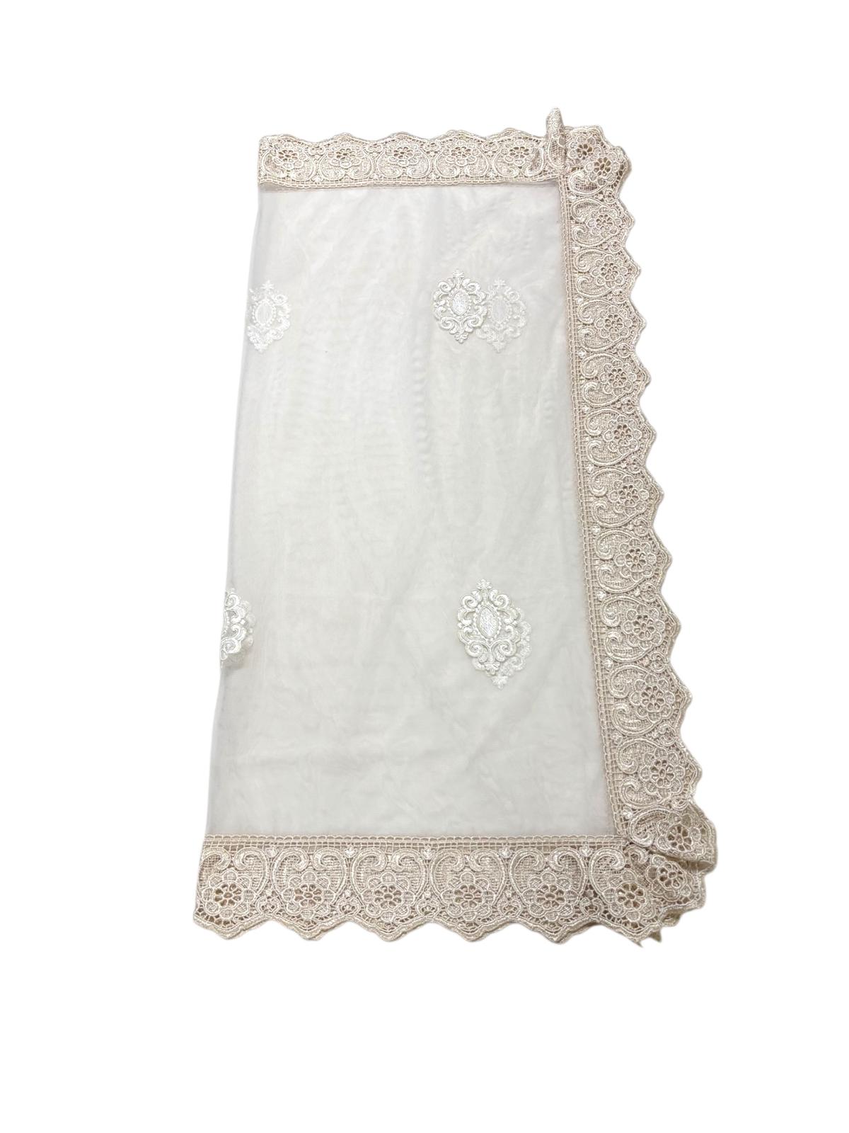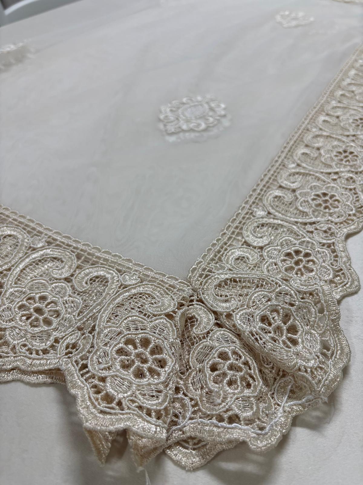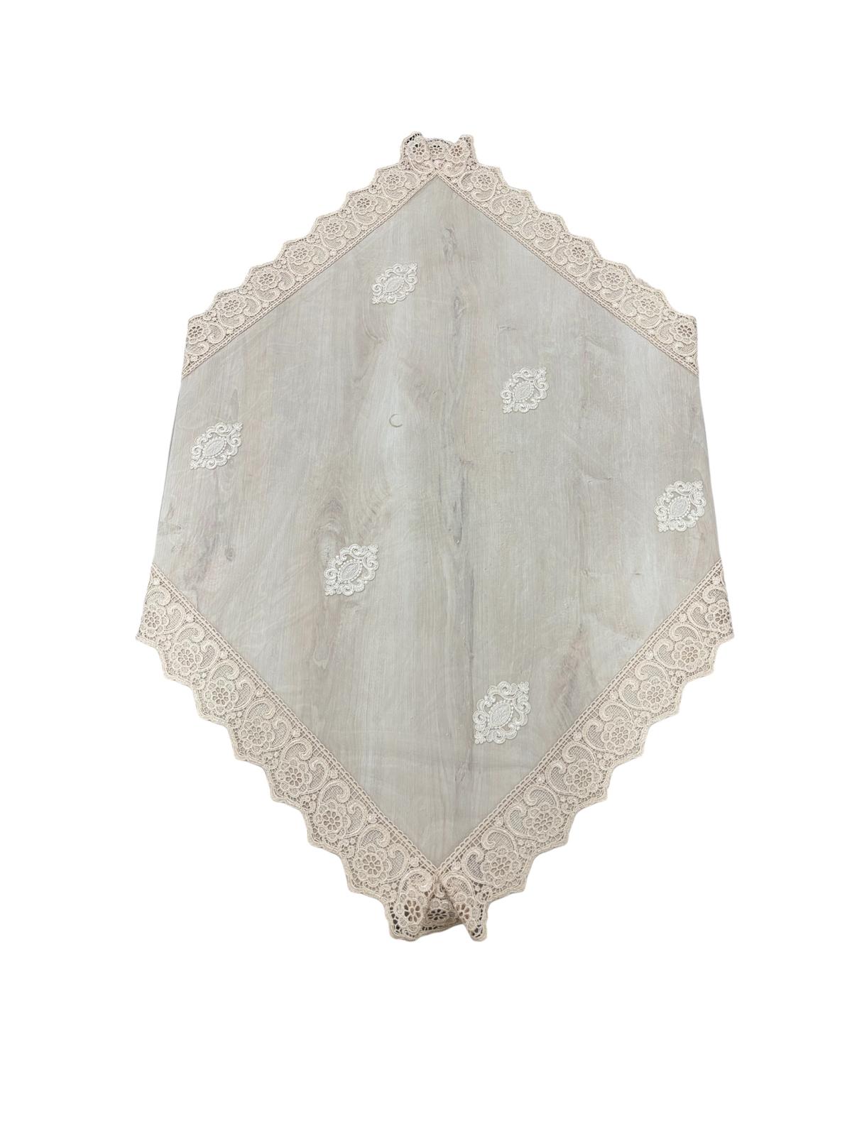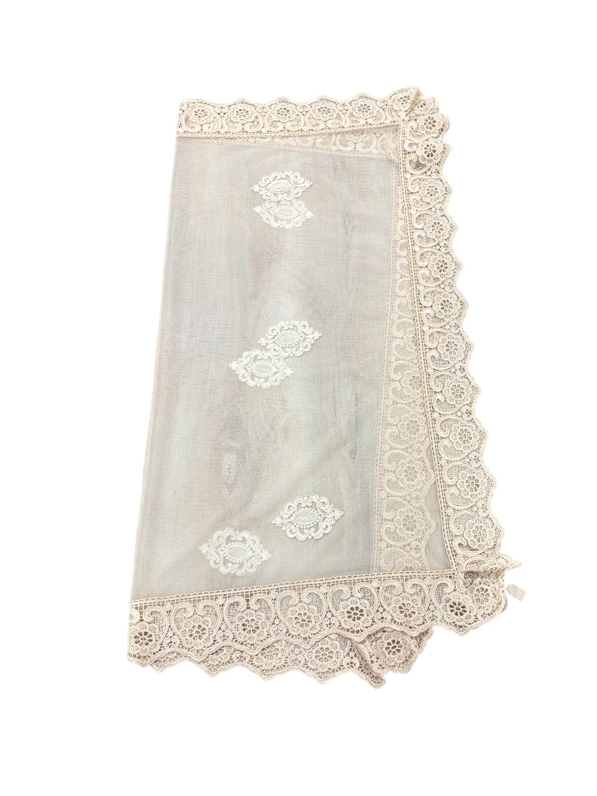 Runner quadrato in tulle decorato con pizzo tortora macramè. Lavorazione artigianale.