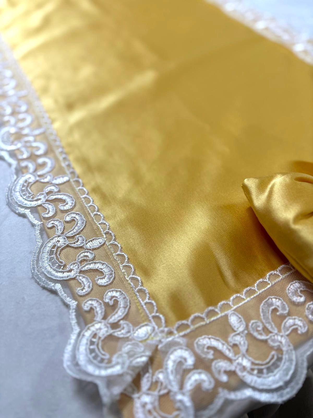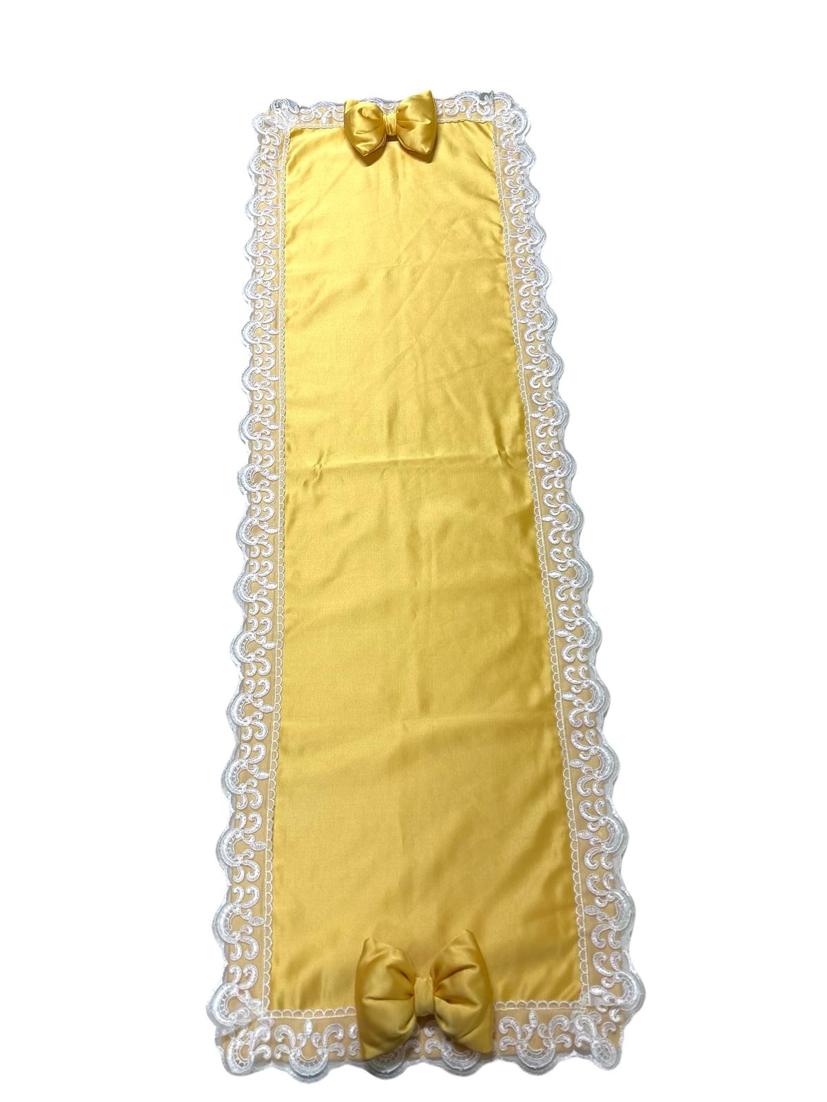 Runner in damasco in seta giallo decorato con fiocco coordinato e con pizzo macramè bianco.